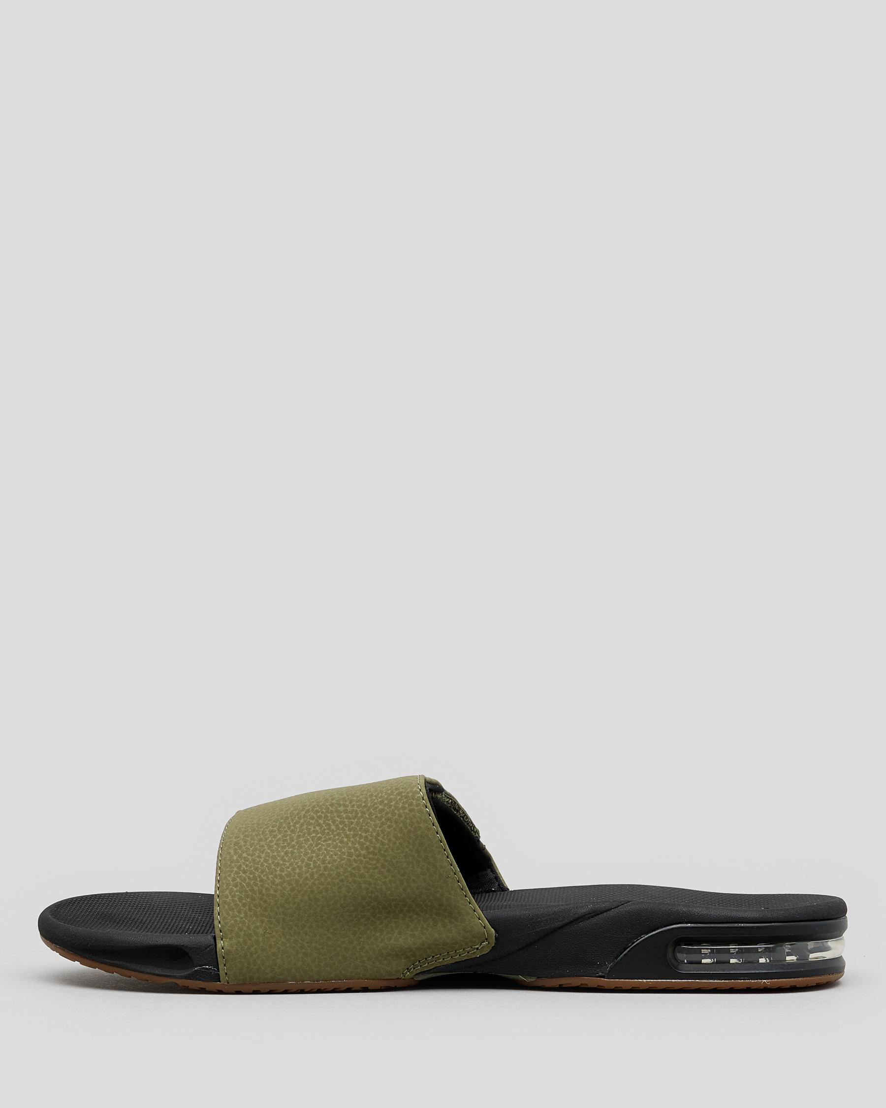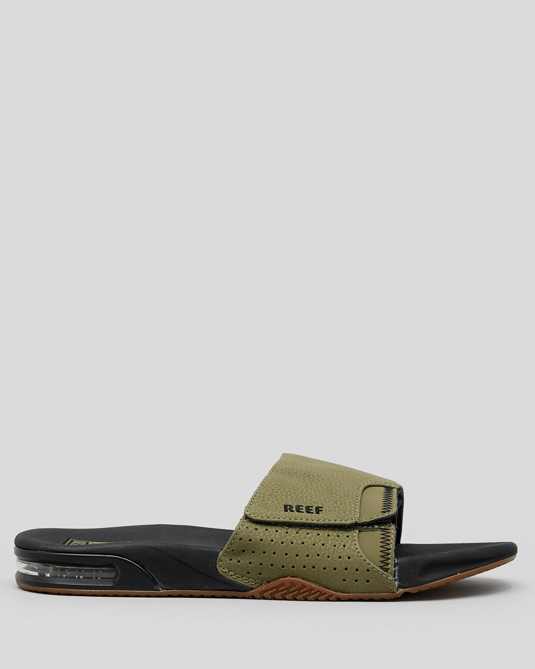 The Reef Fanning Slide in Olive is perfect for summer adventures. With a comfortable fit and stylish gum sole, these slides are a must-have for any wardrobe.