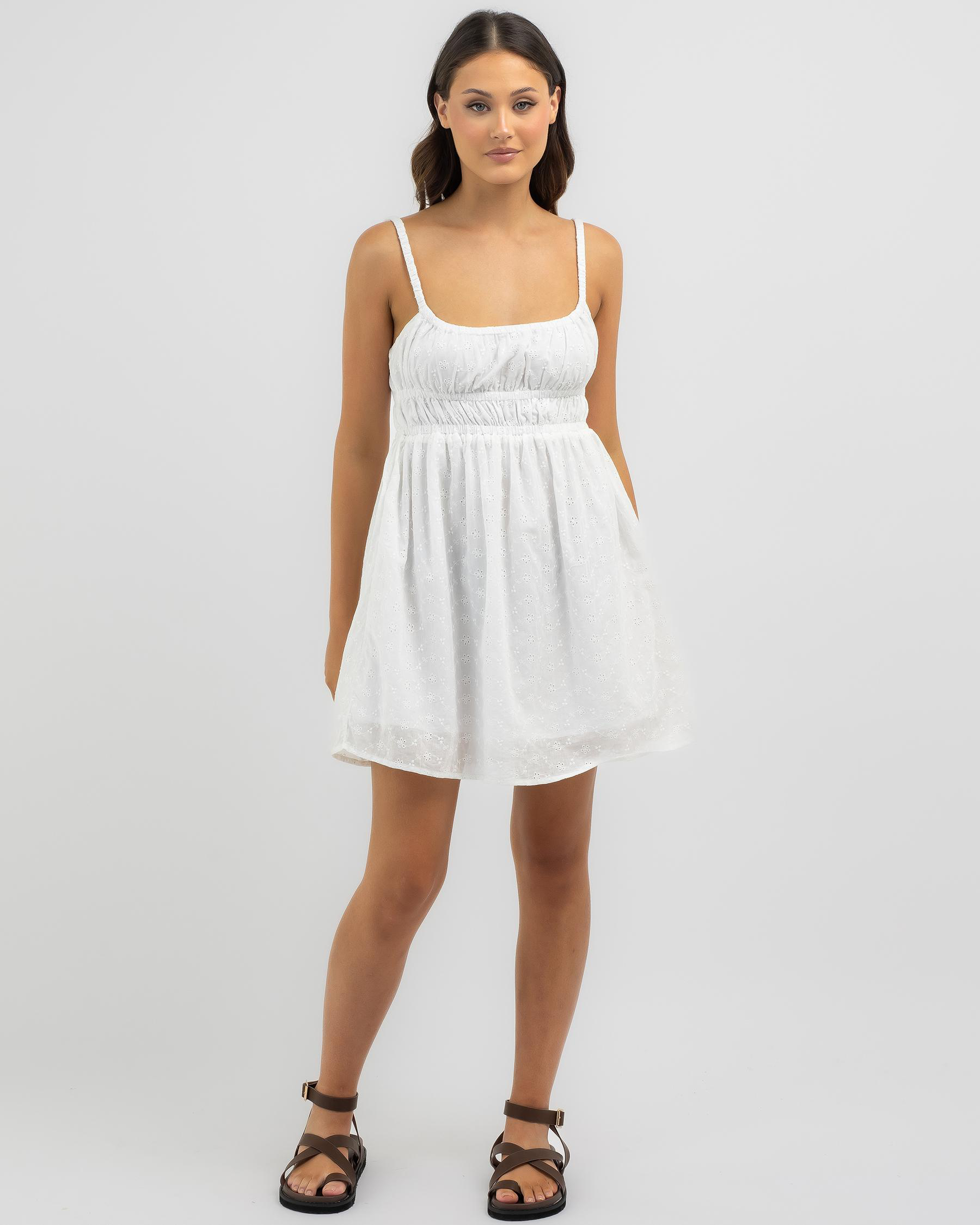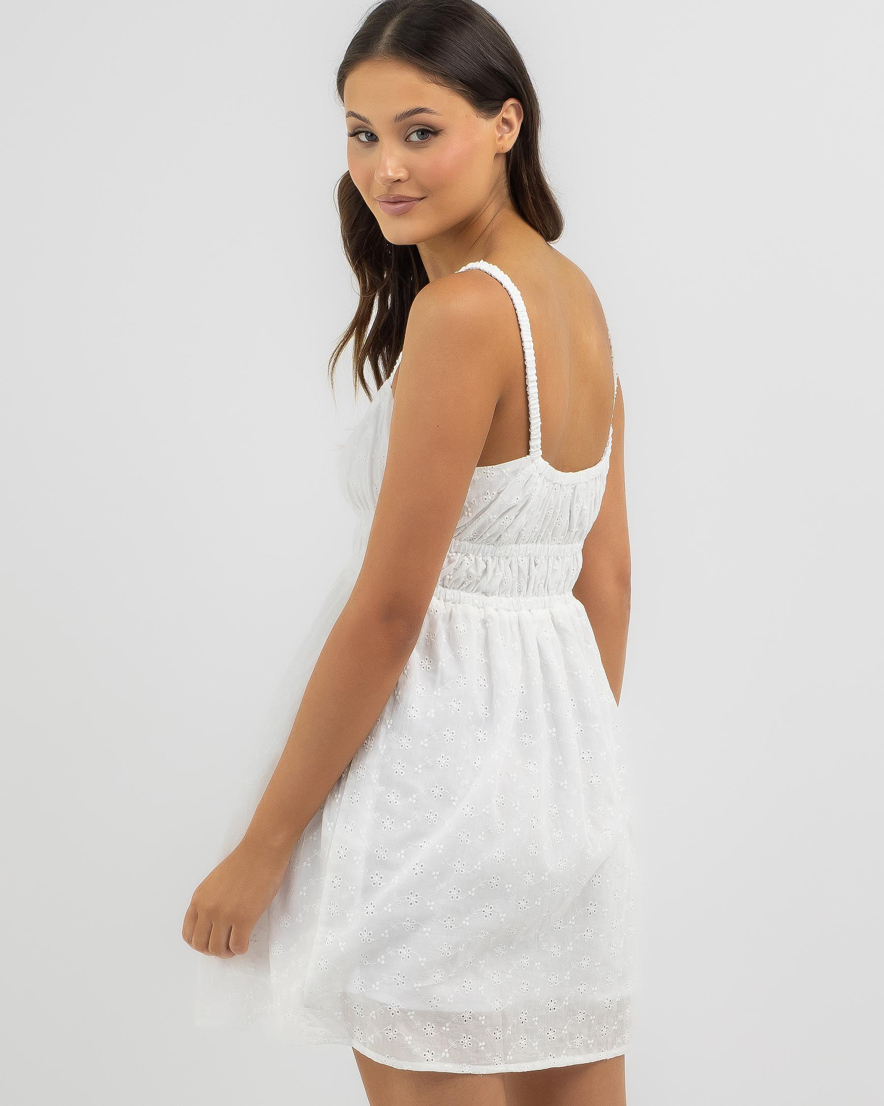 The Rhythm Fae Broderie Mini Dress in White exudes effortless elegance with its delicate embroidery detail. Perfect for a chic summer look.