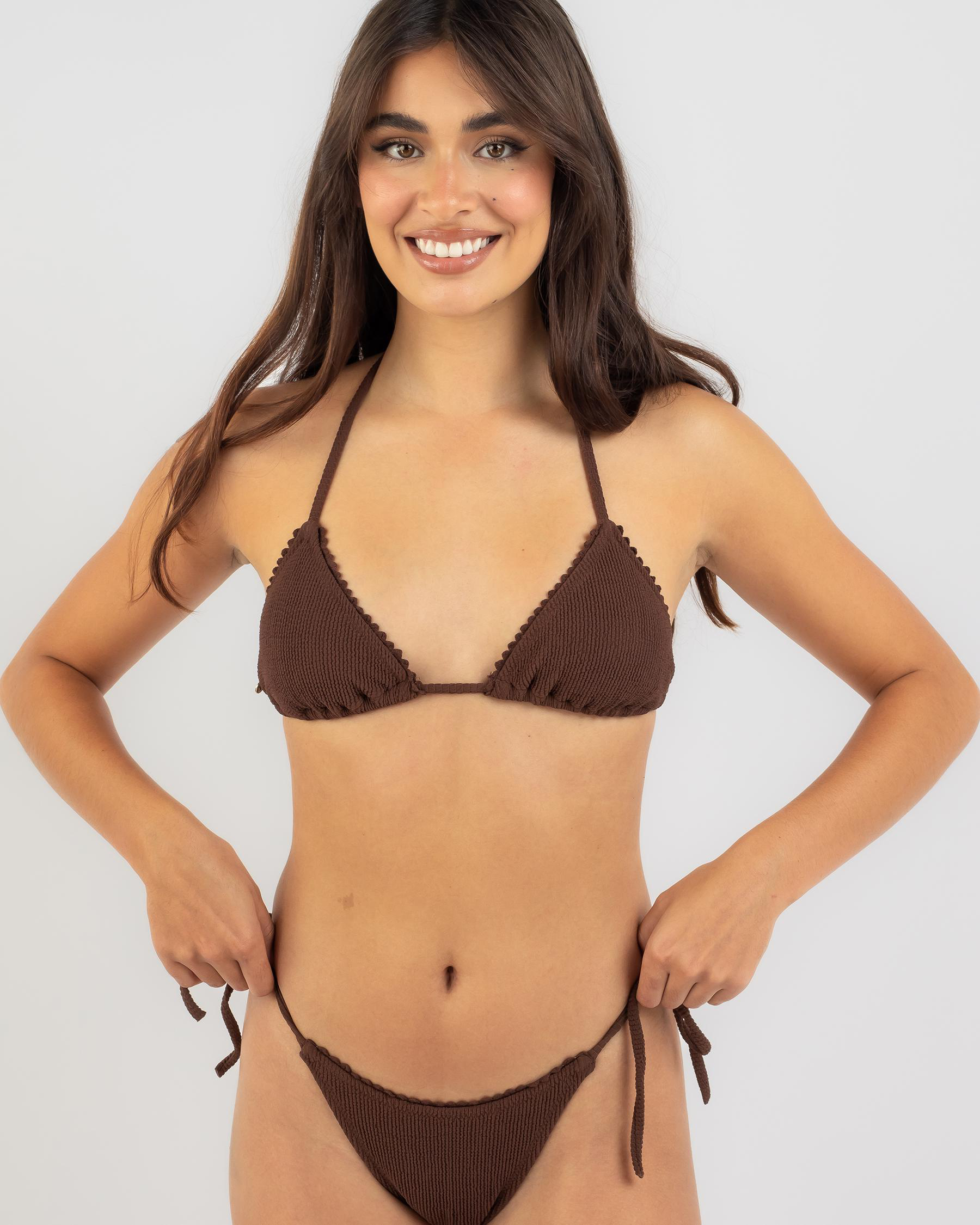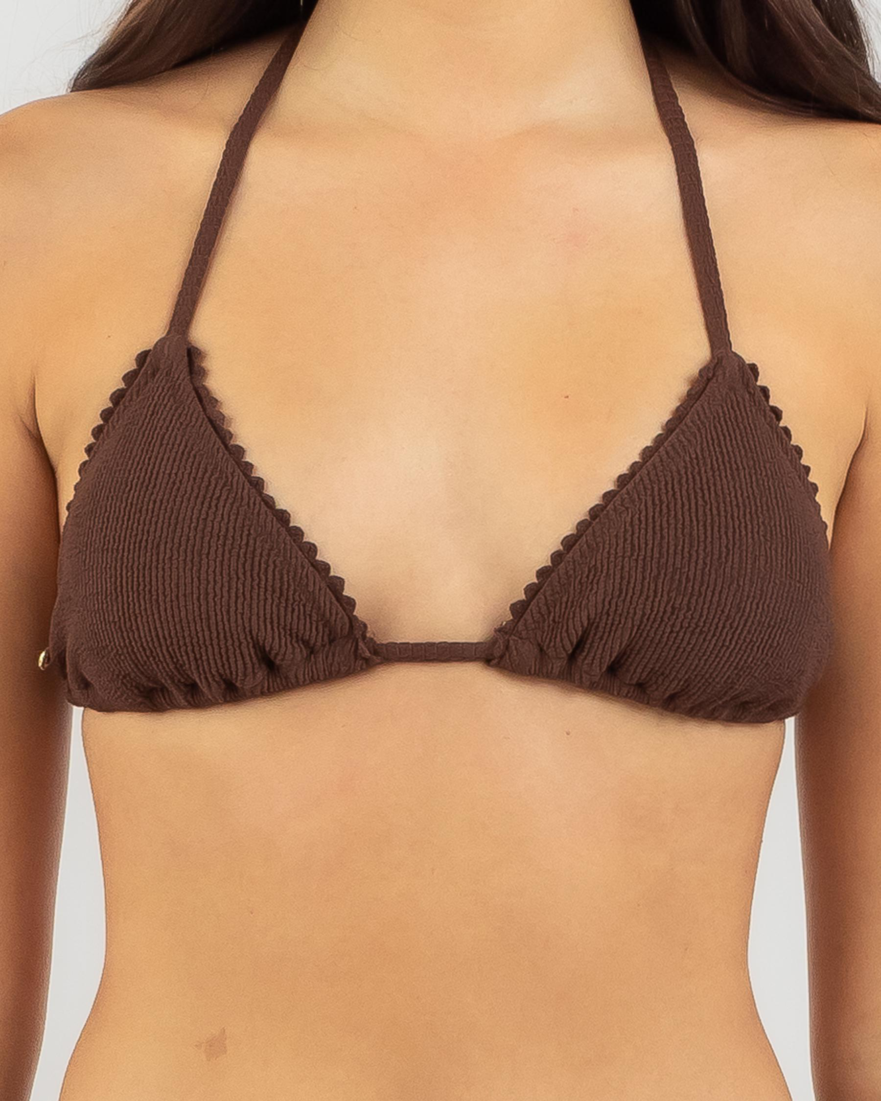 The Rhythm Isla Rib Crochet Sliding Triangle Bikini Top in Chocolate is a sultry swimwear staple for the summer season.