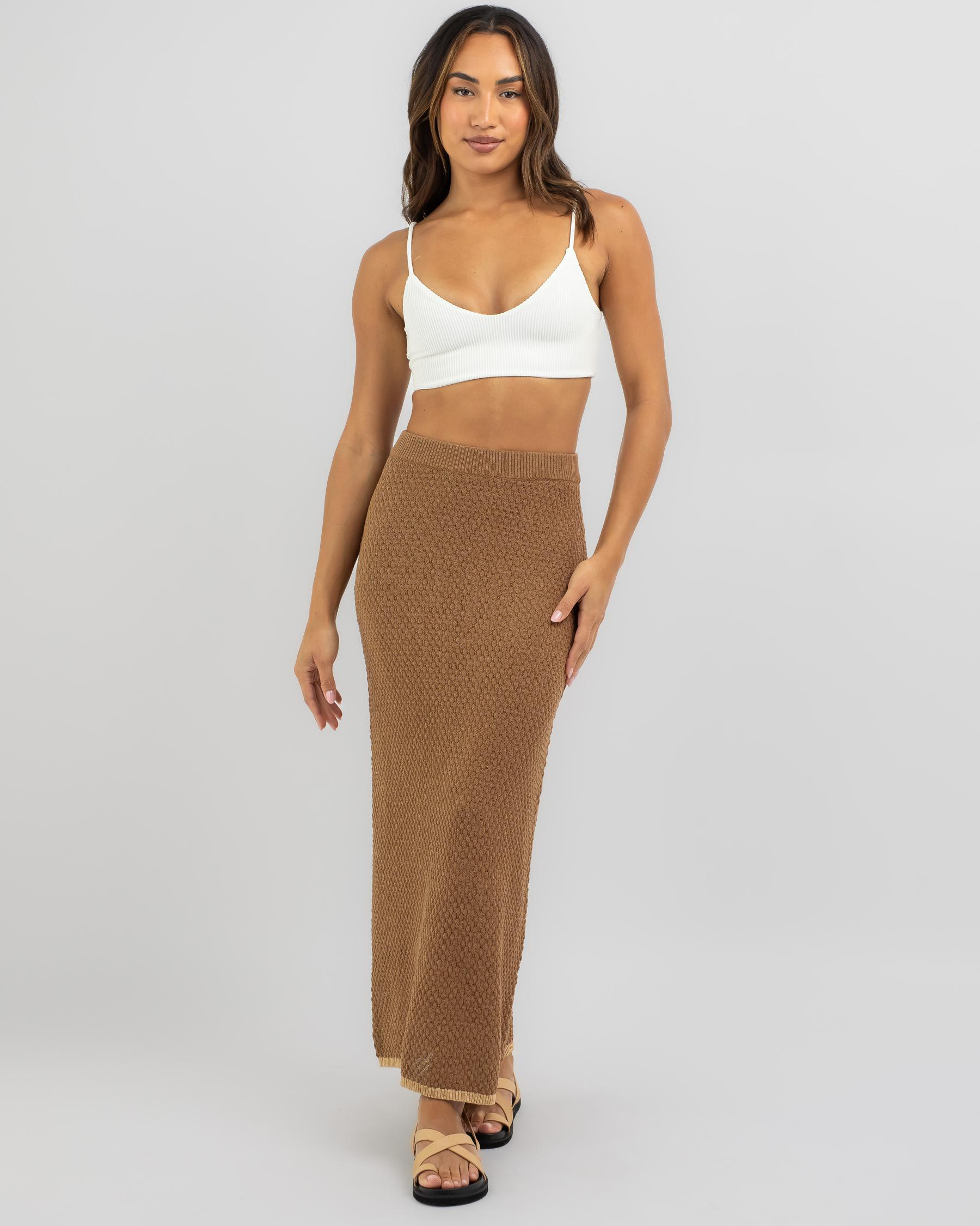 The Rhythm Joni Knit Maxi Skirt in Chocolate is a versatile wardrobe essential, perfect for effortless style and comfort.