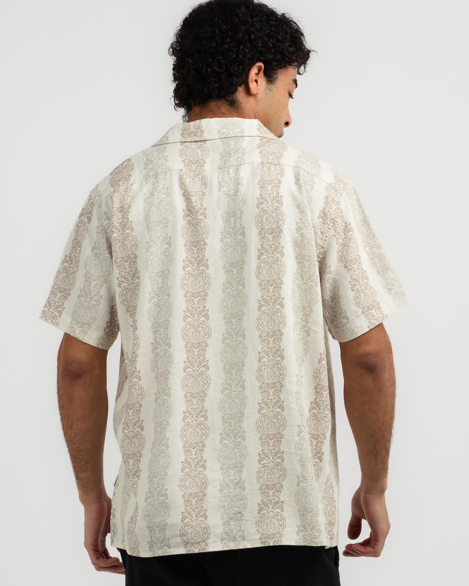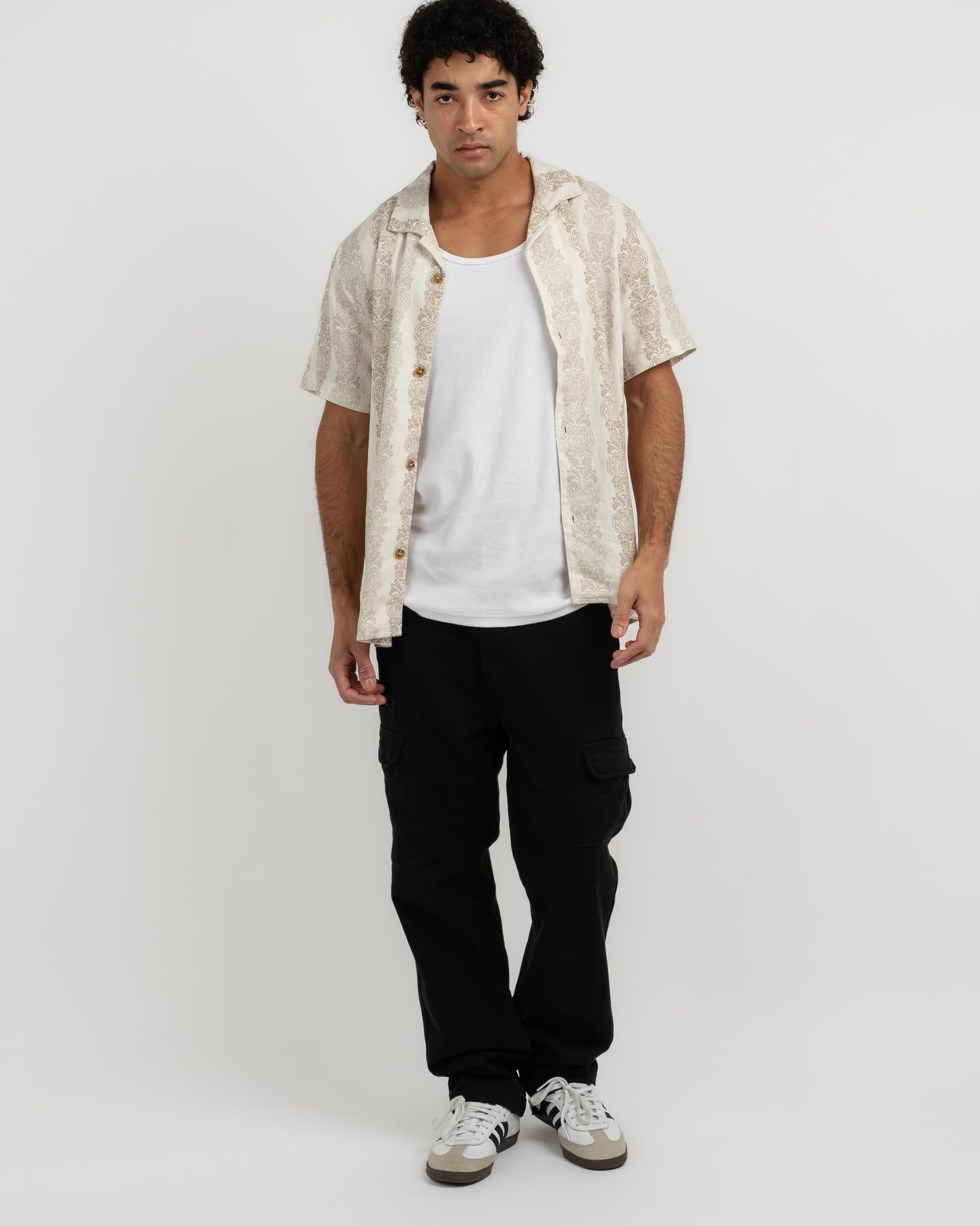 The Rhythm Pineapple Short Sleeve Shirt in Sand is a versatile addition to your wardrobe, featuring a playful pineapple print on a neutral sand background.