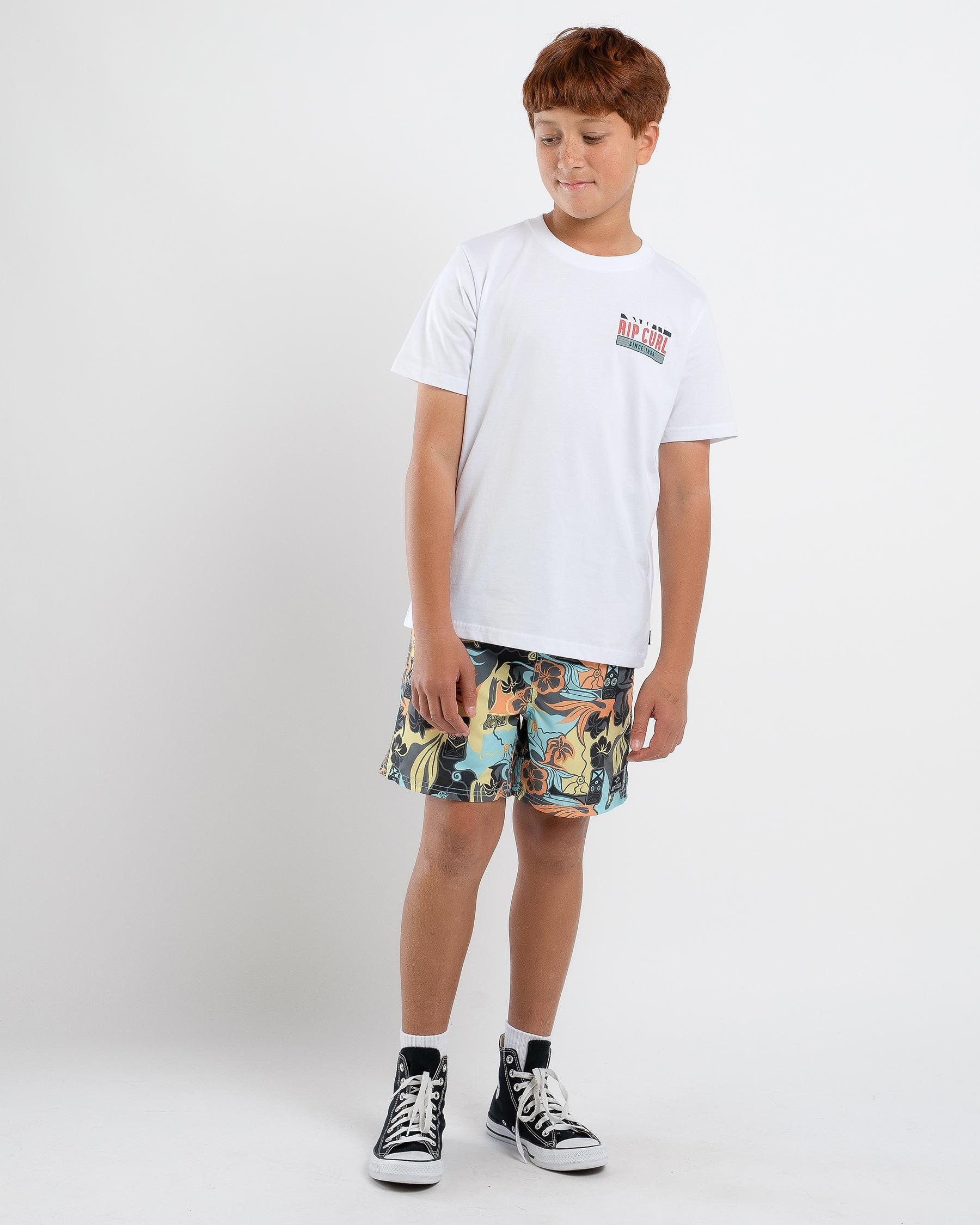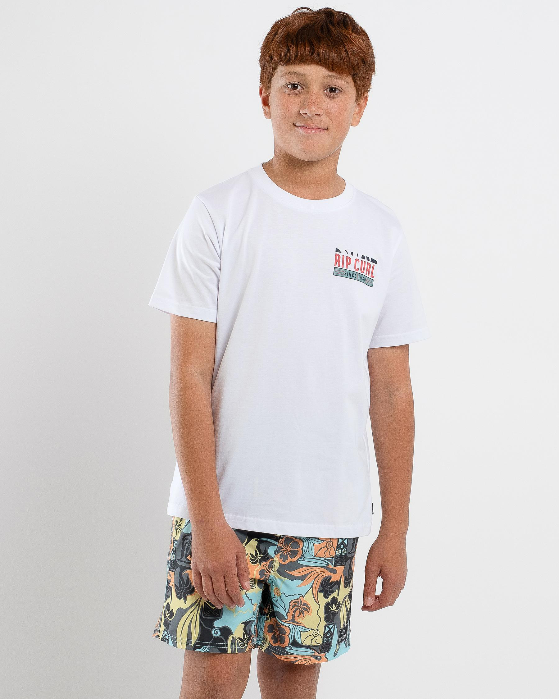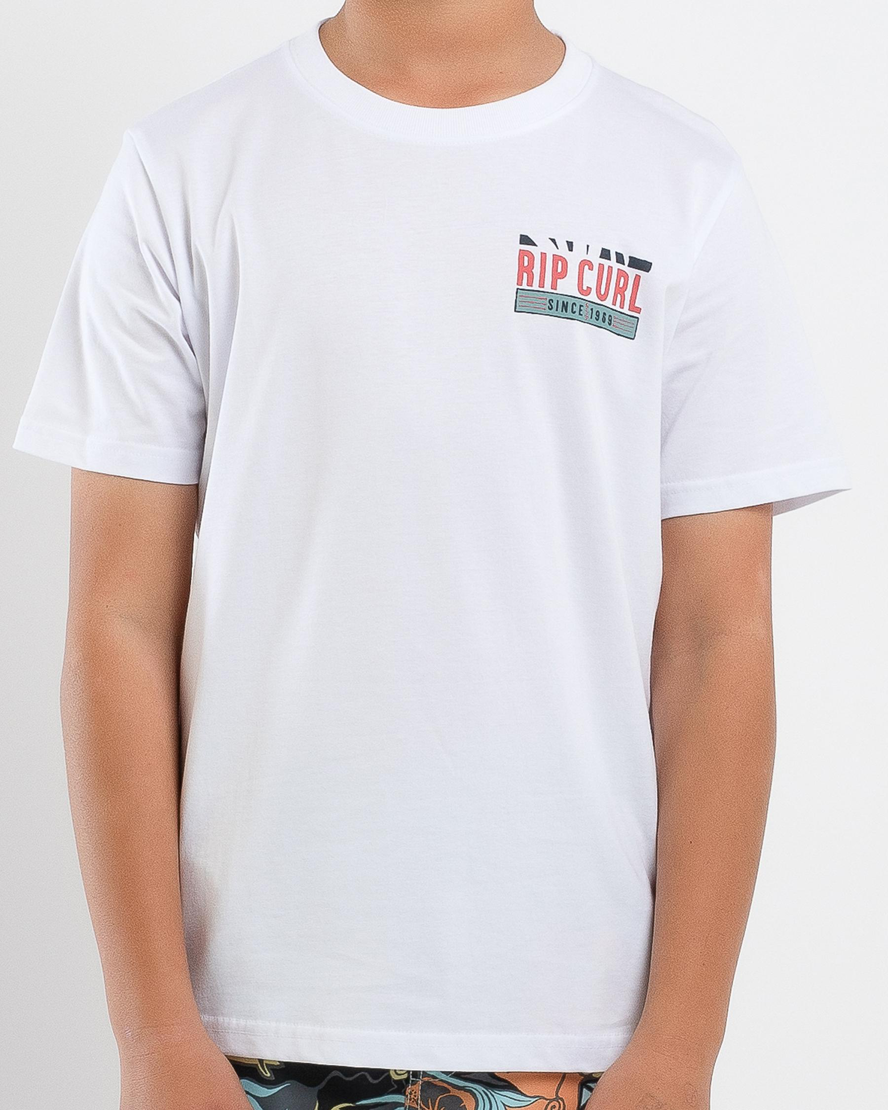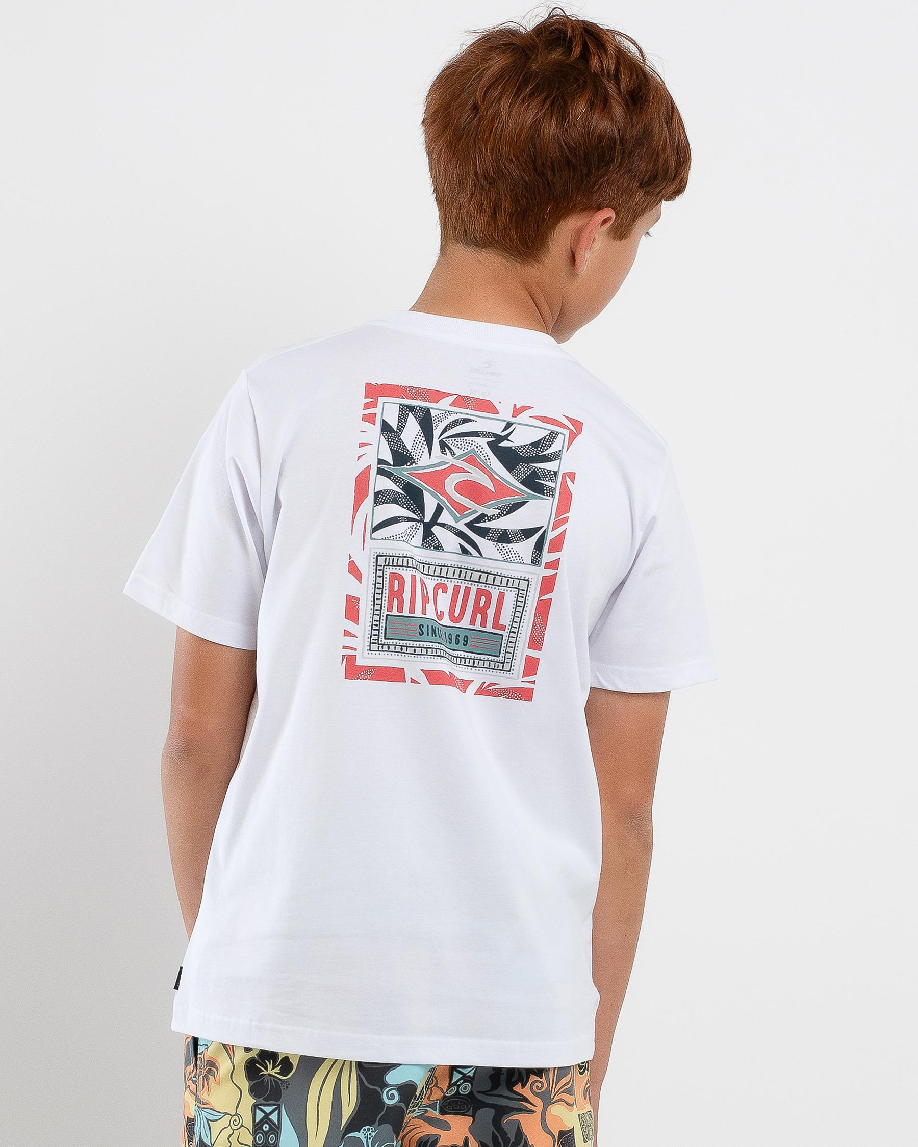 This Rip Curl Boy's Origin Palms T-Shirt in White is a stylish choice for any young trendsetter. Stay cool and comfortable in this crisp white tee.