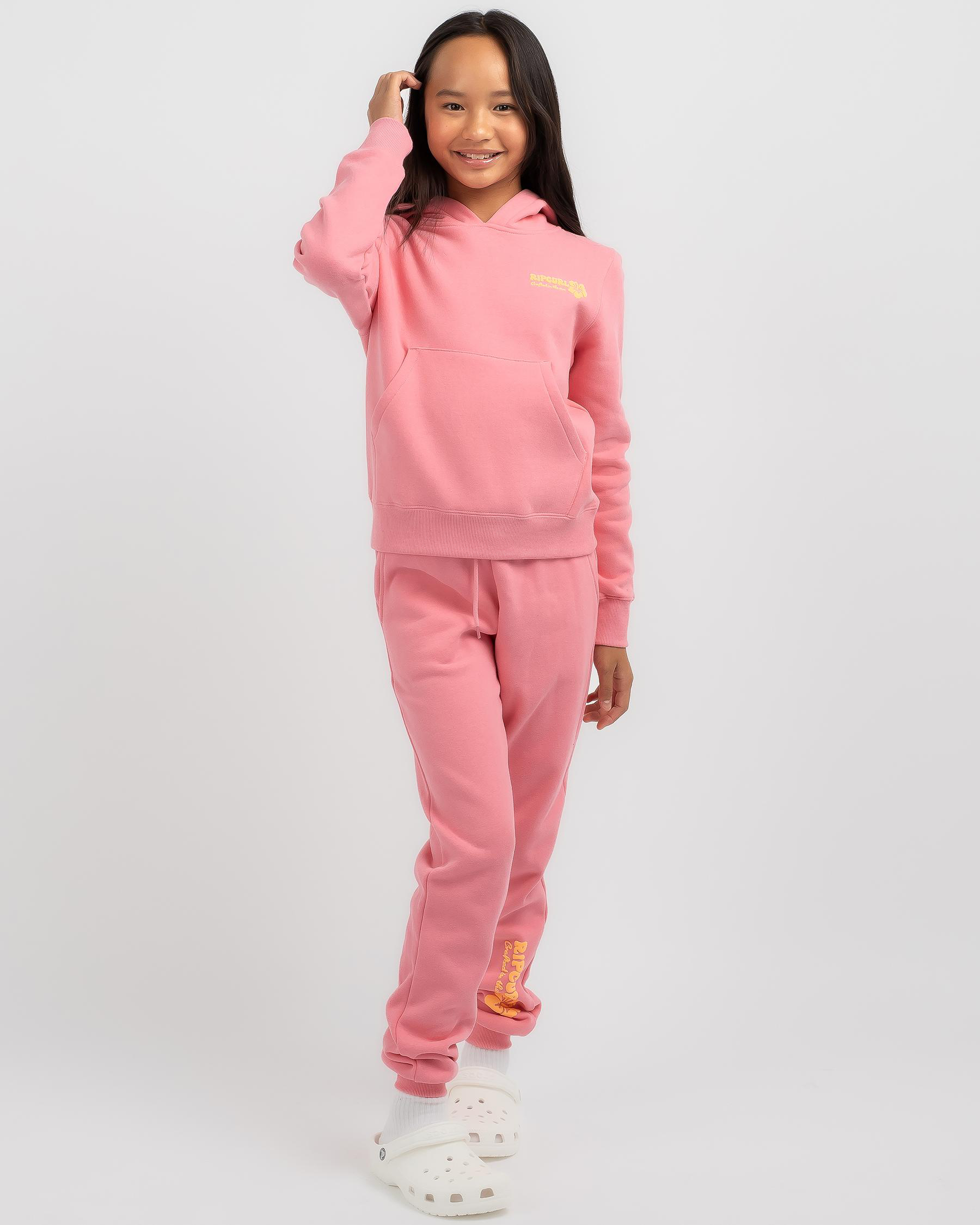 Stay stylish in the Rip Curl Girls' Hibiscus Heat Logo Hoodie in pink. This cozy hoodie with a vibrant hibiscus print is perfect for cool days.