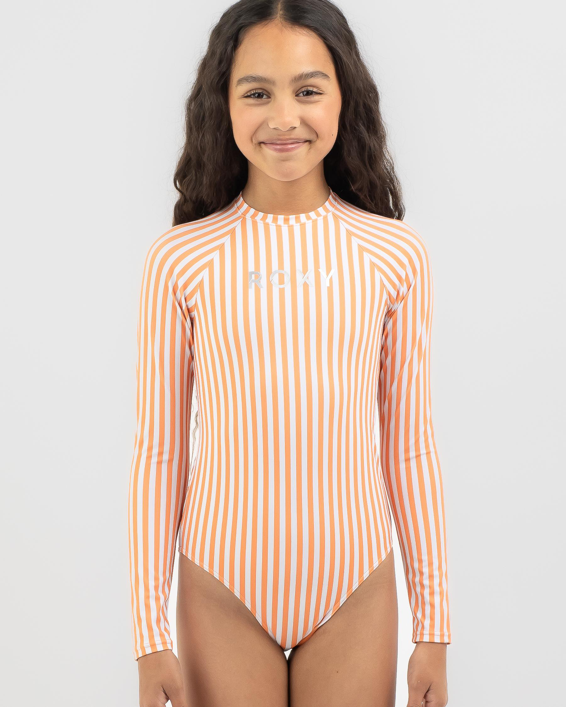 The Roxy Girls' Above The Limits Surfsuit in Tangerine is a vibrant choice for beach days, featuring a bold beach bum stripe design.