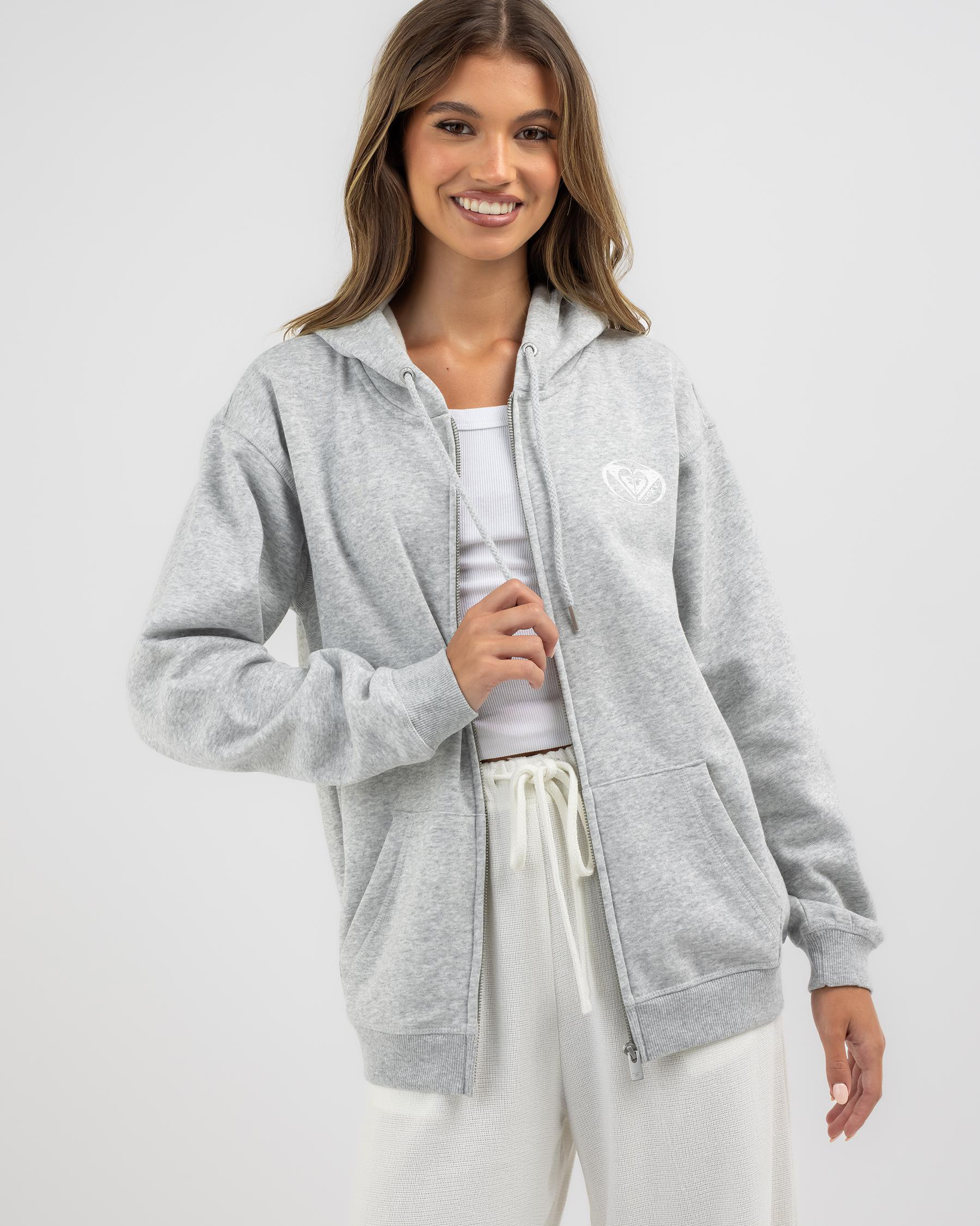 Stay cozy in the Roxy Surf Stoked Zip Through Hoodie in heritage heather. This versatile hoodie is perfect for all your casual adventures.