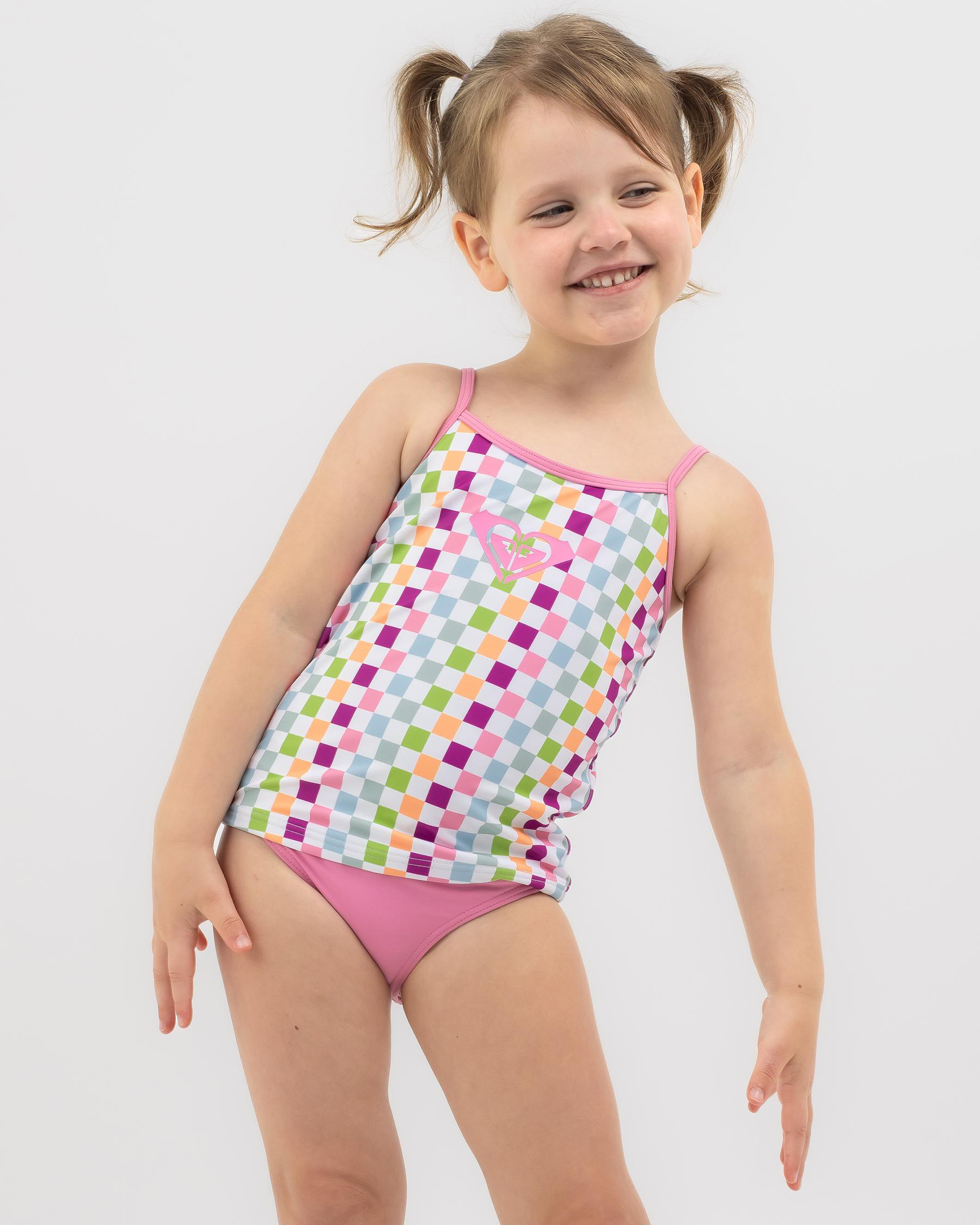 The Roxy Toddlers' Rainbow Check Tankini Set features a bright white check design that is perfect for little ones to splash around in style.