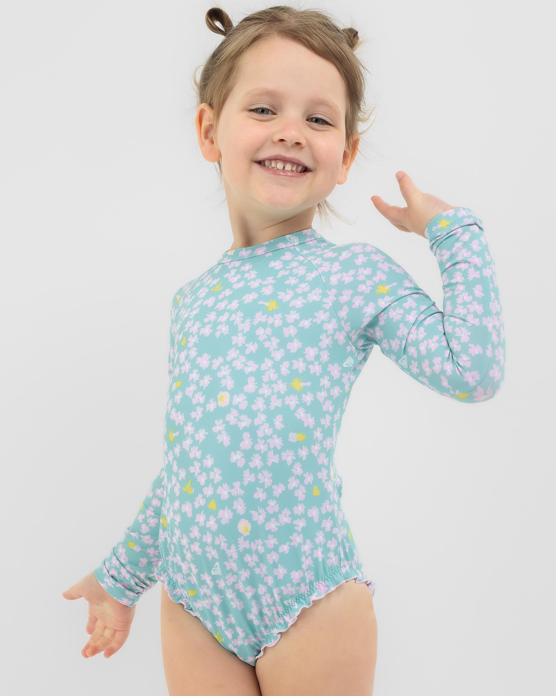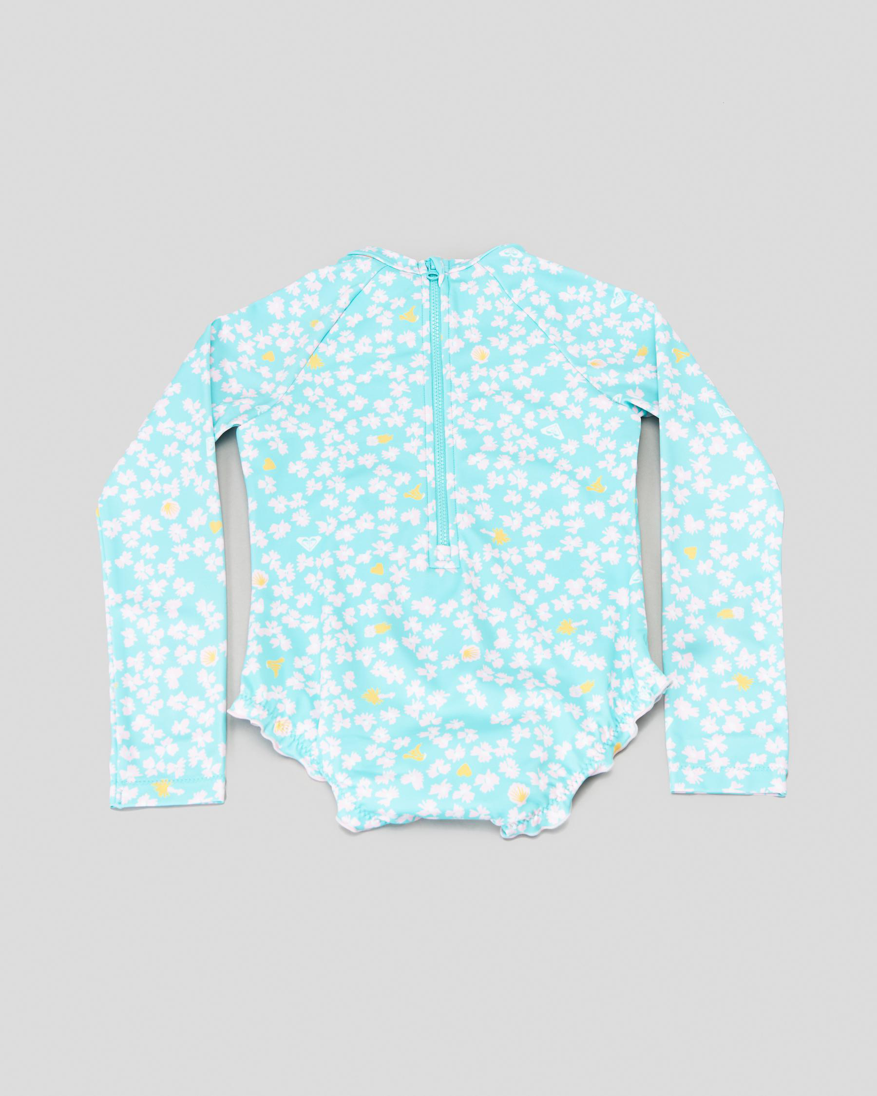 The Roxy Toddlers' Teenie Ditsy Long Sleeve Surfsuit in Aruba Blue features a cute ditsy print, ideal for little ones ready to hit the waves.