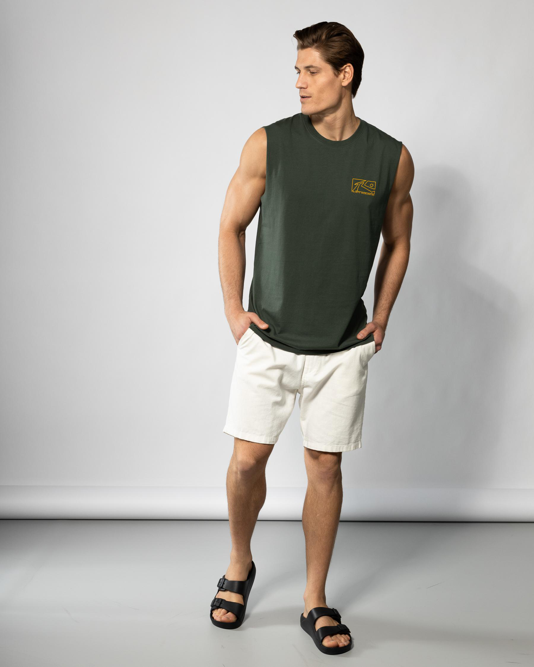 The Rusty Boxed Out Muscle Tank in Shadow Army offers a sleek, edgy look with its singular army green hue.