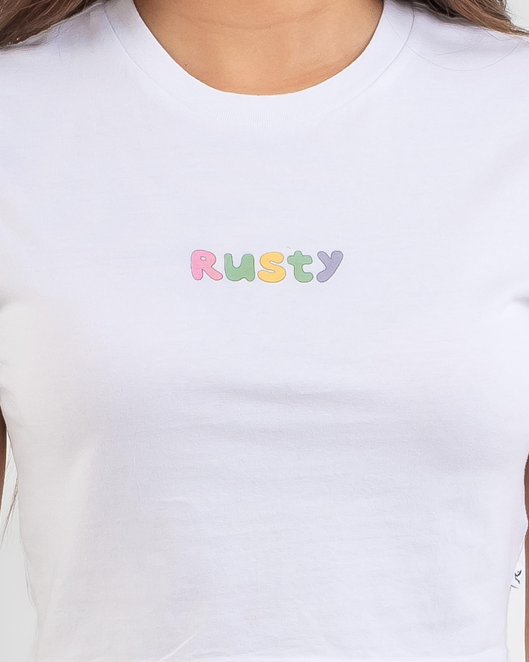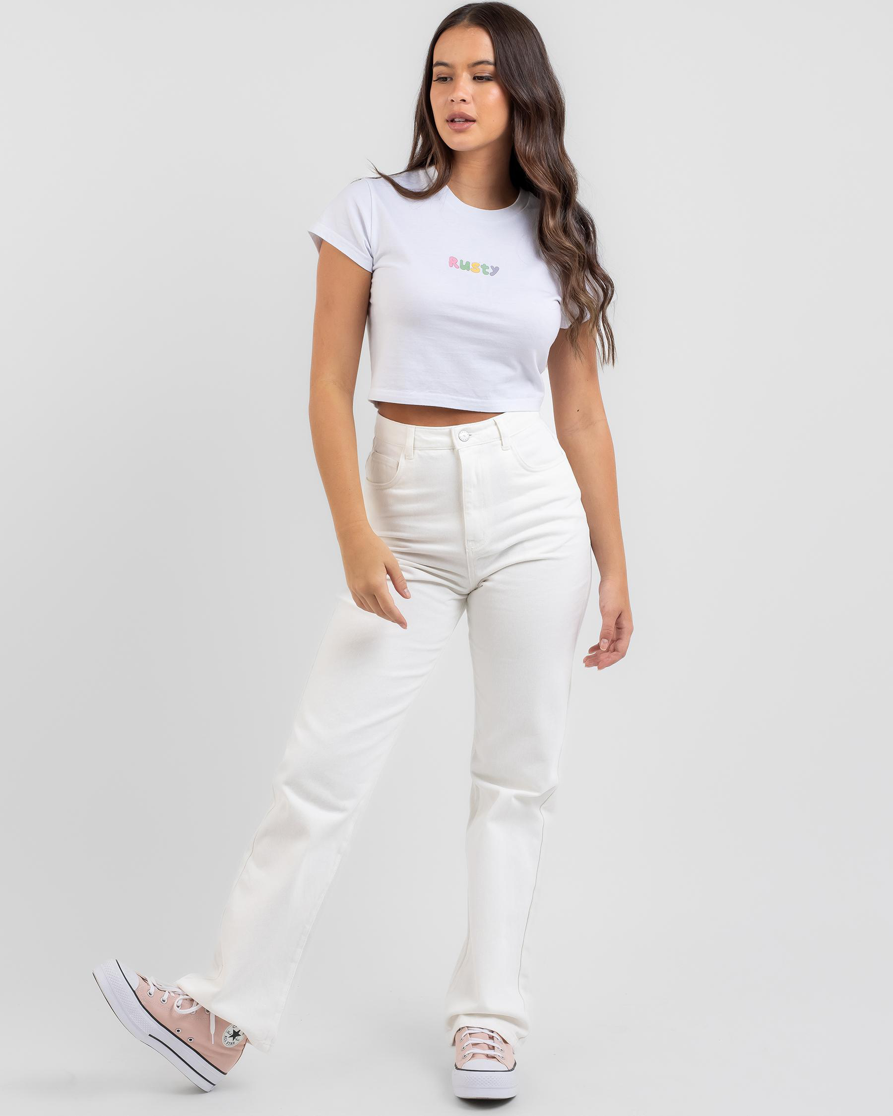 The Rusty Poppy Baby Tee in crisp white is a versatile wardrobe staple, perfect for mixing and matching with any outfit.