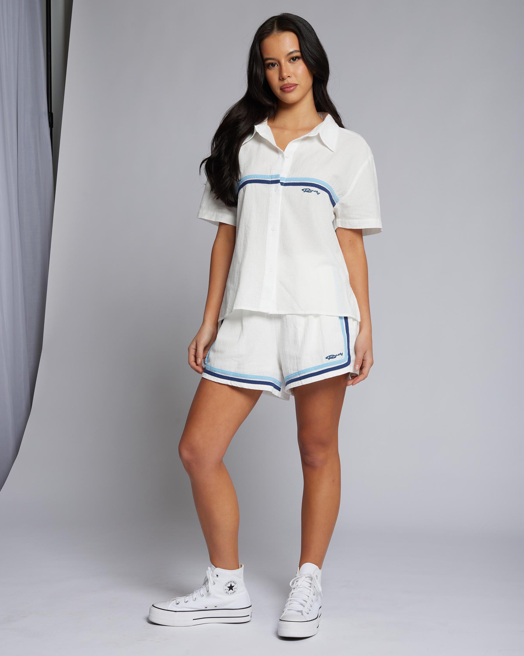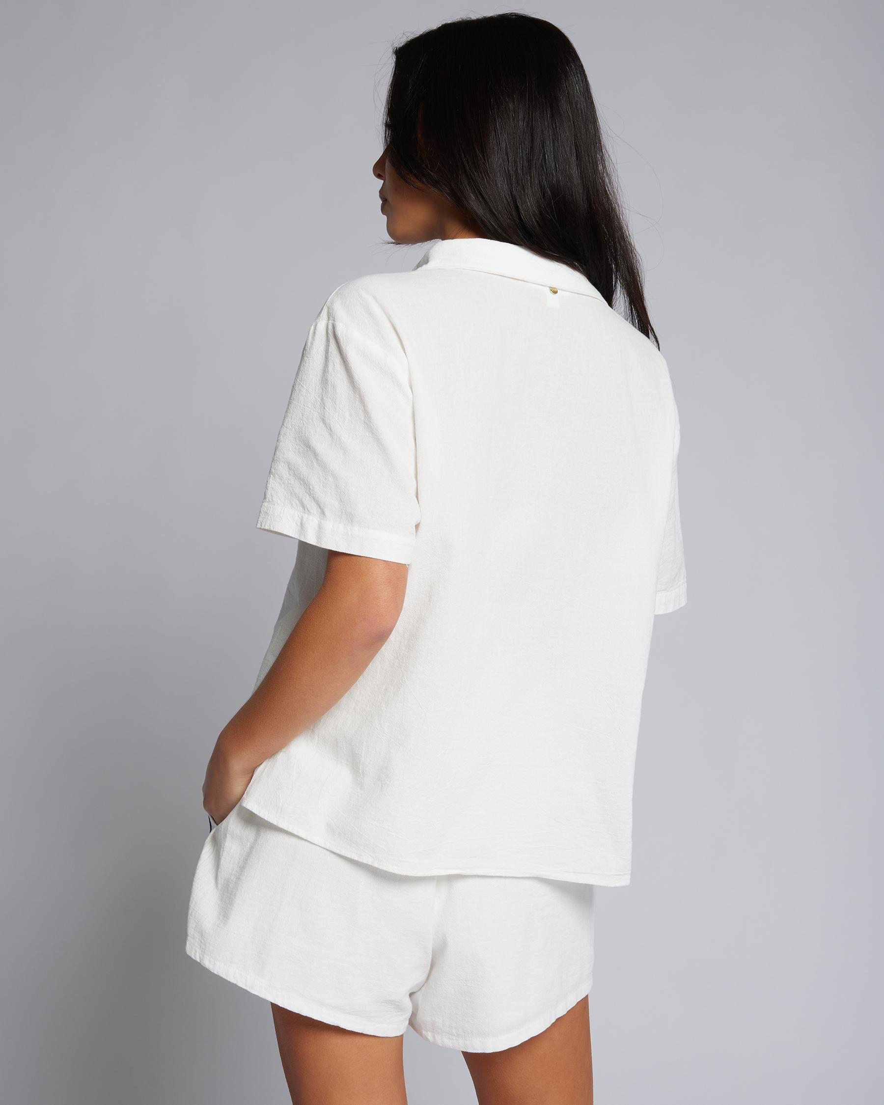 The Rusty Zanzibar Contrast Beach Shirt in Snow features a crisp white hue, perfect for a cool and stylish beach look.