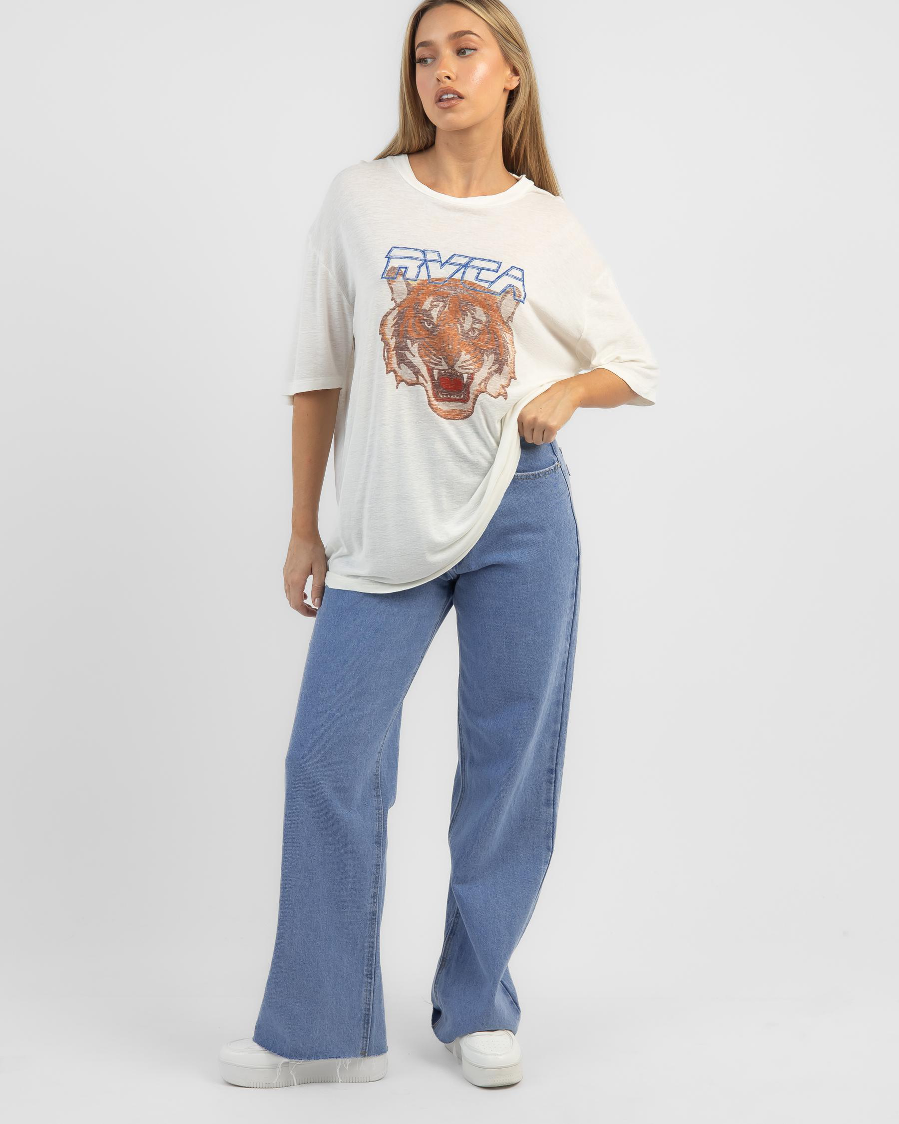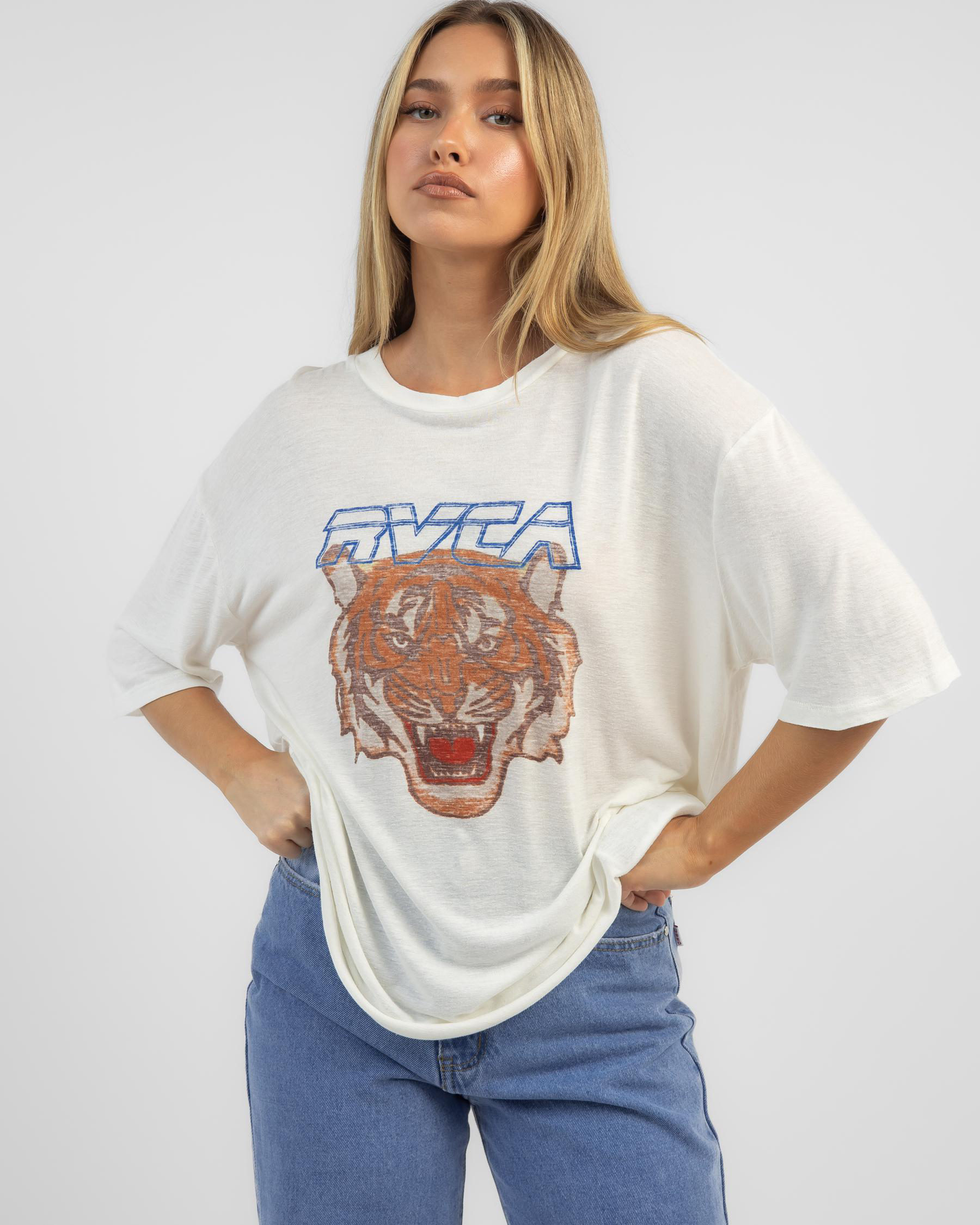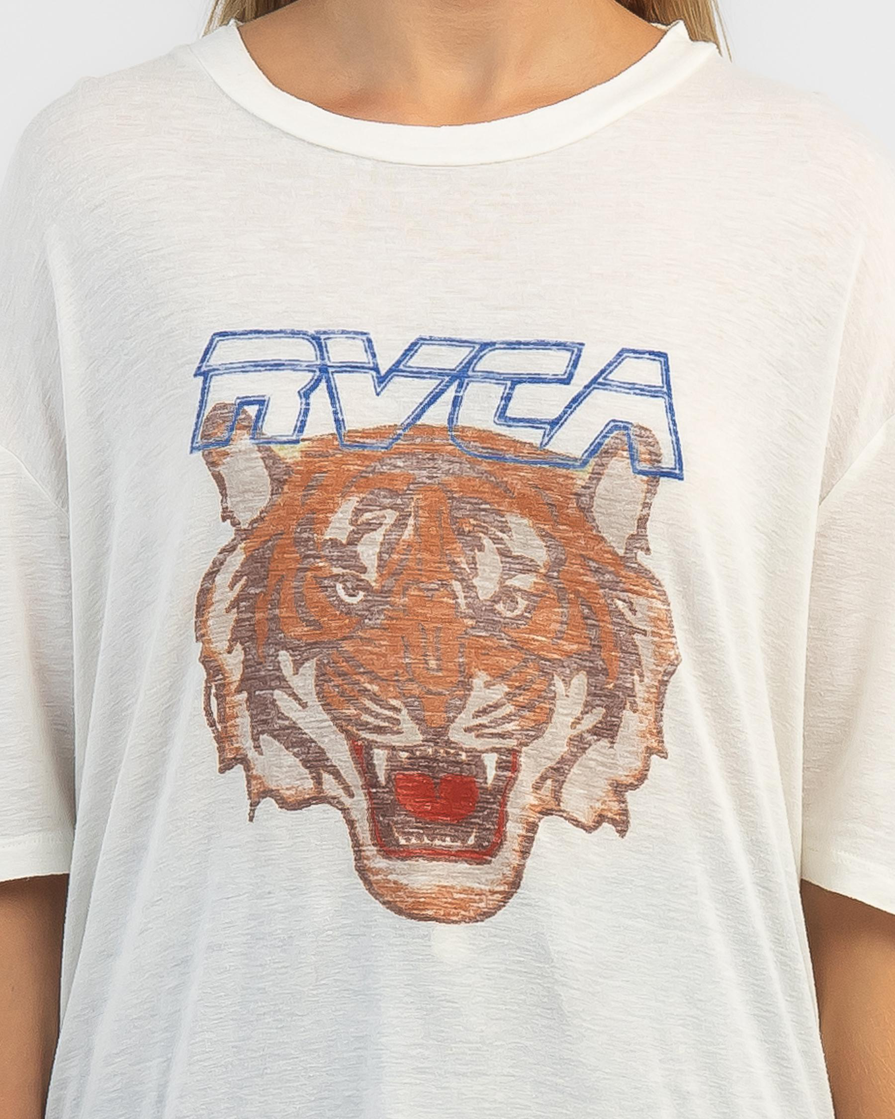 The RVCA Jungle Cat Rummage T-Shirt in Salt is a sleek and versatile tee in a crisp white hue, perfect for everyday wear.