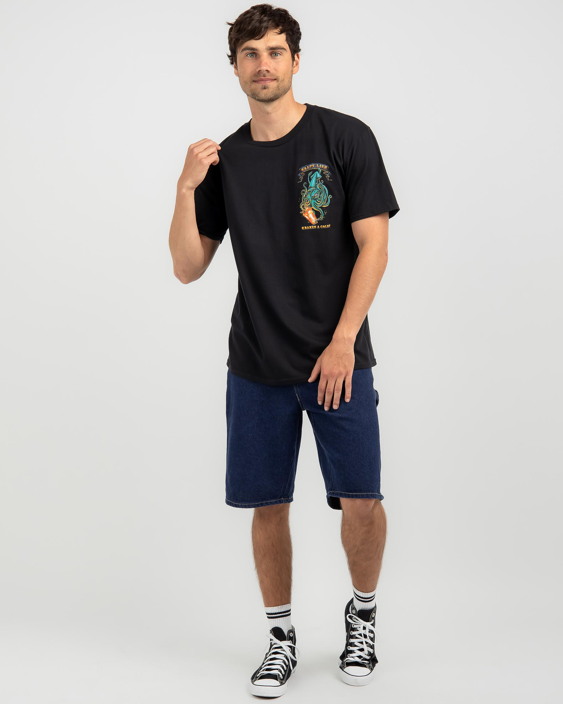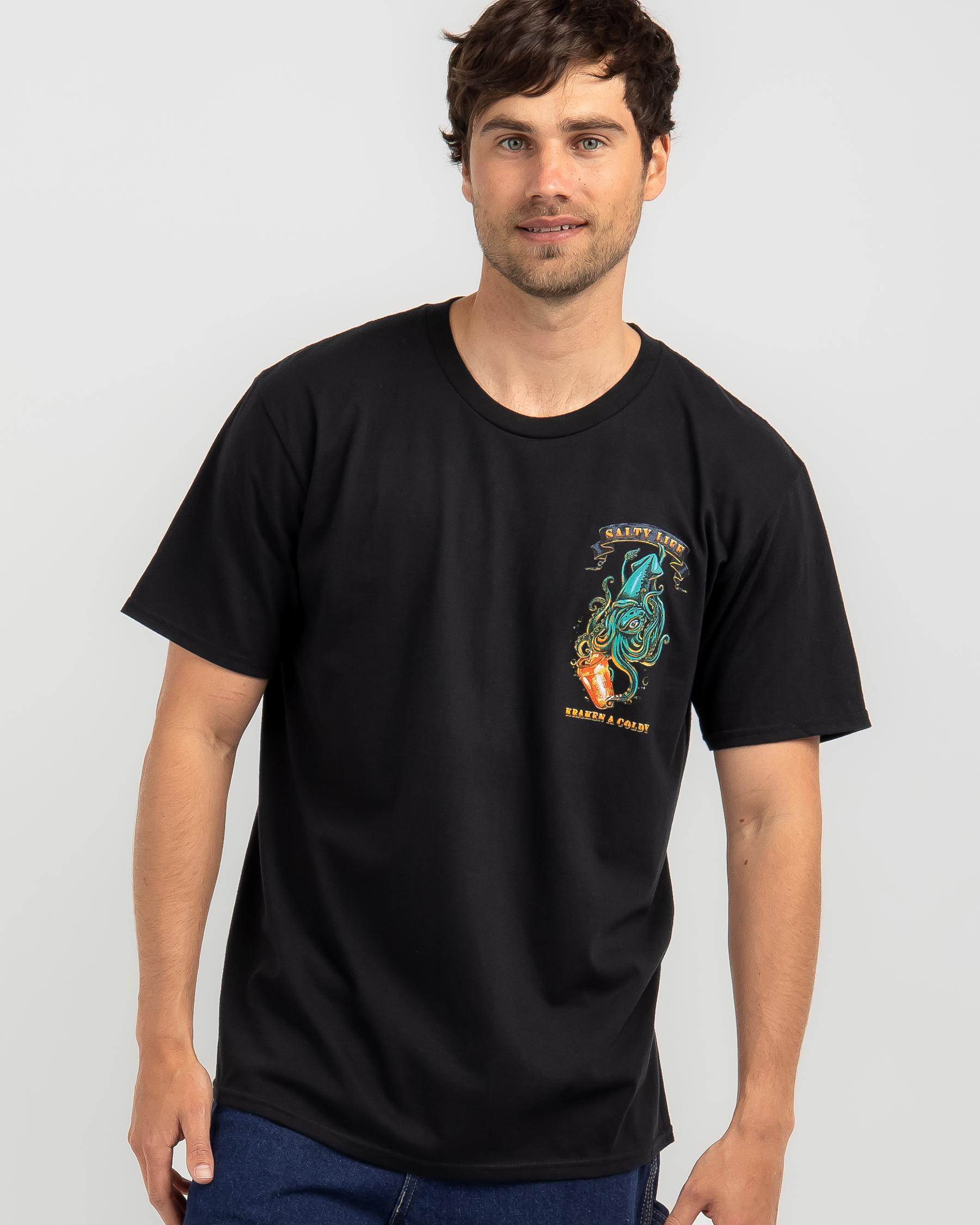 Show off your edgy side with the Salty Life Kraken T-Shirt in black. This dark and mysterious design is perfect for adding a touch of intrigue to your wardrobe.