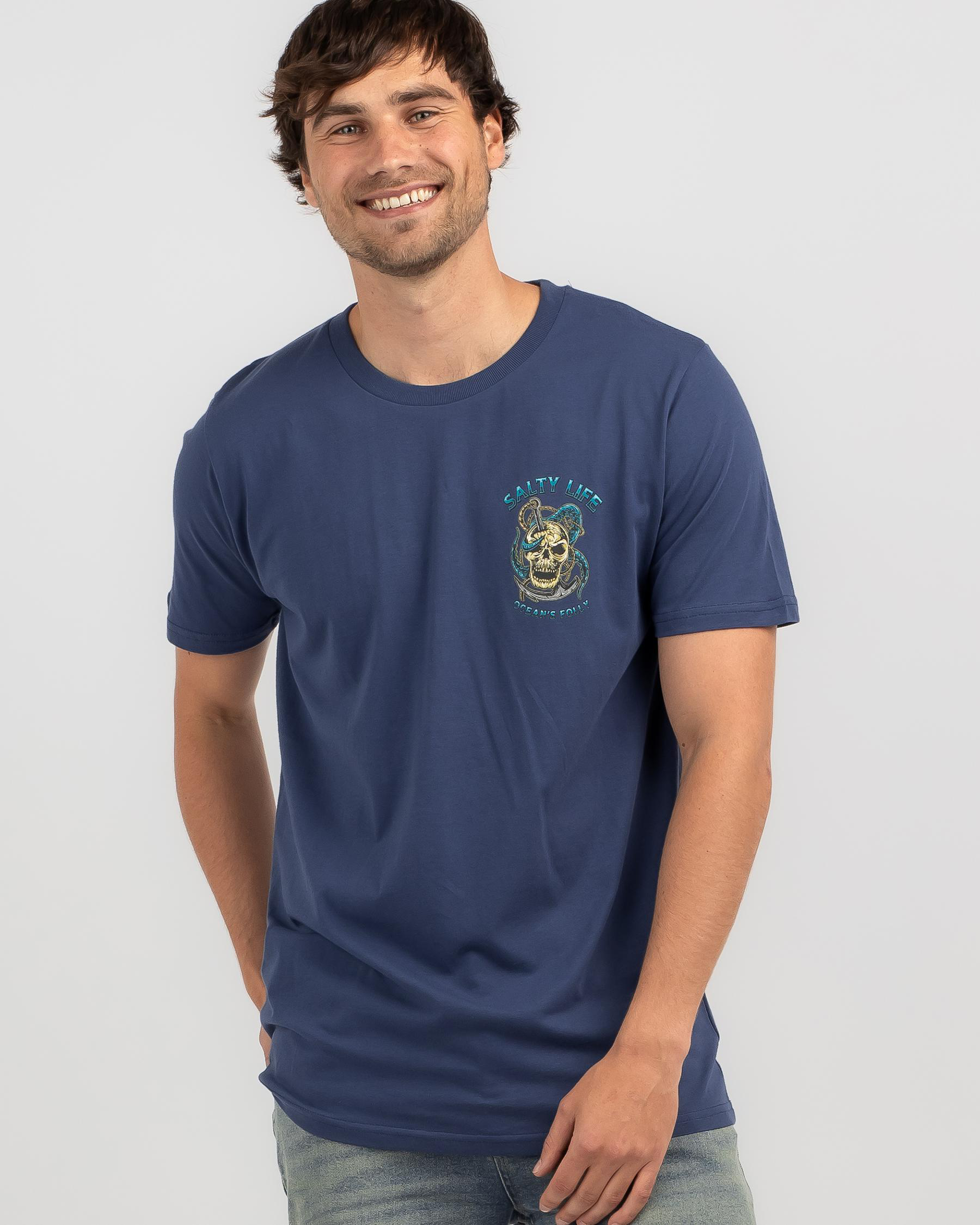 Lounge in style with the Salty Life Oceans T-Shirt in Slate Blue. The soft, comfortable fabric and unique design make it a must-have for any beach lover.