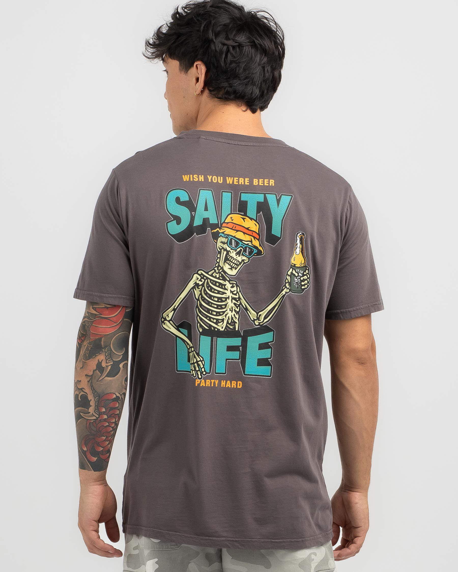 The Salty Life Party Hard T-Shirt in Washed Charcoal is a stylish and versatile wardrobe essential for any social occasion.