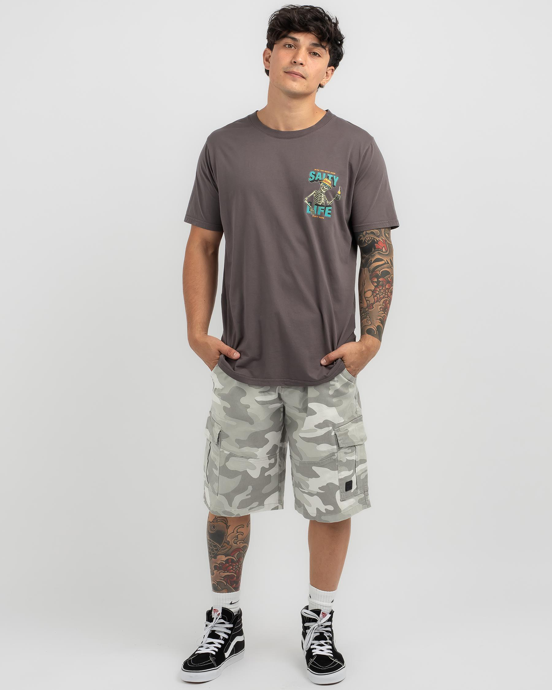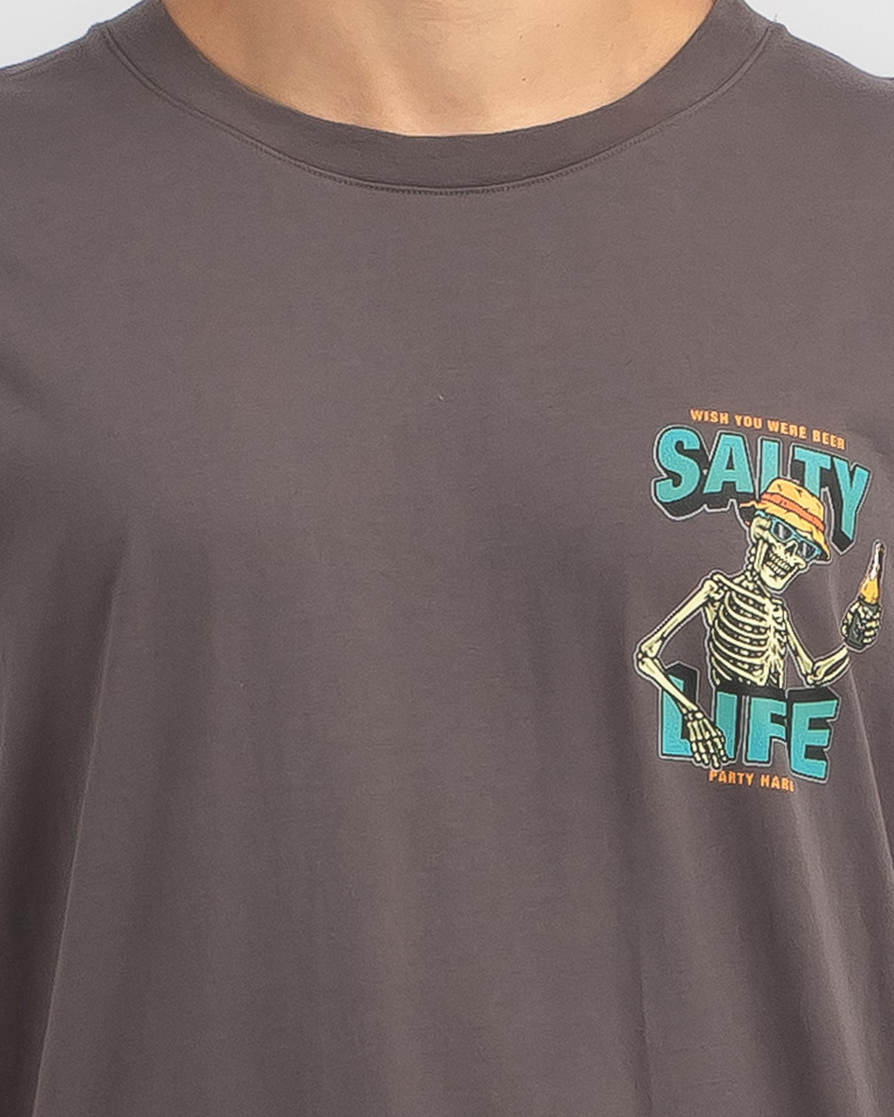 Get ready to party in style with the Salty Life Party Hard T-Shirt in washed navy. This cool and casual tee is perfect for adding a fun touch to any outfit.