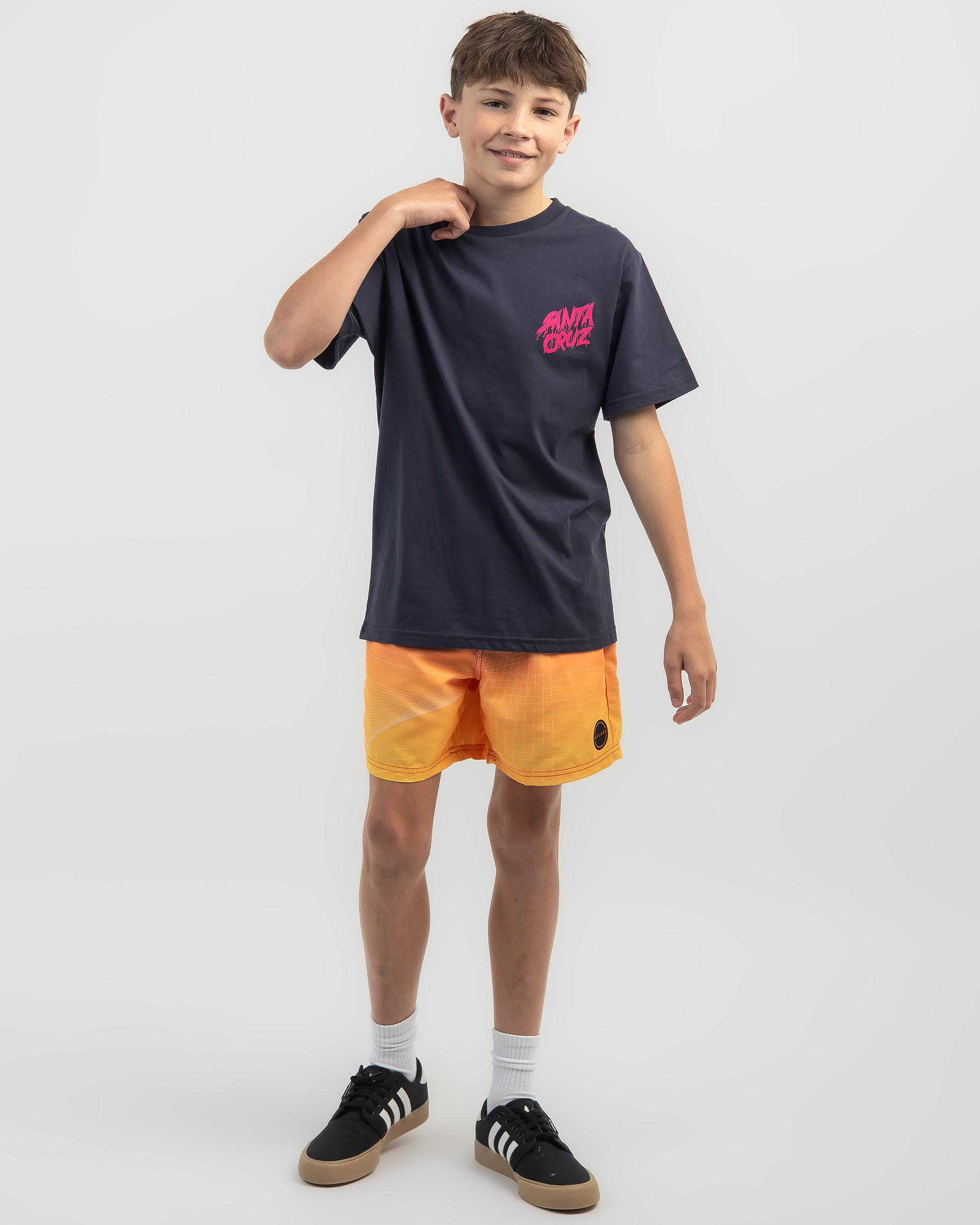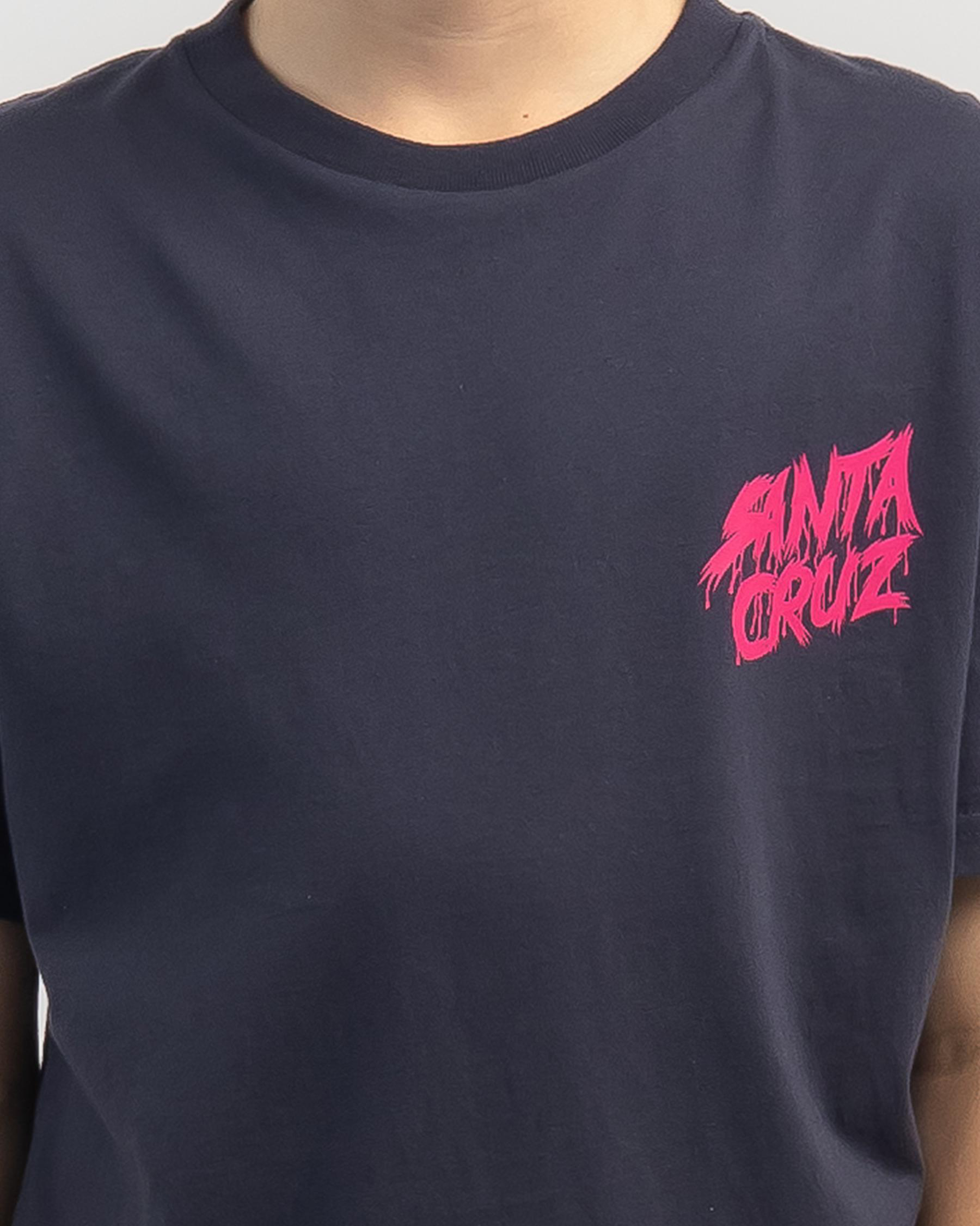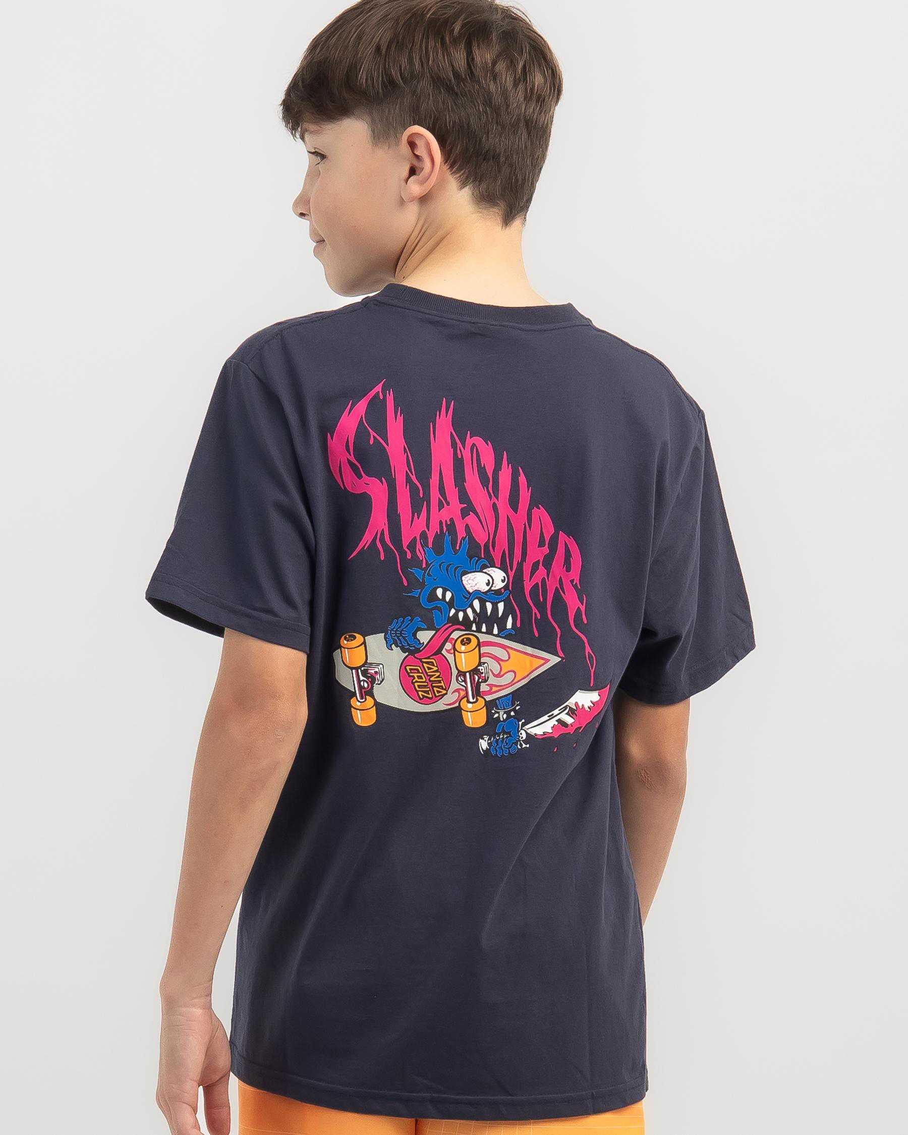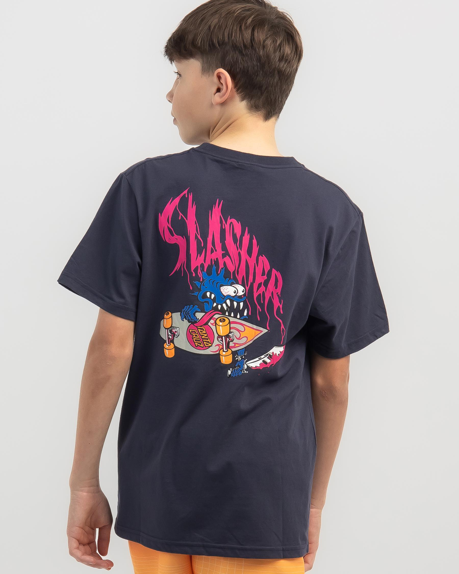 The Santa Cruz Boys' OG Slasher T-Shirt in navy is a classic addition to any young boy's wardrobe. With its iconic logo graphic, this tee is perfect for casual everyday wear.