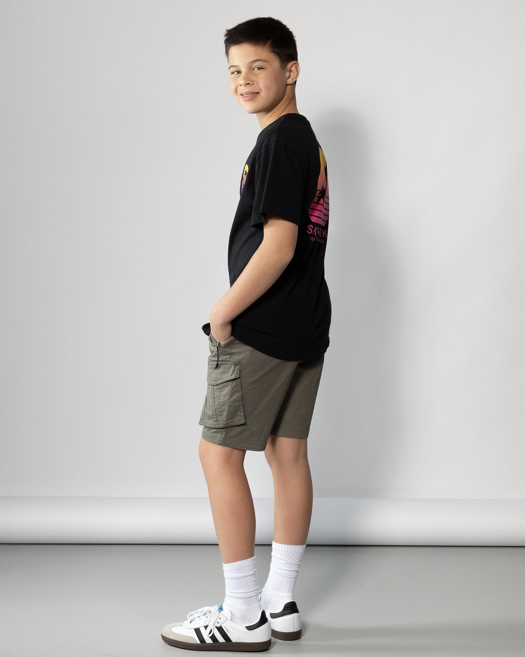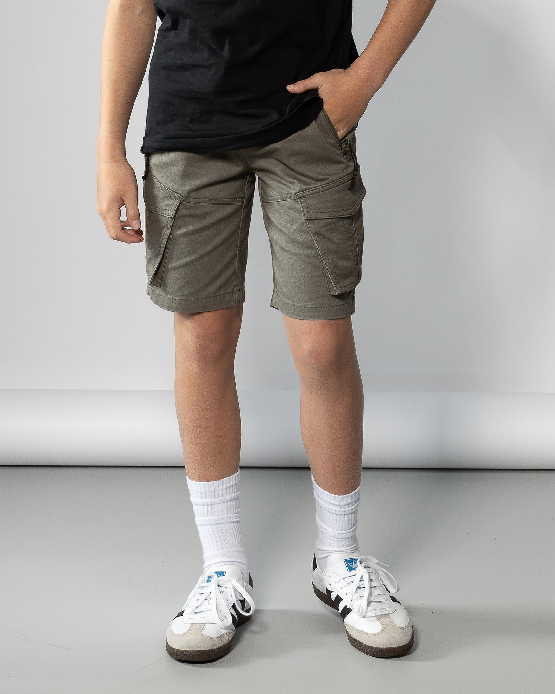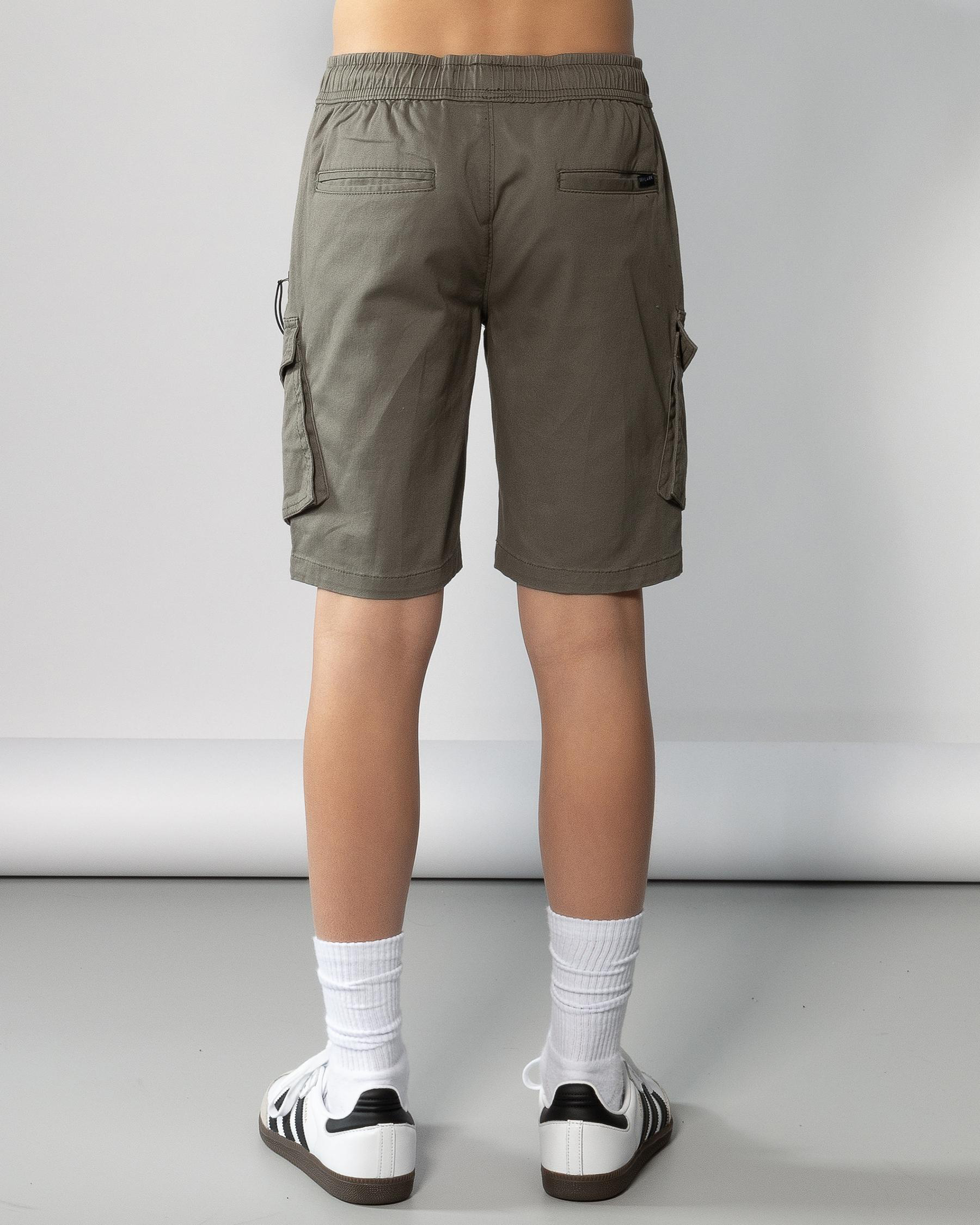 Shop Skylark Boys' Angle Walk Shorts in Olive - Elevate his summer style with these classic olive shorts, perfect for all his outdoor adventures.