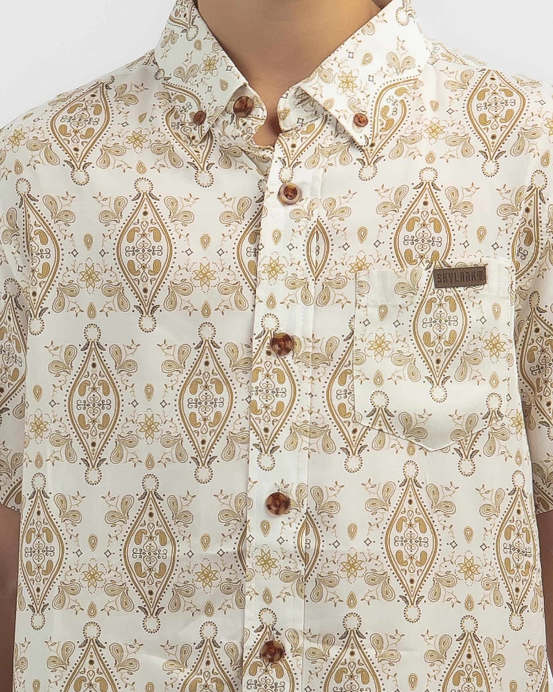 The Skylark Boys' Script Short Sleeve Shirt in Off White is a stylish and versatile addition to any wardrobe. Perfect for a clean and classic look.