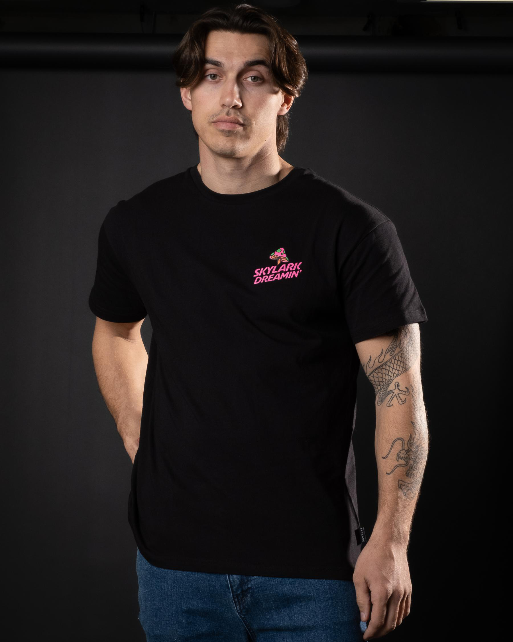 The Skylark Dreaming T-Shirt in Black exudes edgy and versatile style. Perfect for effortless day-to-night looks.