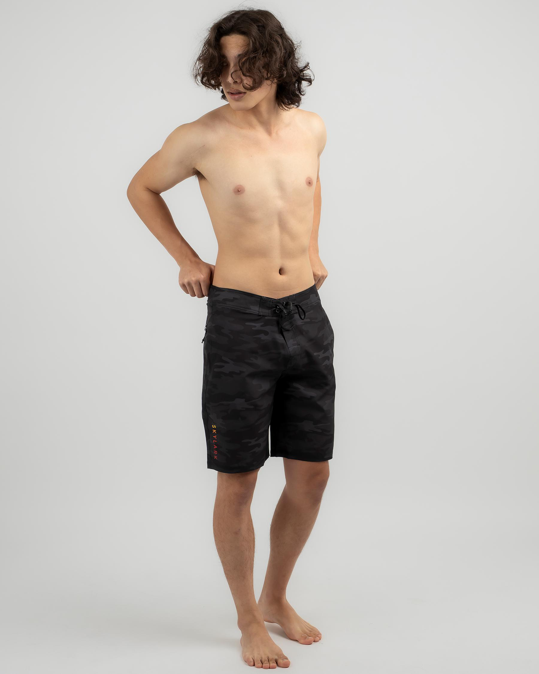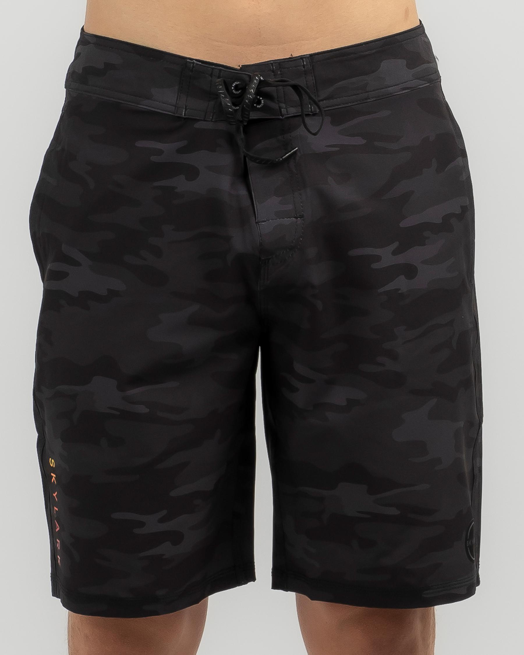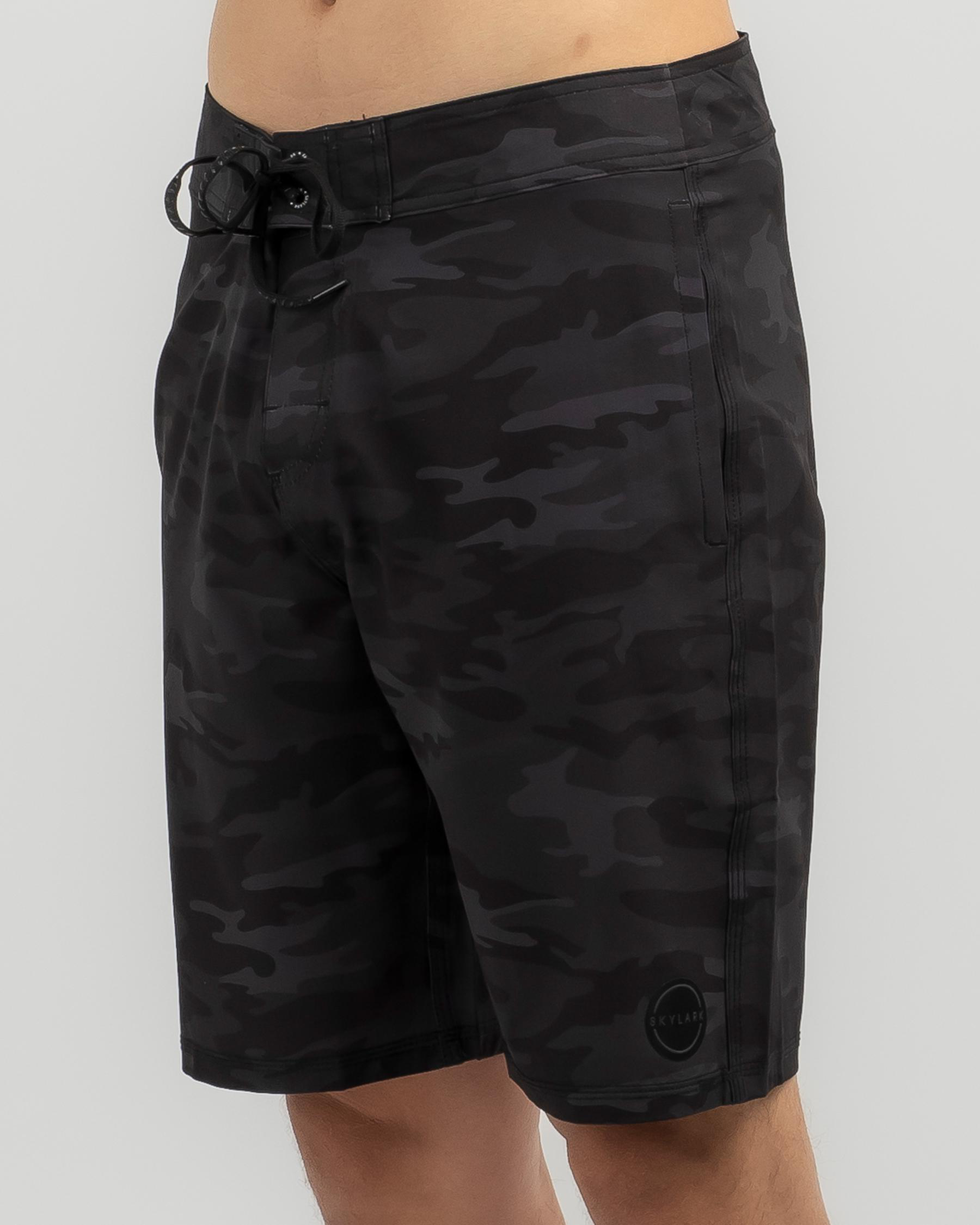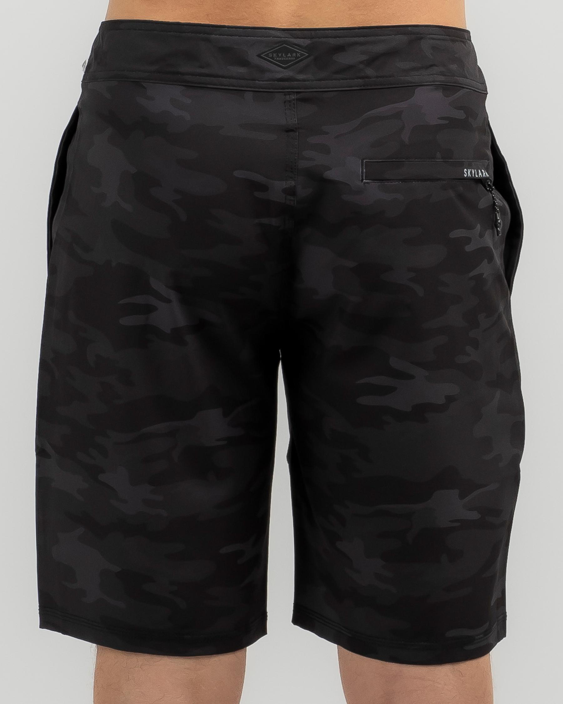 The Skylark Opaque Board Shorts in Black Camo are a stylish addition to your summer wardrobe, featuring a sleek black camo design. Perfect for beach days or poolside lounging.