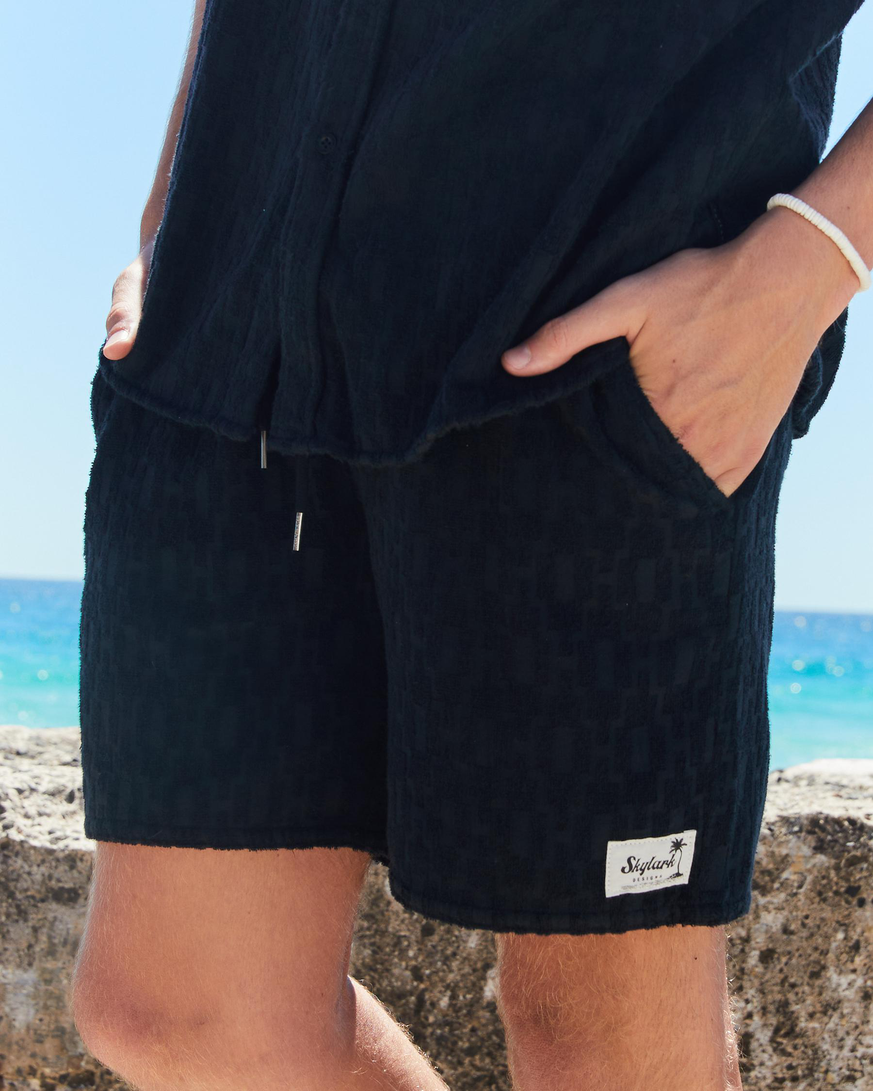 The Skylark Terry Mully Shorts in Black Overdye offer a sleek and versatile style for any summer wardrobe.