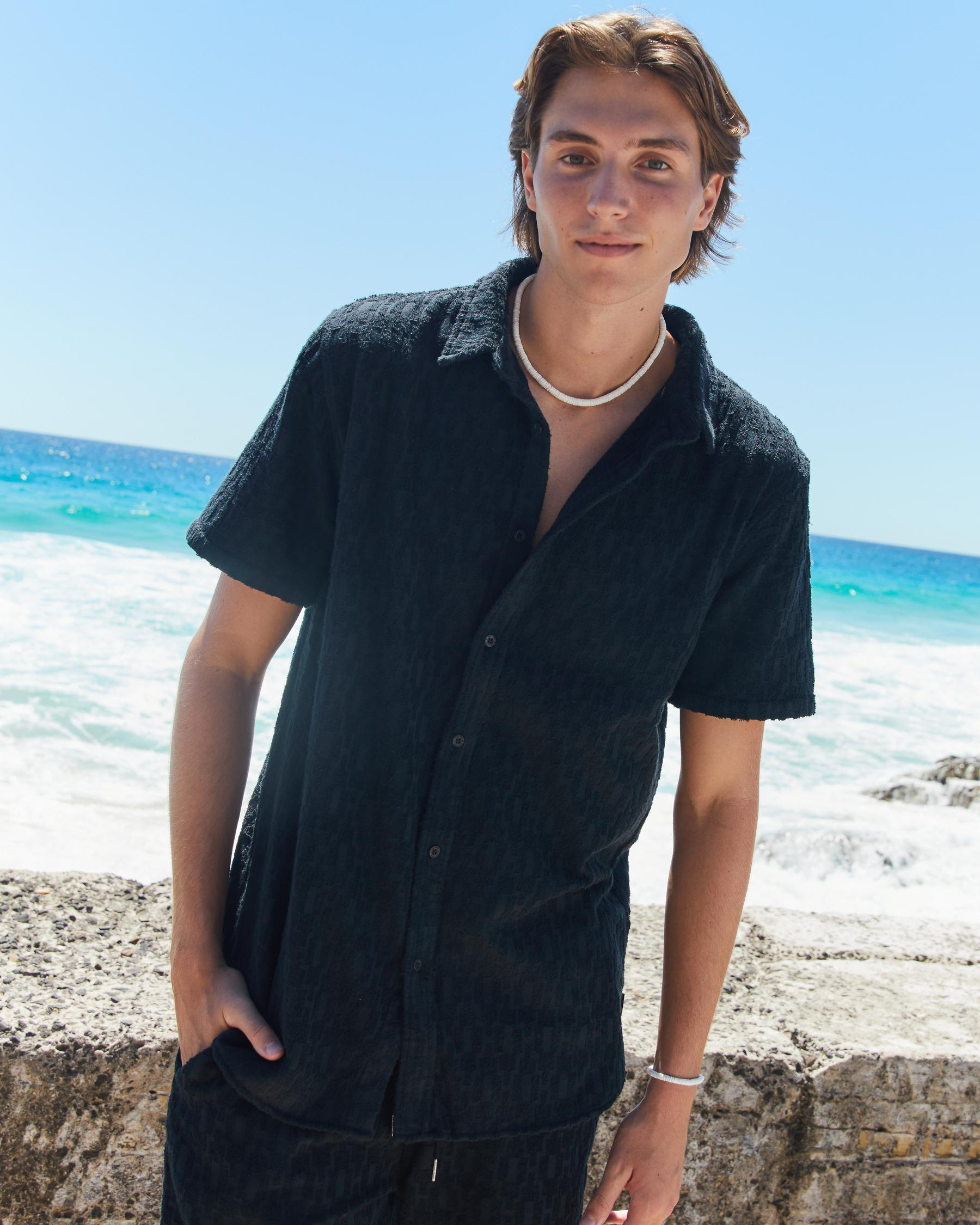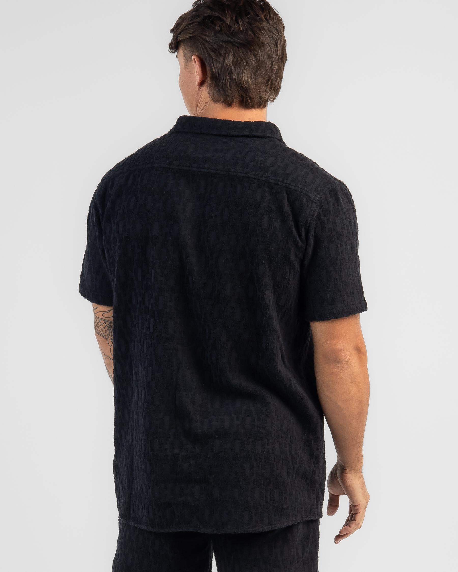 The Skylark Terry Short Sleeve Shirt in Black Overdye offers a sleek and versatile style for any occasion.