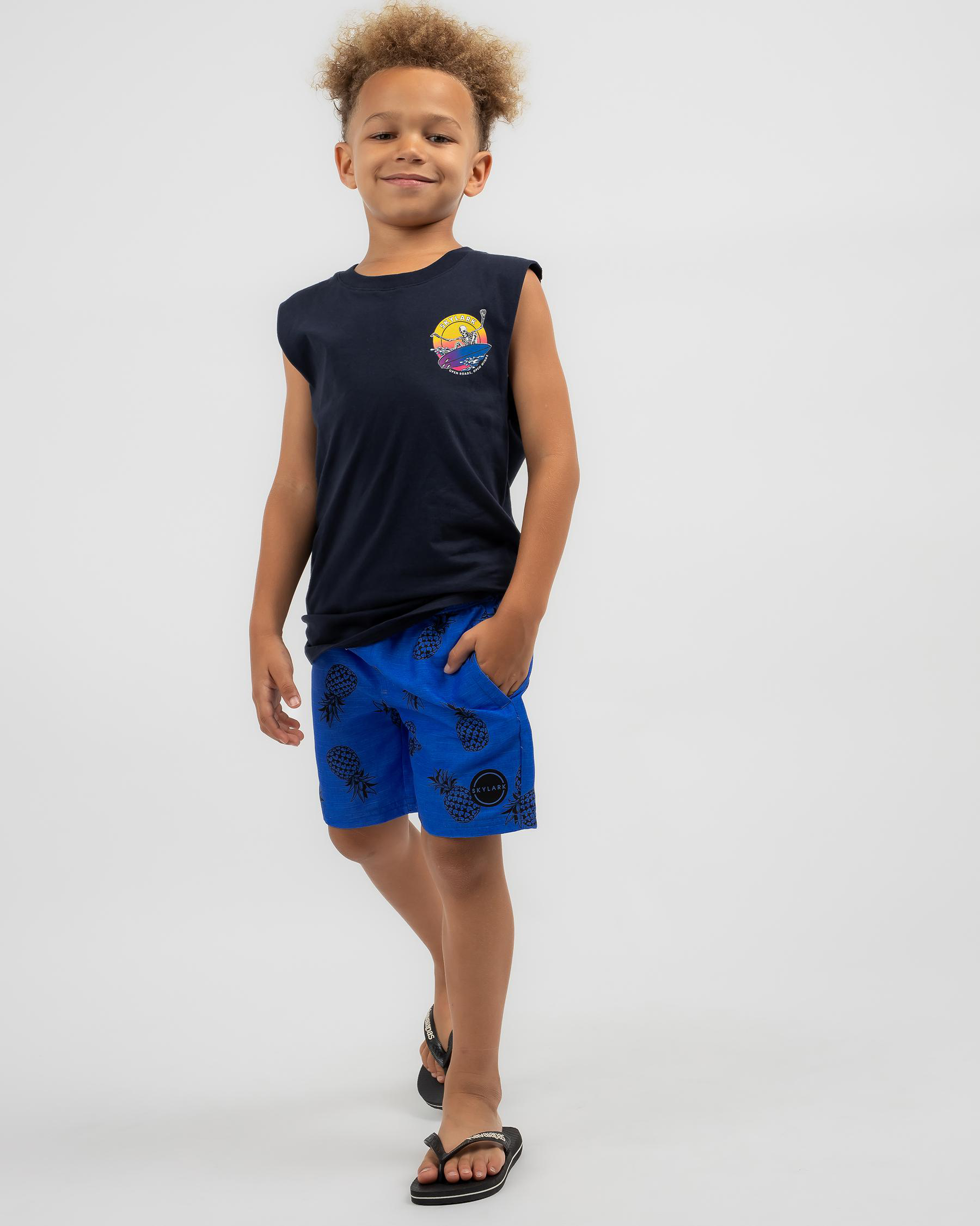 Skylark Toddlers' Pineapples Board Shorts in Blue are perfect for your little one's beach adventures with a vibrant pineapple print and comfortable fit.
