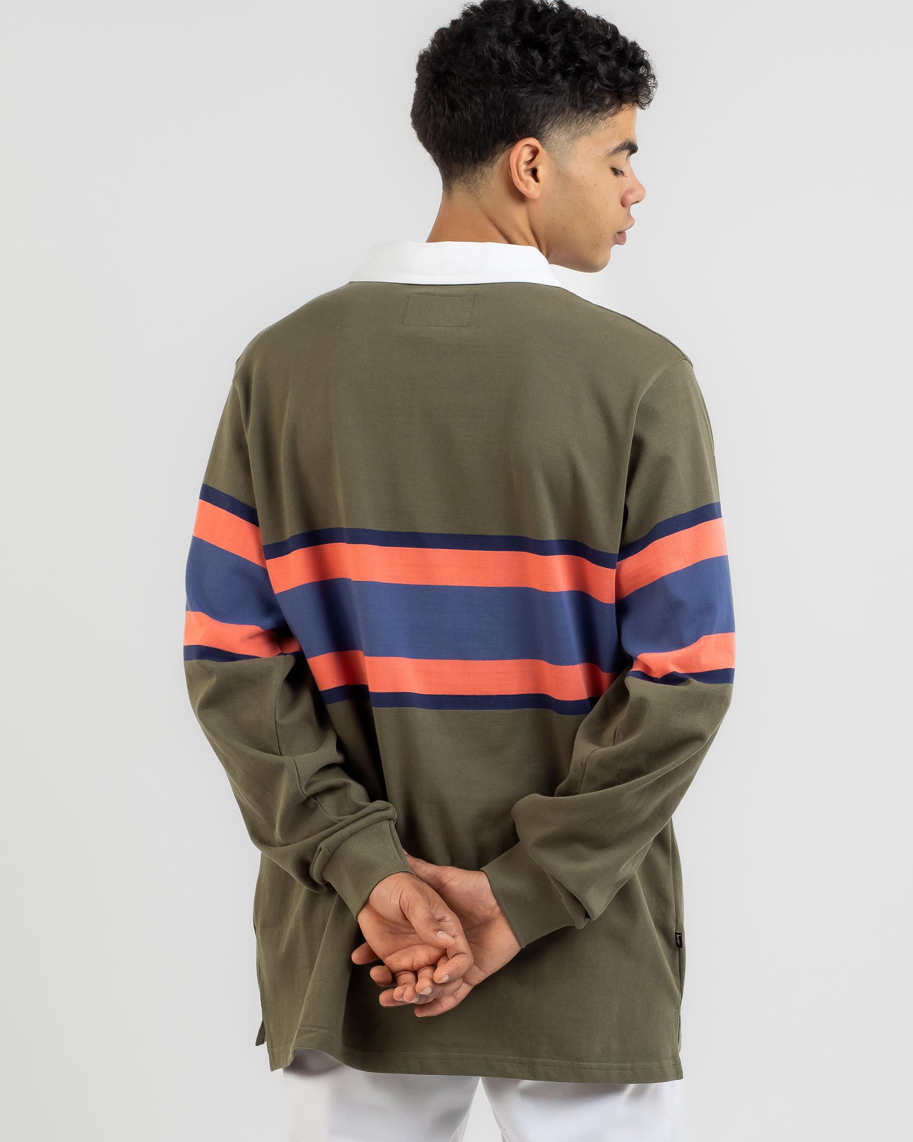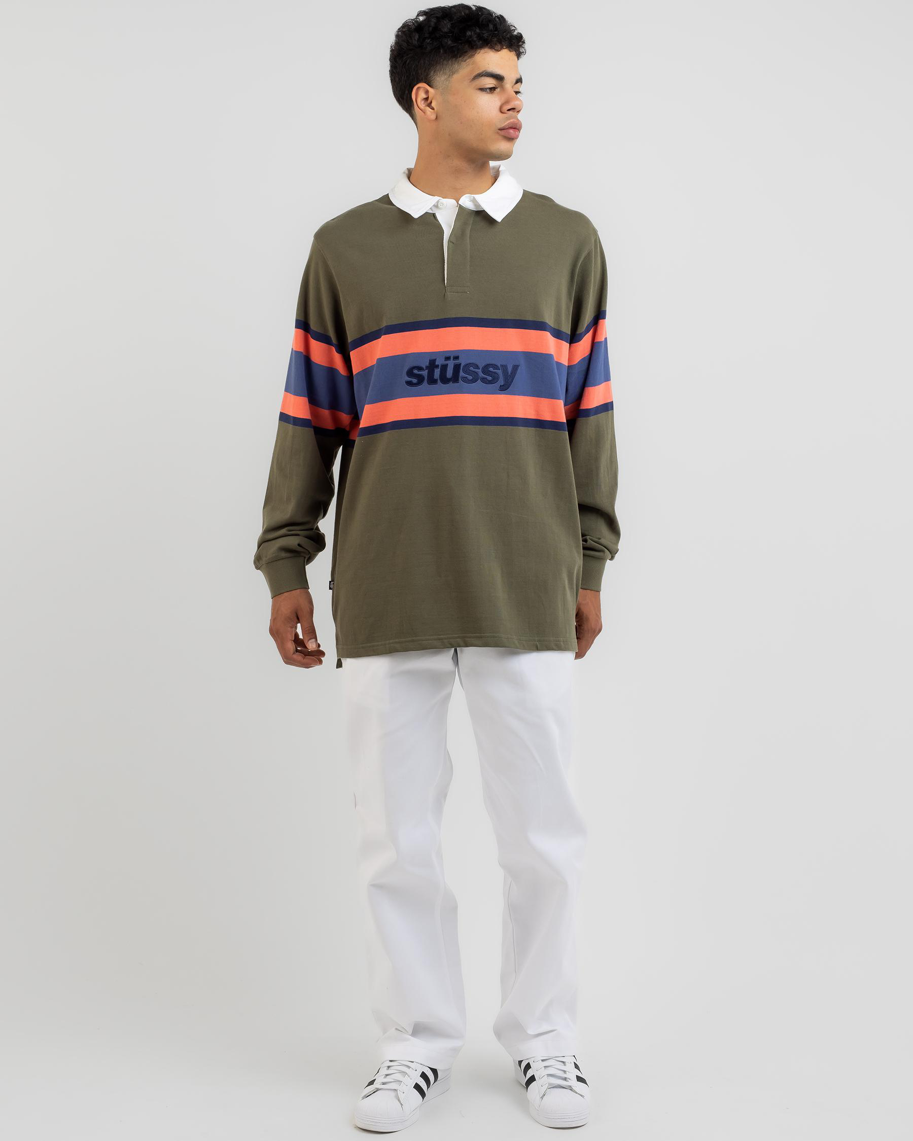 The Stussy Italic Stripe Rugby Long Sleeve Shirt in Olive is a stylish addition to your wardrobe, perfect for adding a touch of sporty chic to your outfit.