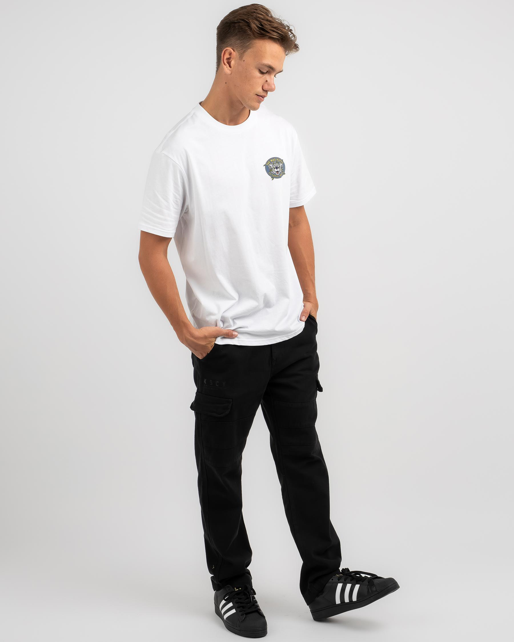 The Mad Hueys Drop Bear T-Shirt in White showcases a fierce design, making it a stylish addition to your wardrobe.