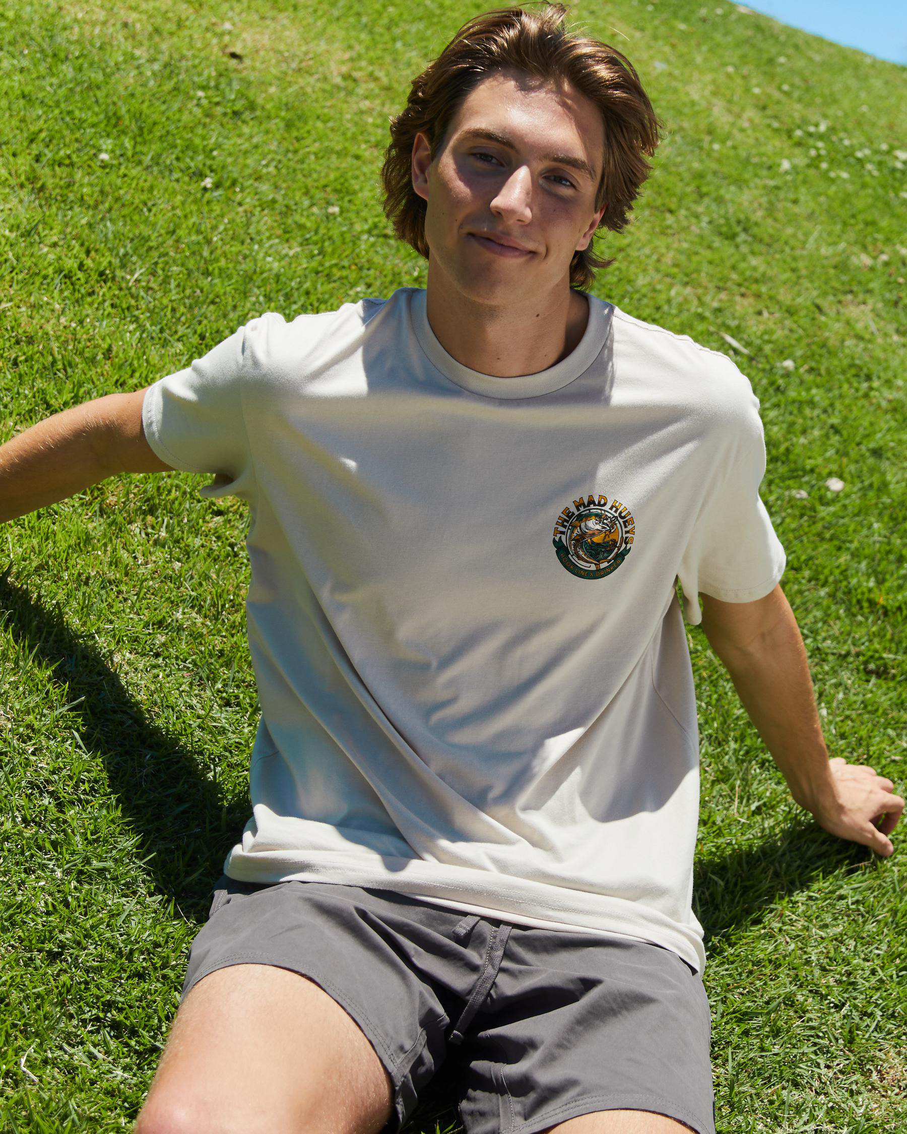 Stay stylish with The Mad Hueys Keeping It Reel T-Shirt in Cement. This versatile tee in a trendy cement color will elevate your casual look effortlessly.