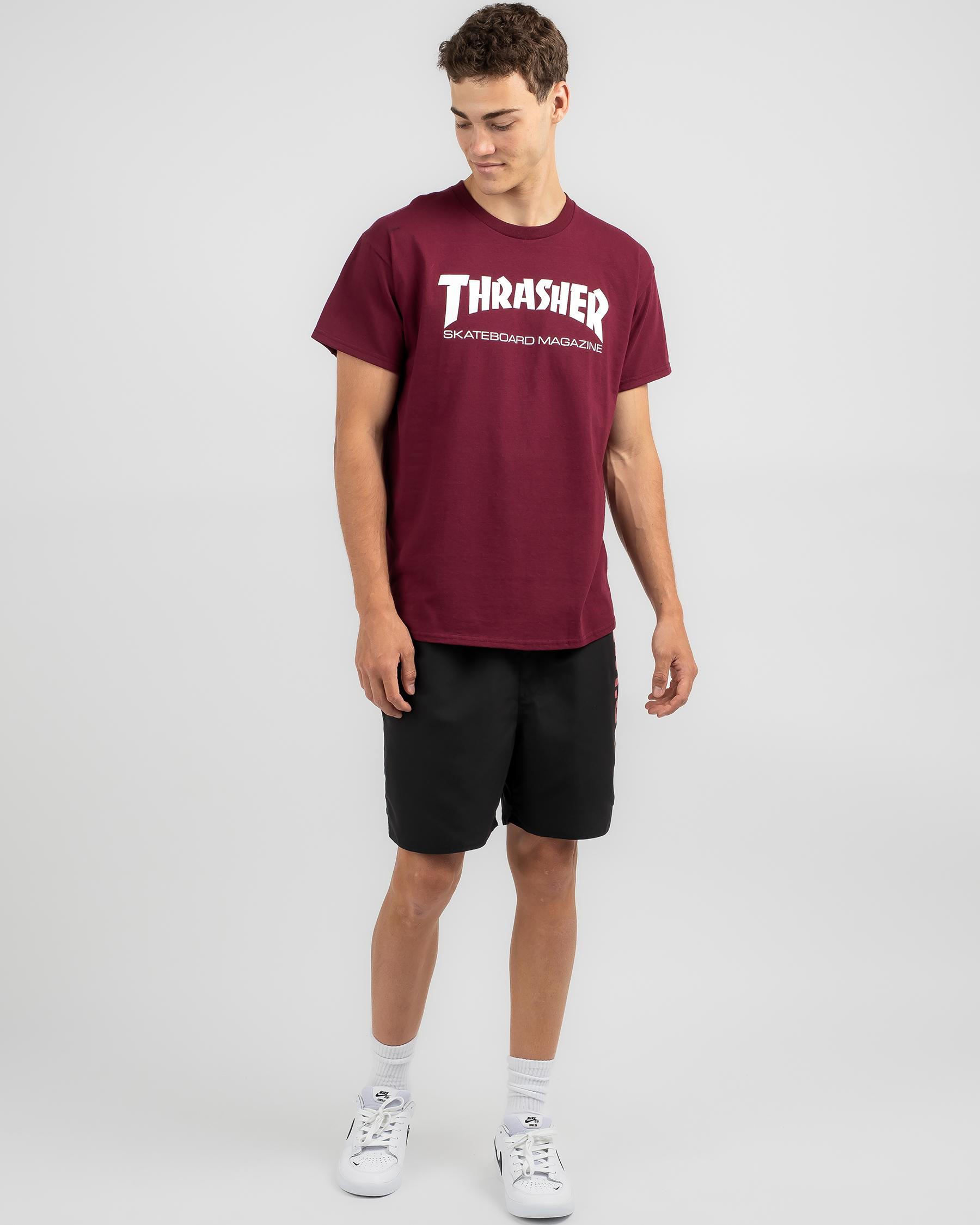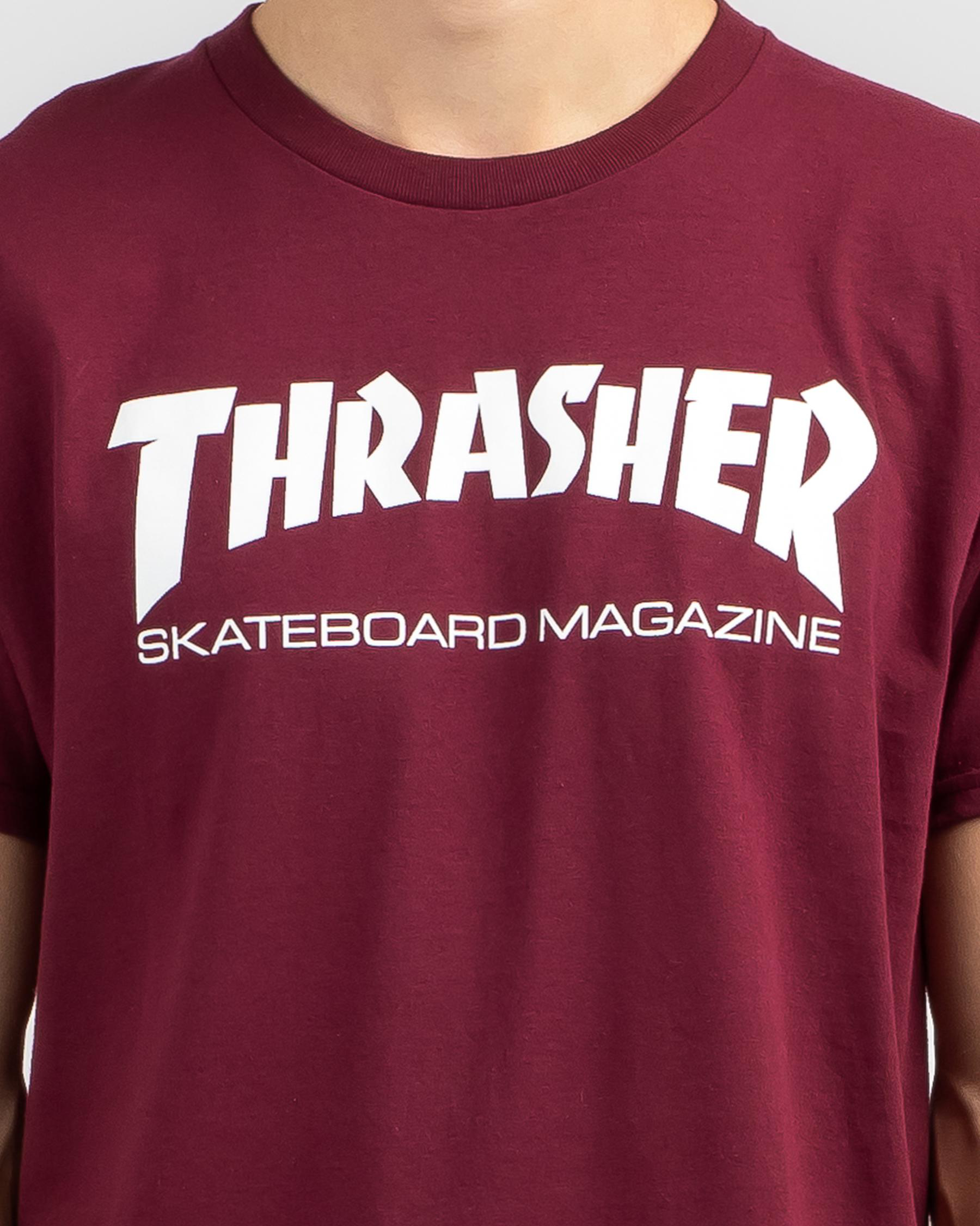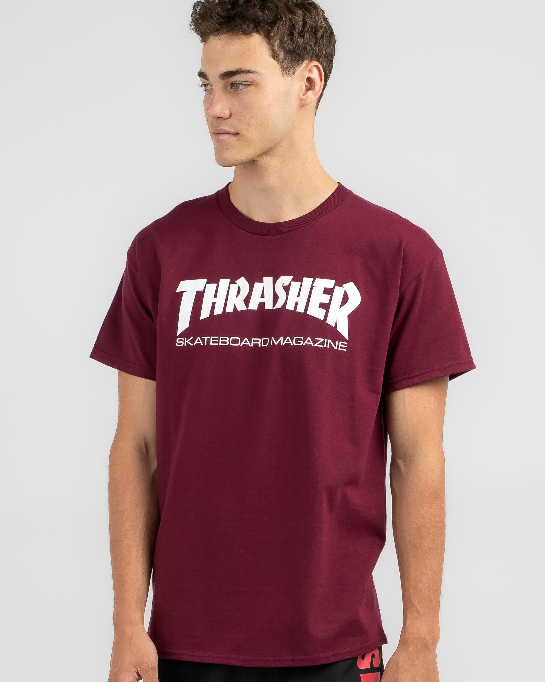 The Thrasher Skate Mag T-Shirt in Maroon is a classic choice for skaters, with its bold color making a statement on the streets.