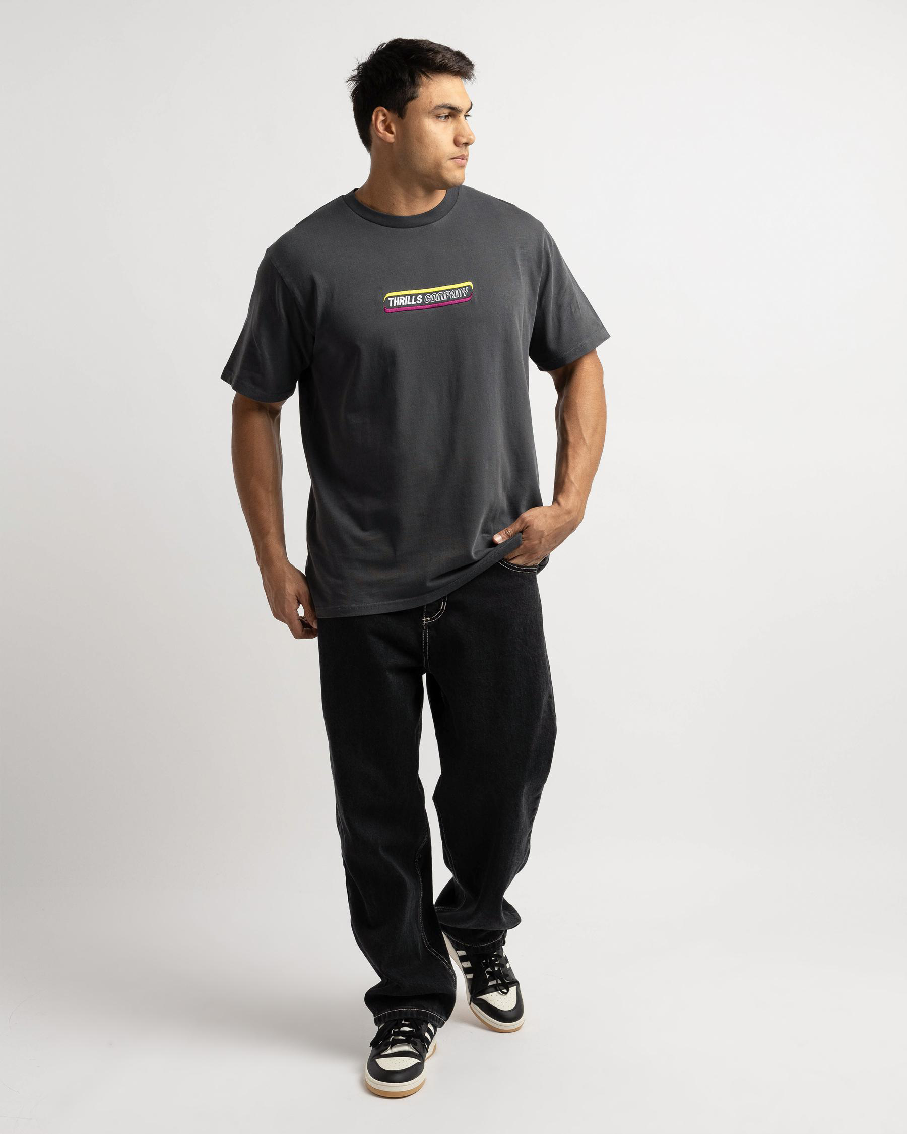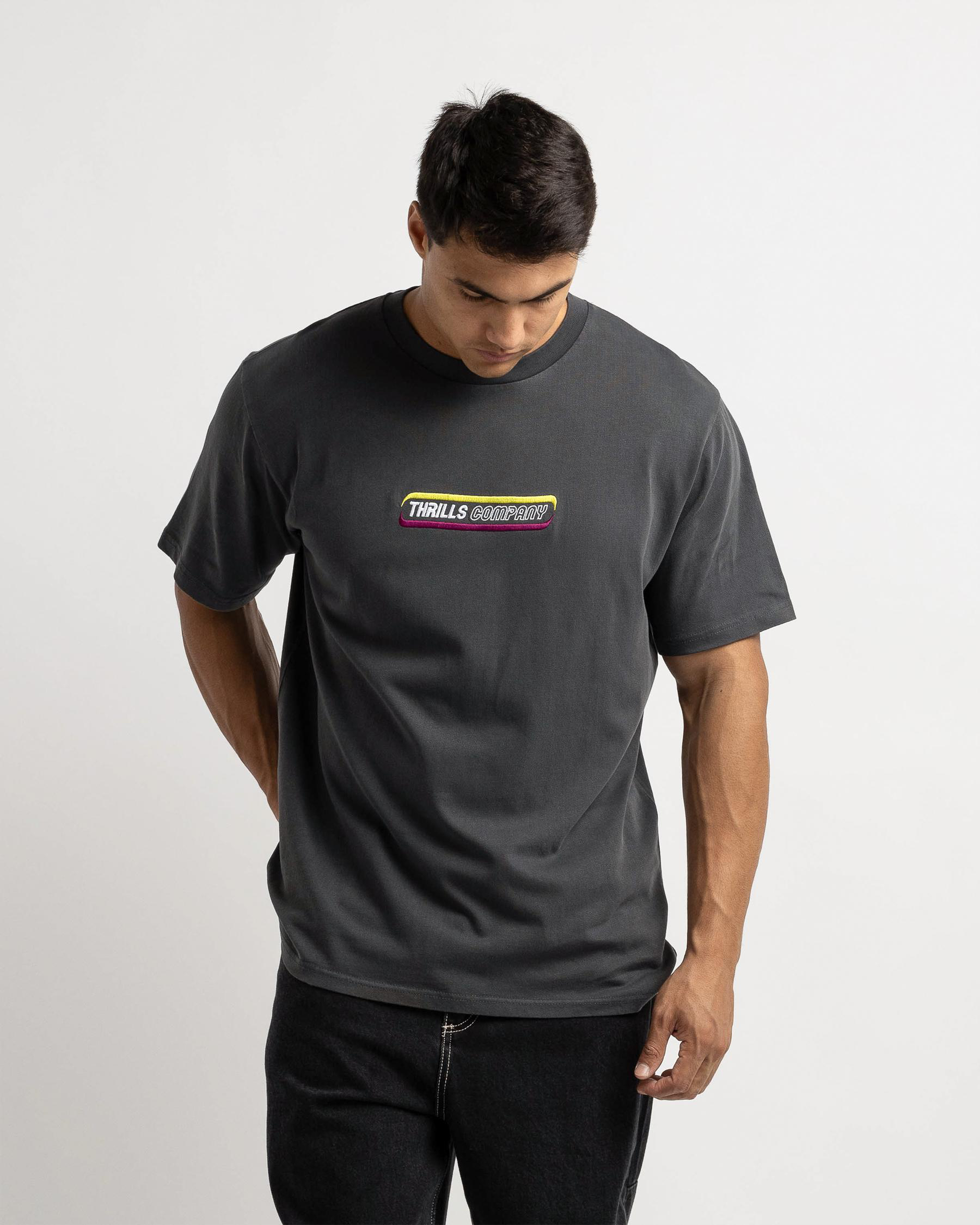 Shop Thrills Blurr Embroidery Merch Fit T-Shirt in Charcoal - this shirt features a sleek and versatile color that will easily pair with any outfit.