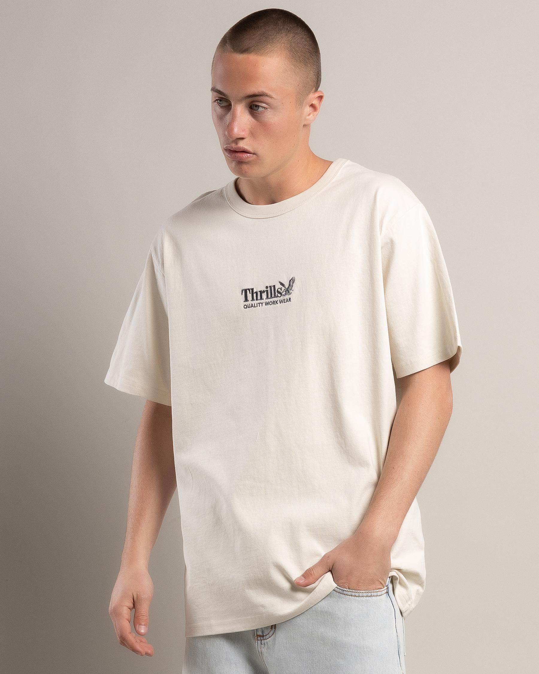 The Thrills Workwear Embroidered T-Shirt in Heritage White is a classic staple for any wardrobe. This versatile top is perfect for casual everyday wear.