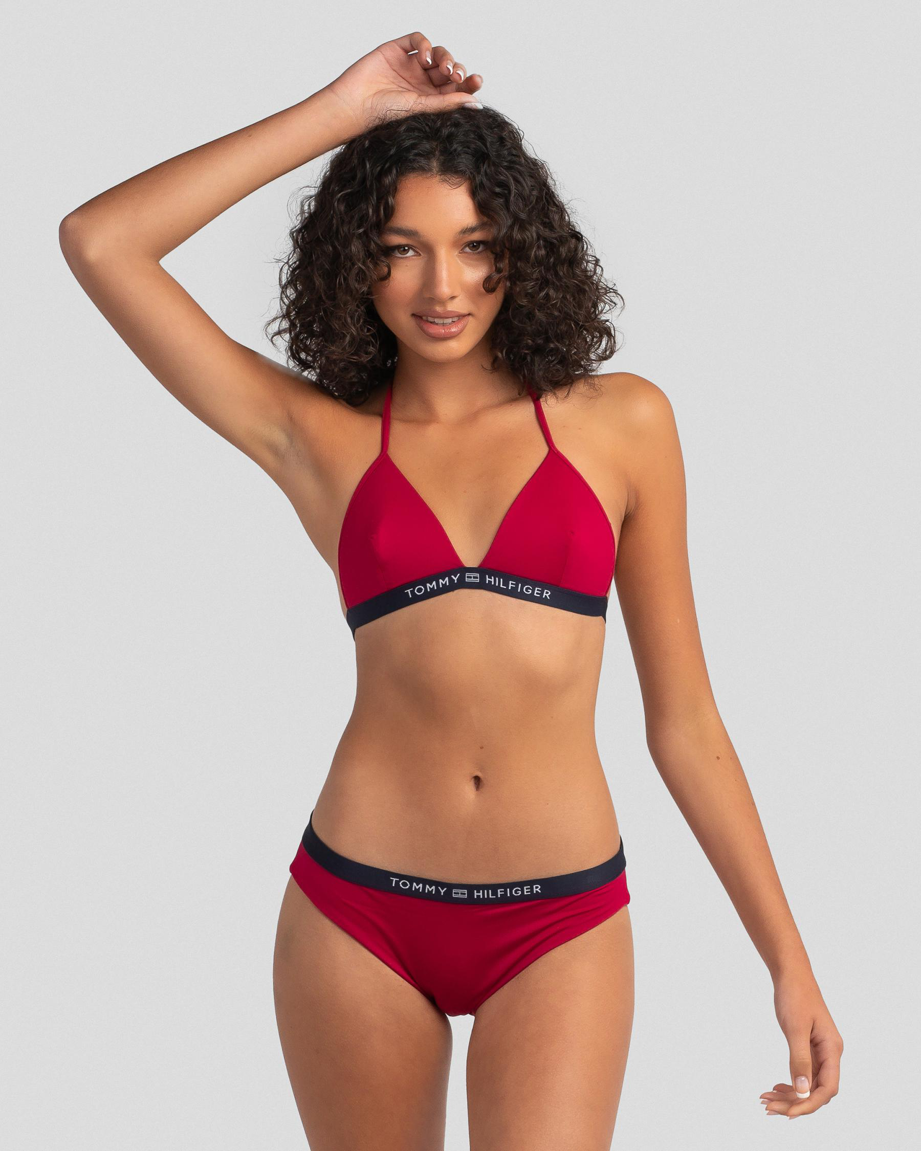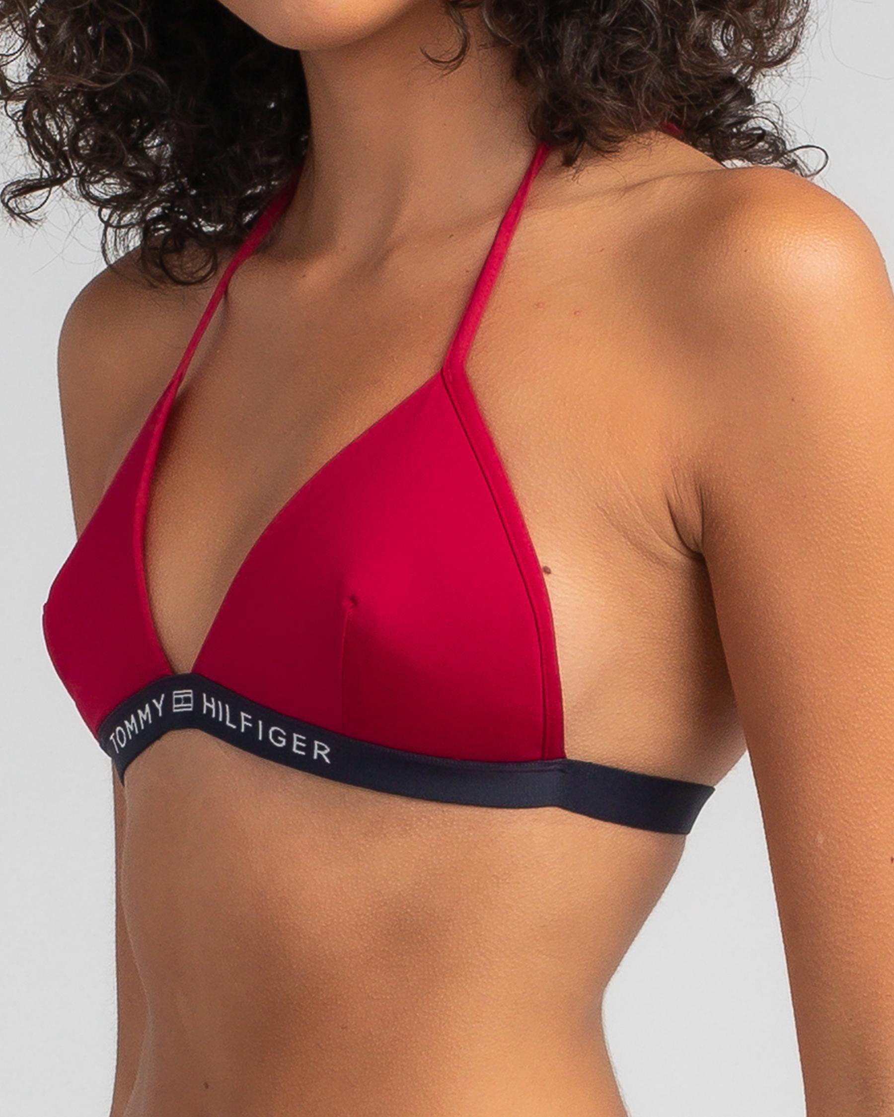 The Tommy Hilfiger Core Solid Triangle Bikini Top in Primary Red is a classic swimwear staple for a bold and vibrant beach look.
