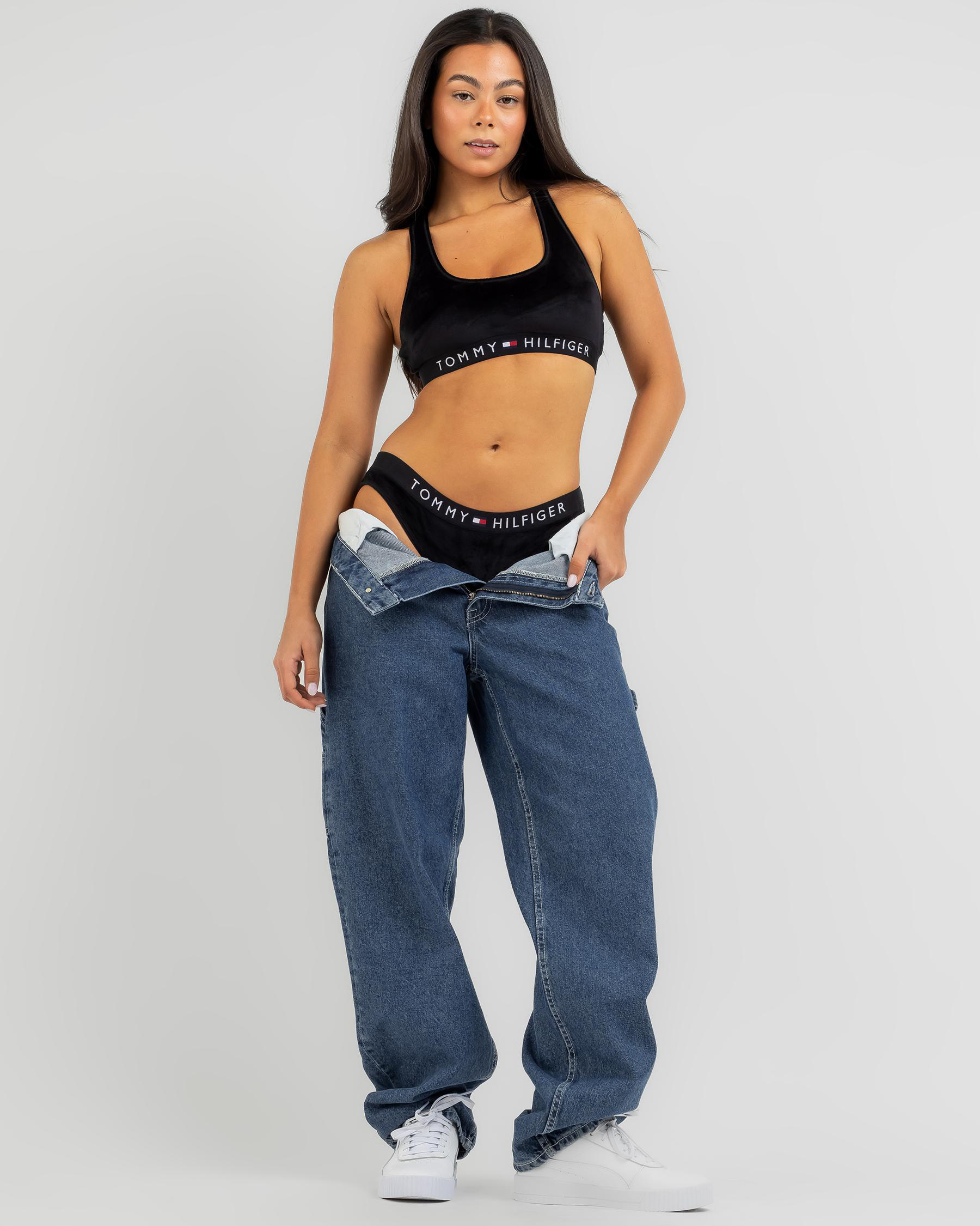 The Tommy Hilfiger Velour Unlined Bralette in Black offers a sleek and stylish look for any occasion.