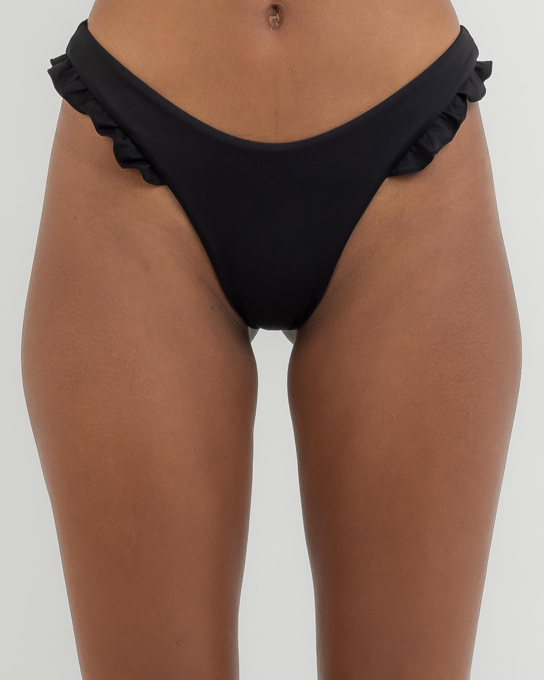 The Topanga Cassia Frill High Cut Bottom in Black is a sleek and stylish swimwear option for your next beach day or poolside adventure.