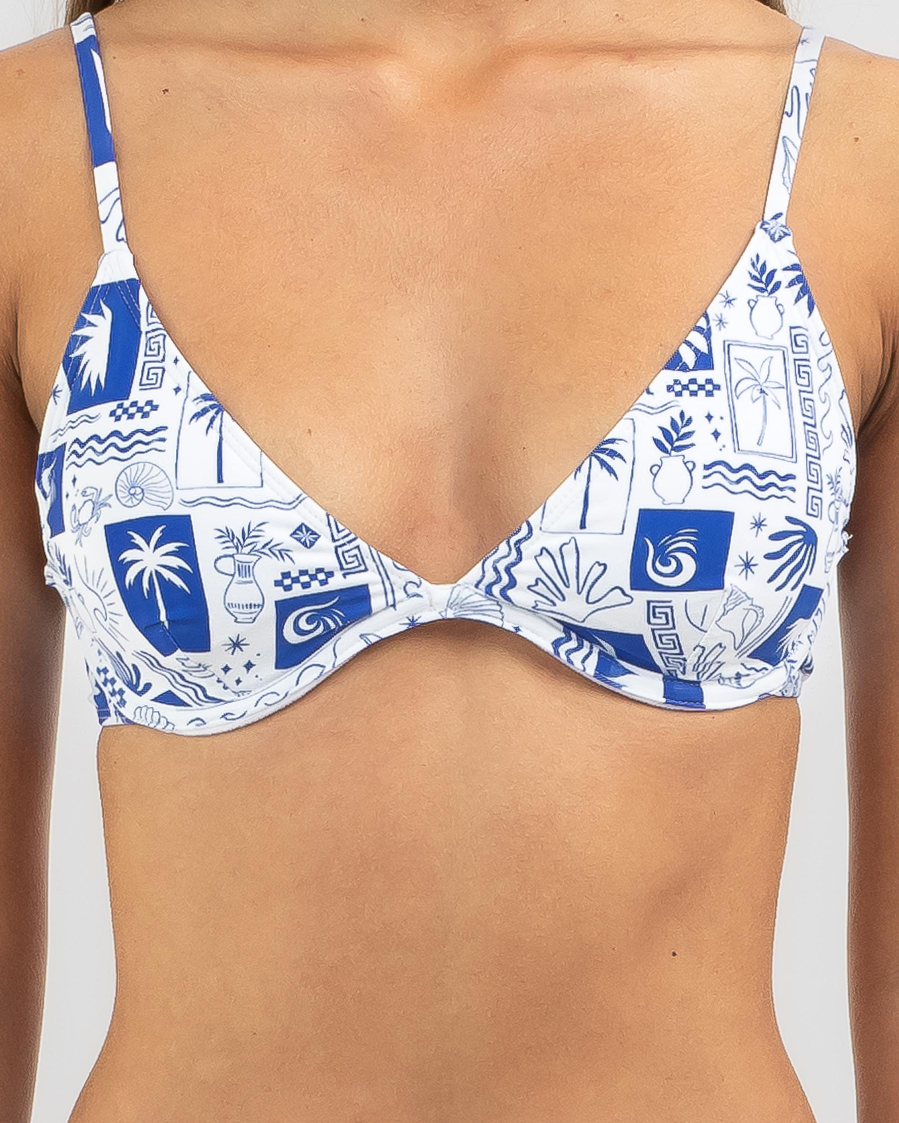 The Topanga Euro Summer Underwire Bikini Top in Blue features a classic white and blue design, perfect for a stylish beach look.