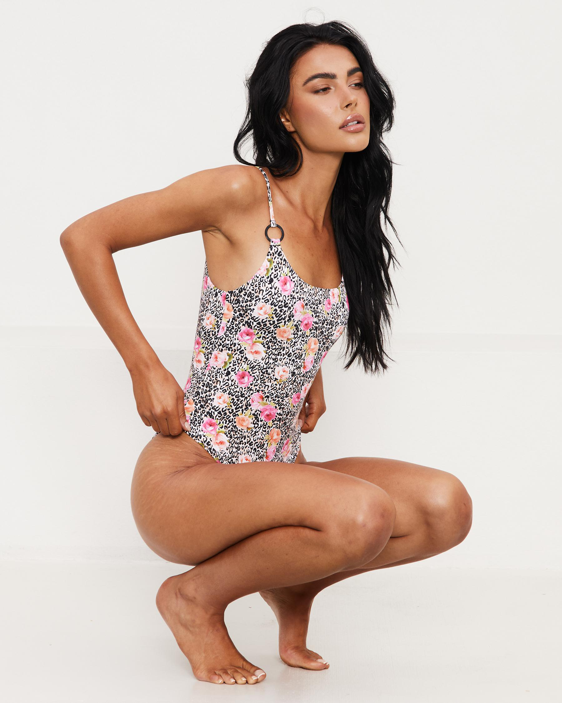 The Topanga Raquelle One Piece Swimsuit in leopard floral combines fierce leopard print with delicate florals for a bold and stylish look.