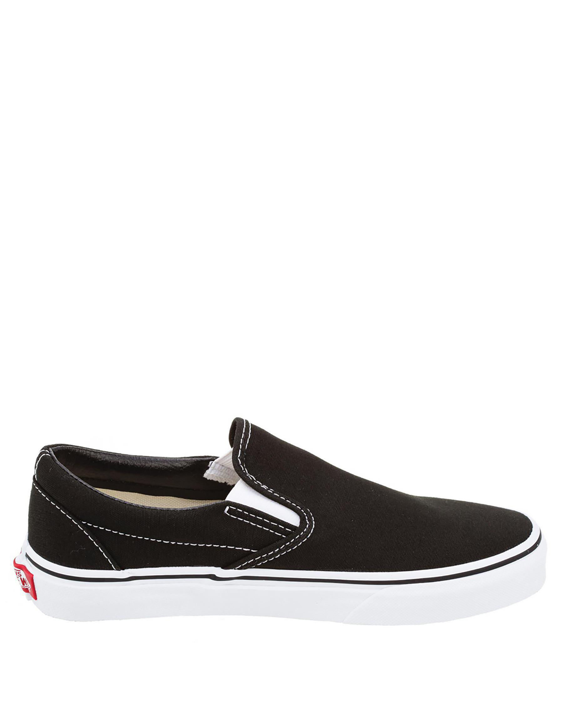 No matter the occasion; the Vans Mens Classic Slip On Shoes have got your back. These black and white slip on sneakers boast a canvas upper, moulded rubber outsole and logo details. Make these comfy Vans shoes your everyday go-to.