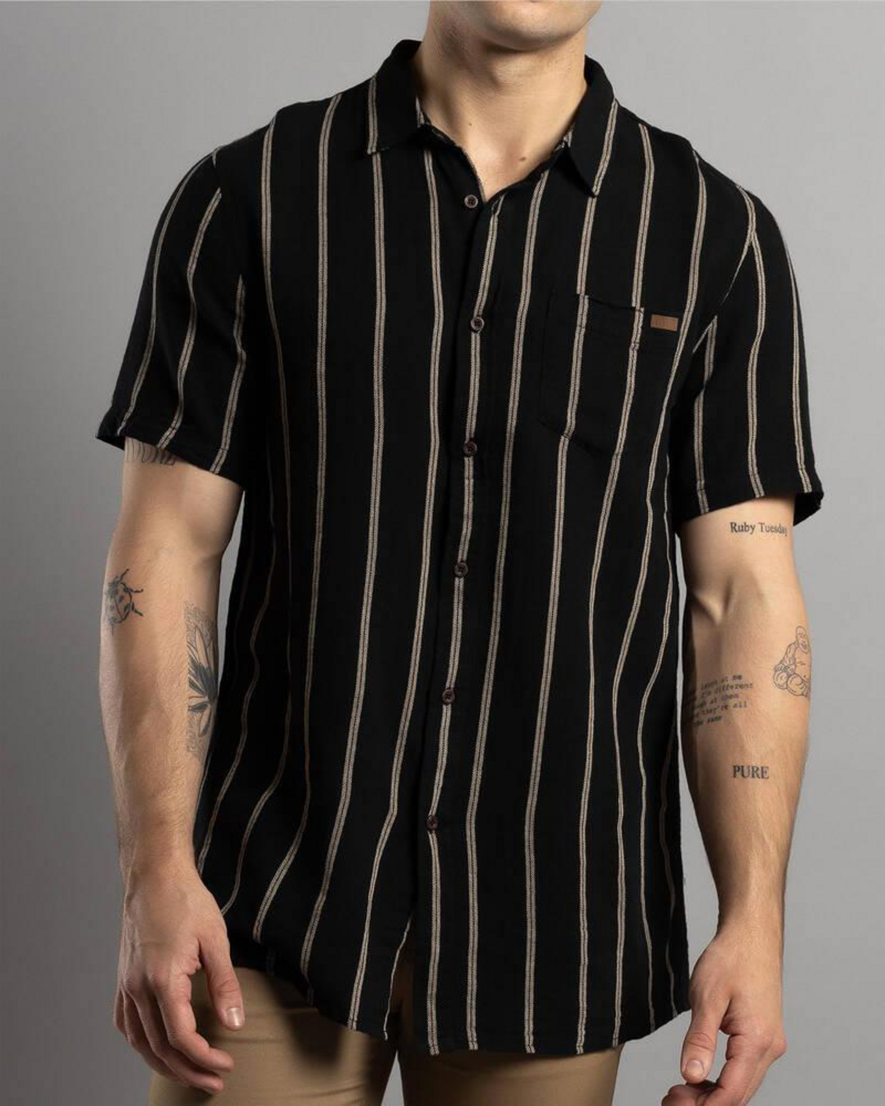 The Skylark Trinity Short Sleeve Shirt in Black/tan offers a sleek and versatile look for any occasion.