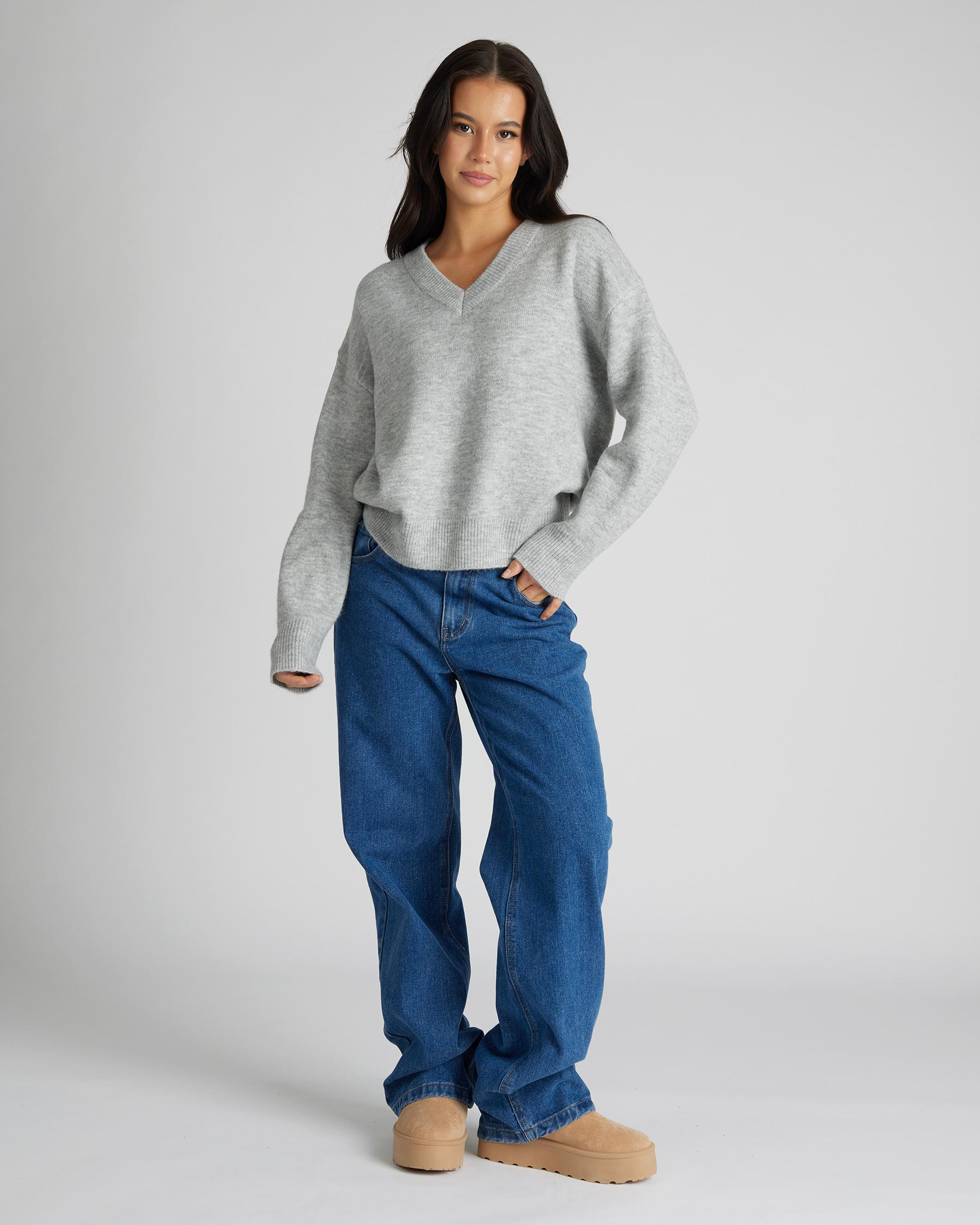 Stay cozy and stylish in the Ava And Ever Hopkins V Neck Knit Jumper in Grey Marle. Perfect for layering in the colder months.
