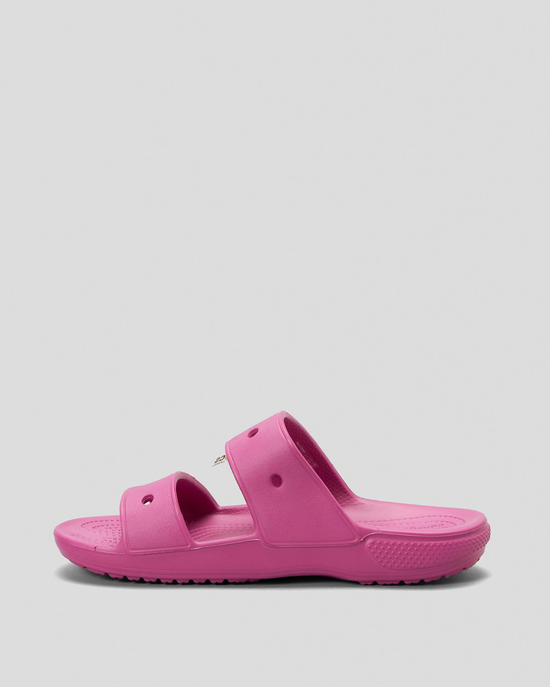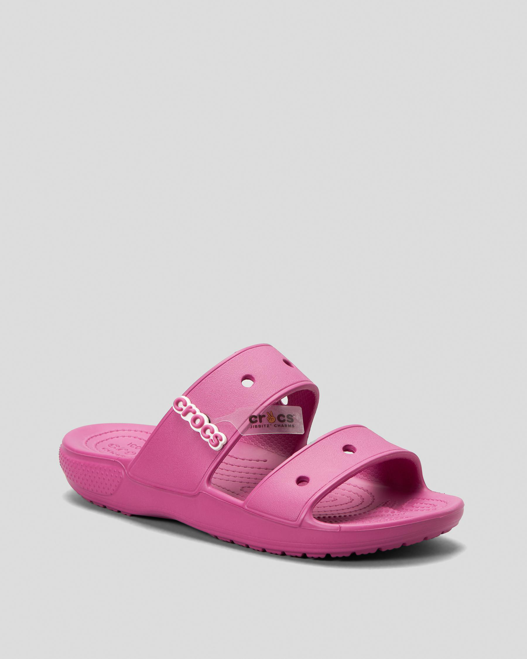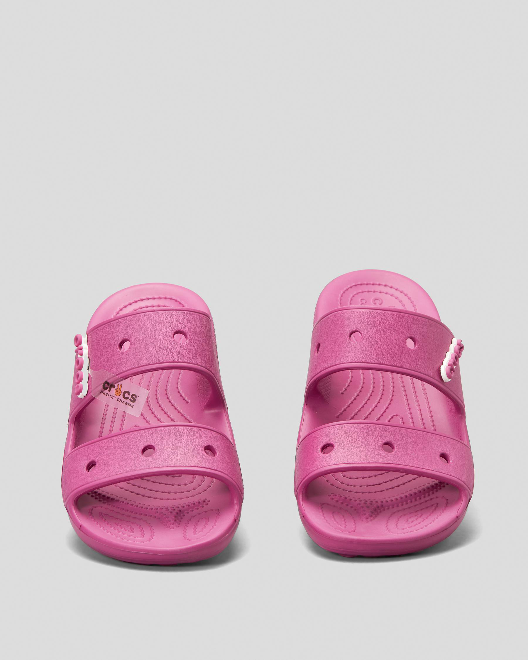 Customizable with Jibbitz charms. Easy to clean and quick to dry. Water-friendly. Ventilation ports add breathability and help shed water and debris. Pivoting heel straps for a more secure fit.