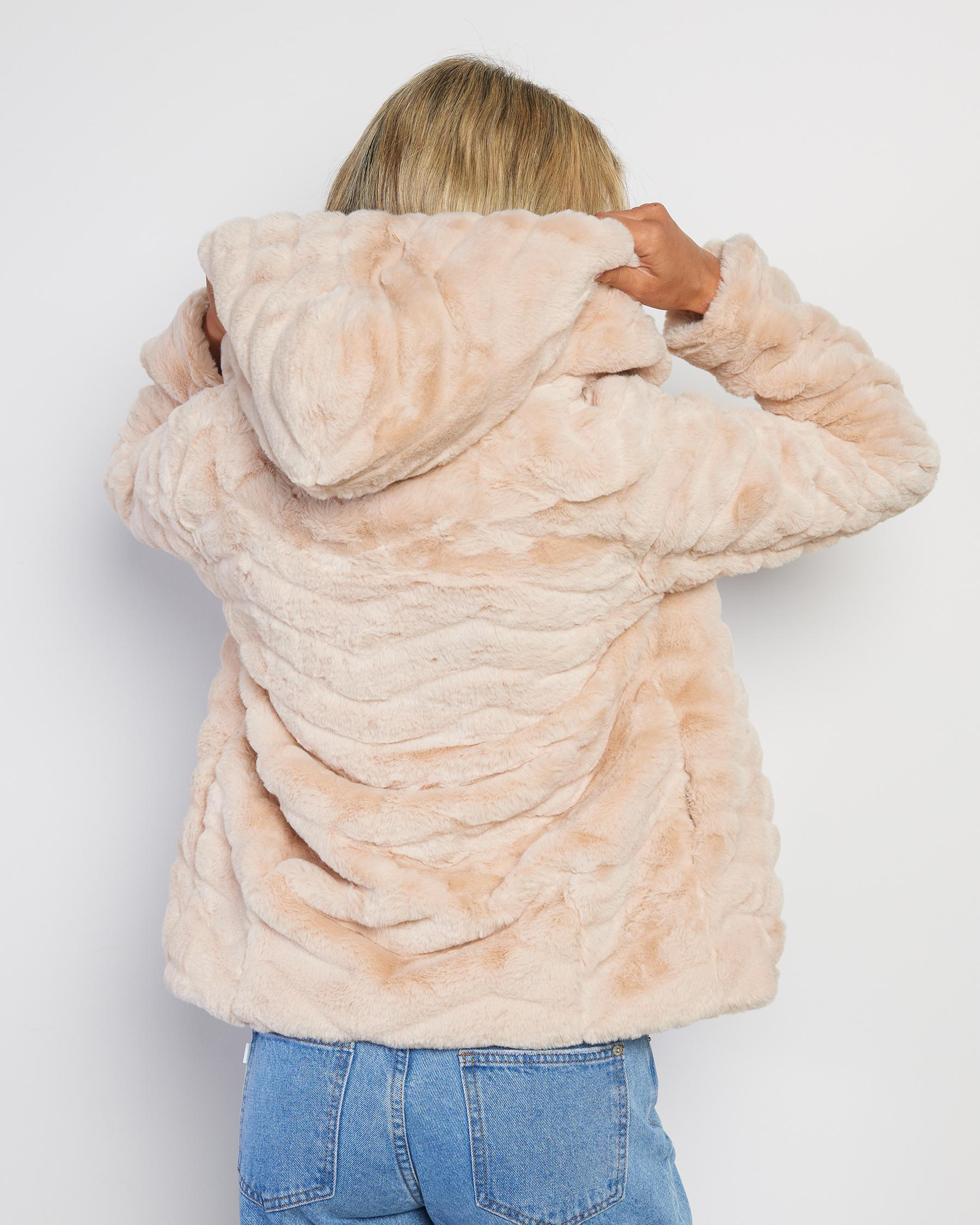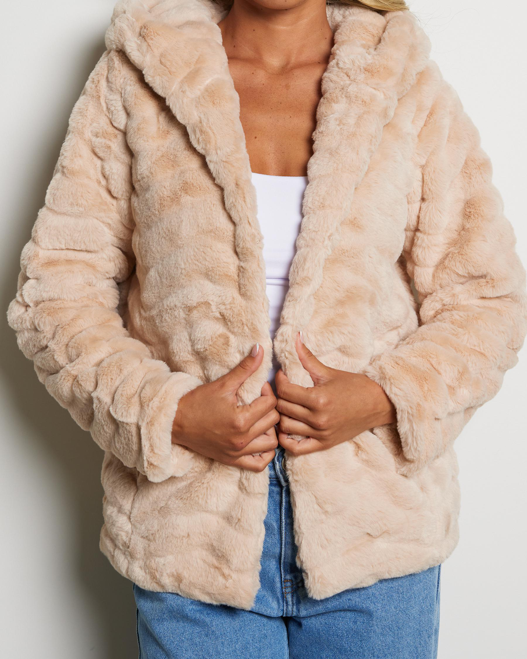 Stay cozy and stylish in the Mooloola Moulin Faux Fur Jacket in Champagne. This luxe jacket adds a touch of glamour to any outfit.