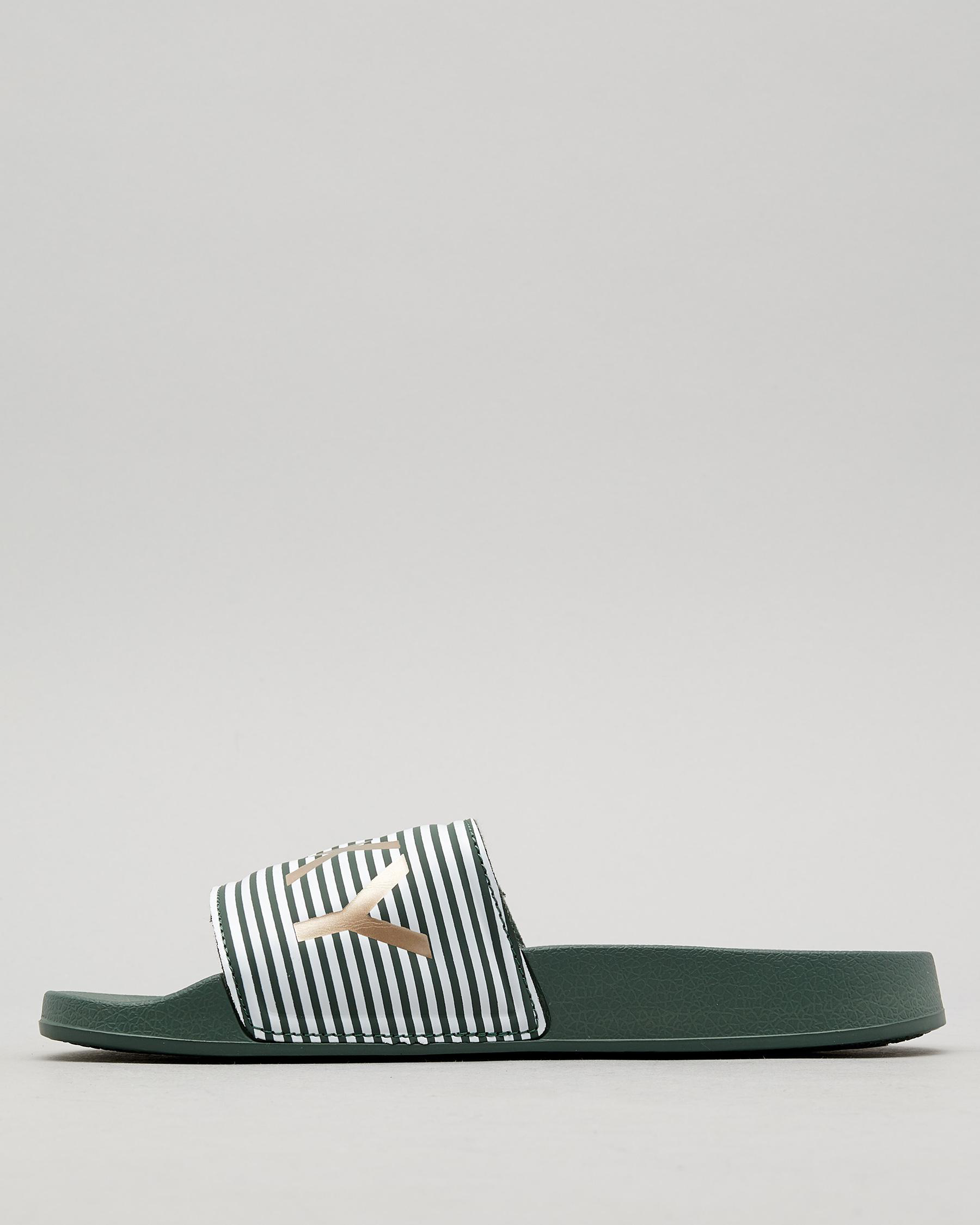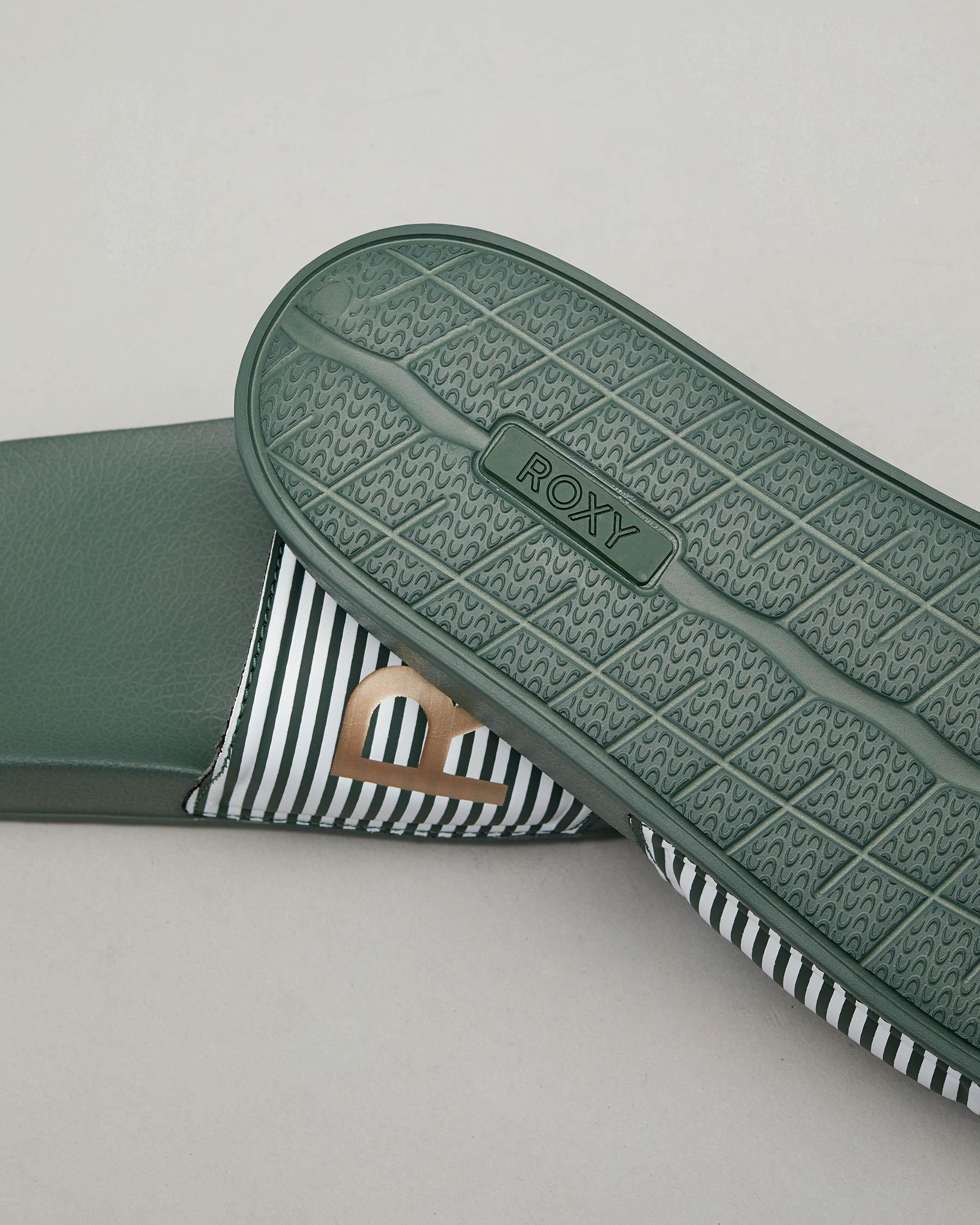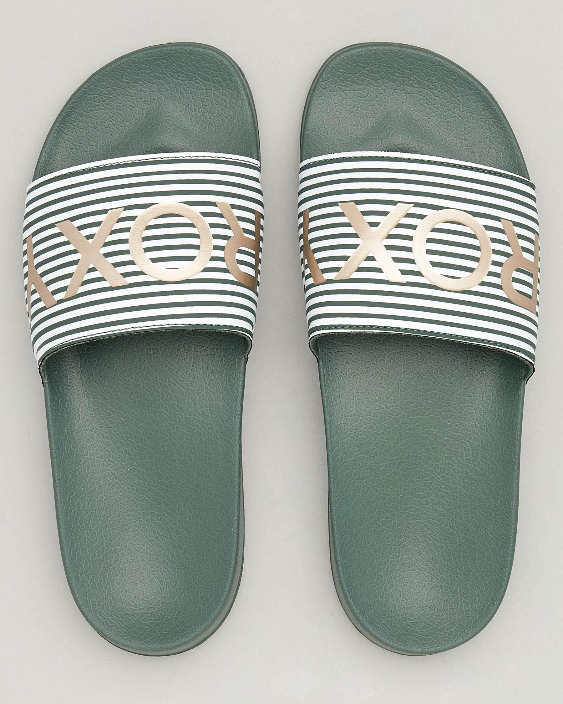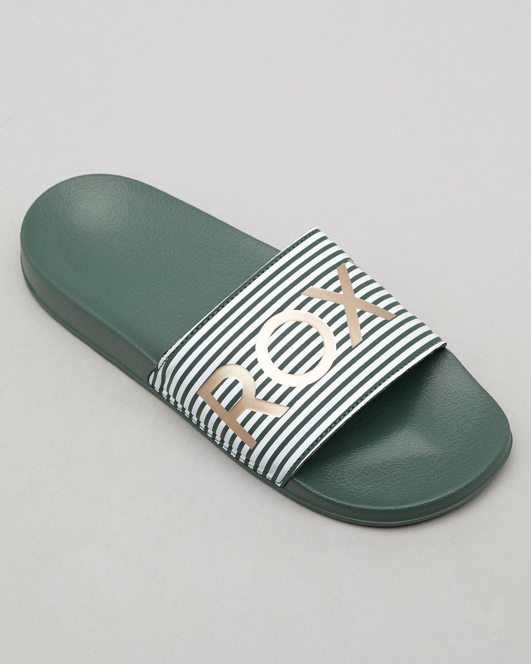 The Roxy Slippy Slide Sandal in White is sleek and stylish, with a touch of silver for added flair. Perfect for summer days.