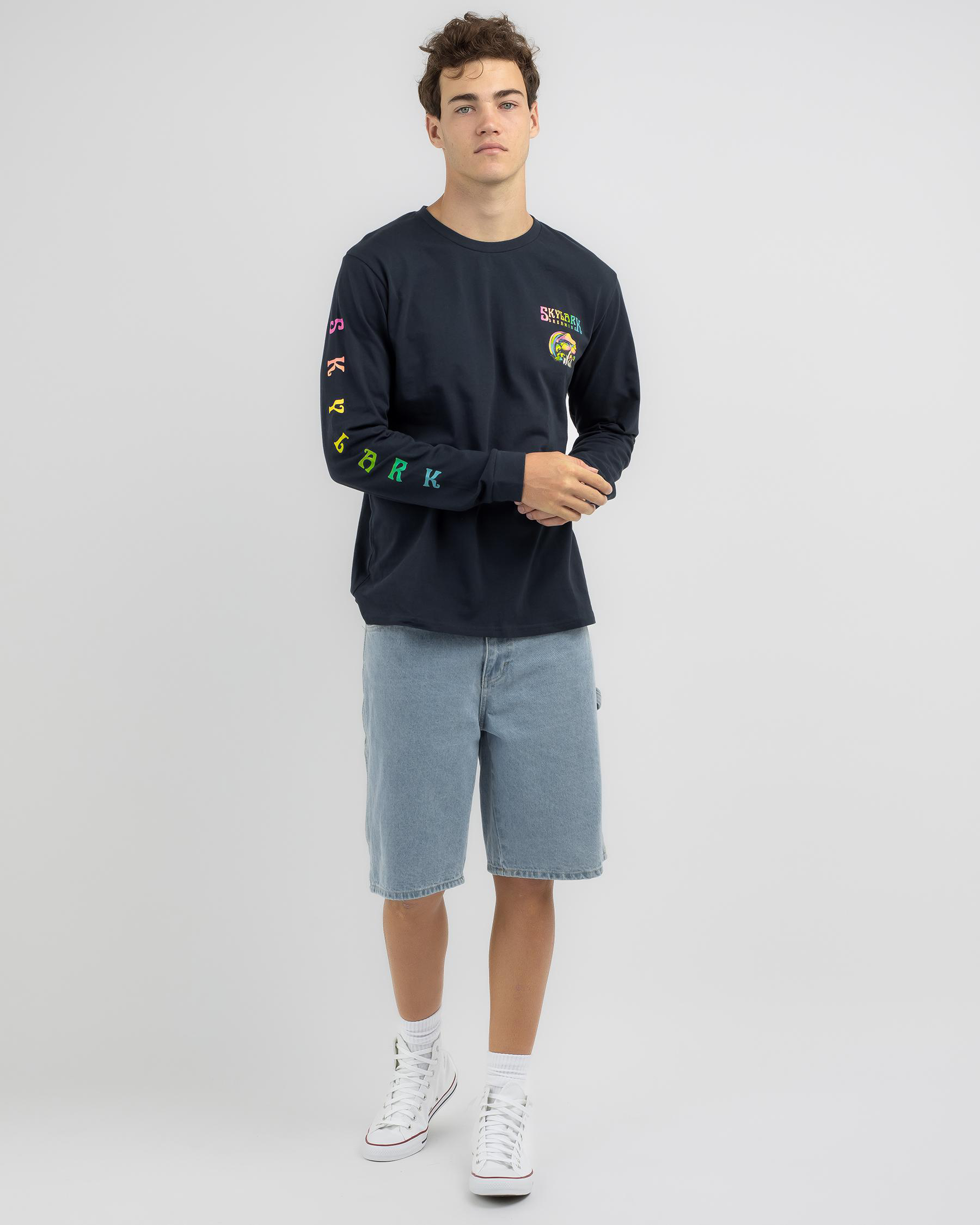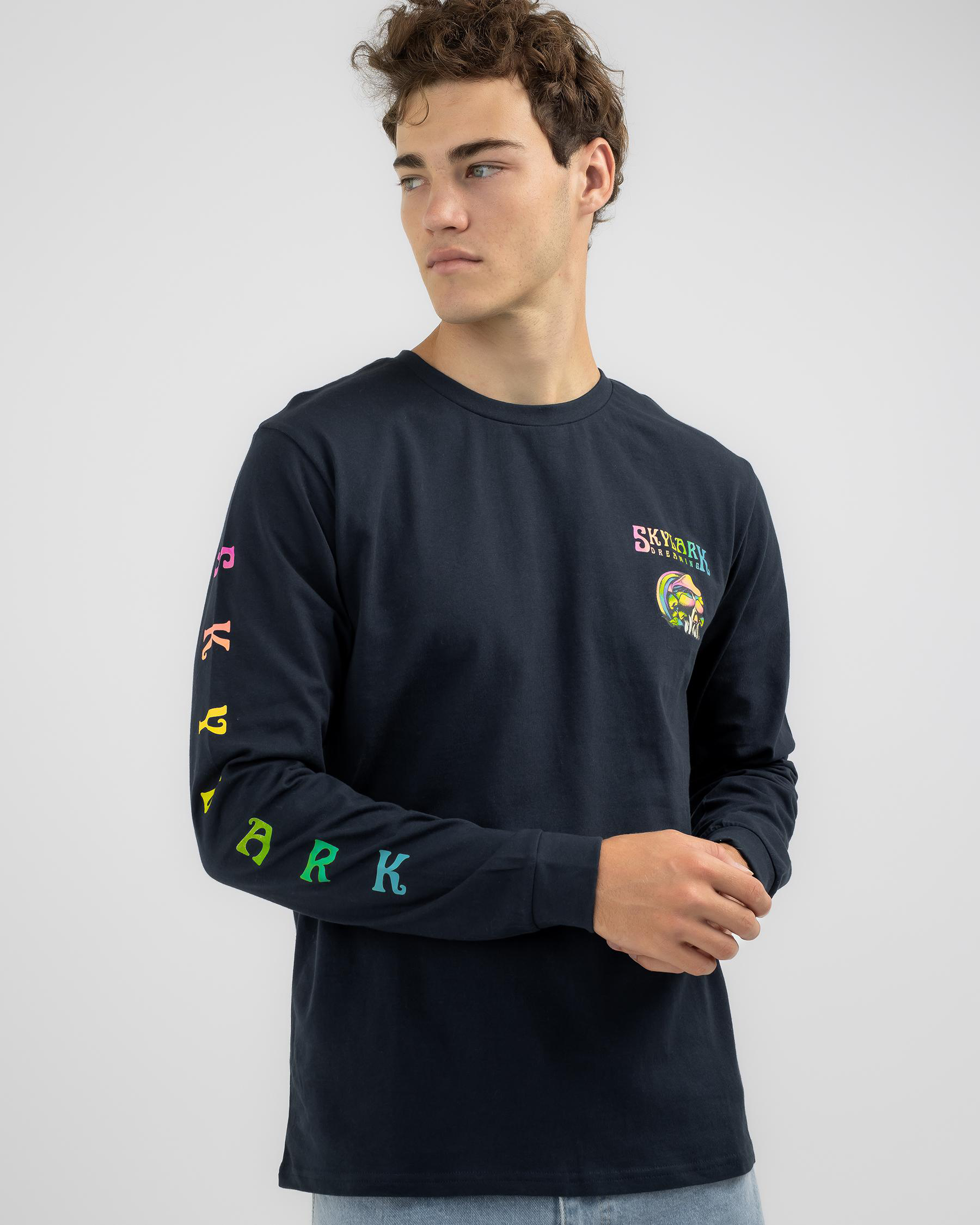 Skylark Trippy Long Sleeve T-shirt in Navy features a psychedelic design, perfect for adding a pop of colour to your wardrobe.