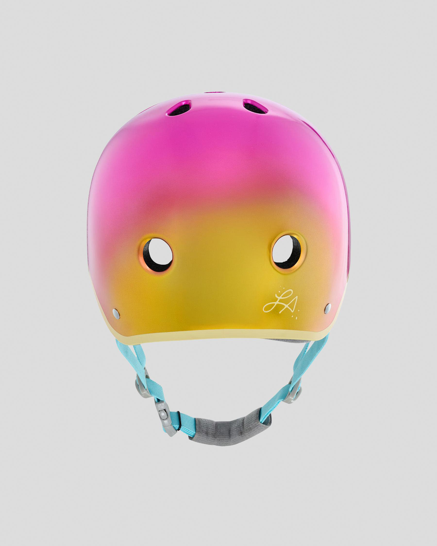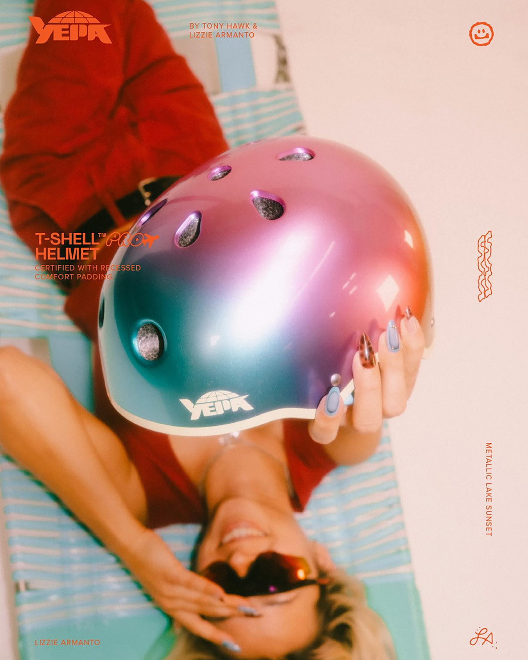 YEPA T-Shell Pro Helmet — Lizzie Metallic Lake Sunset. Metallic fade finish, low-profile deep-fit EPS, tri-density padding, CPSC + ASTM F-1492 certified. Two liner sets. Skate & bike.