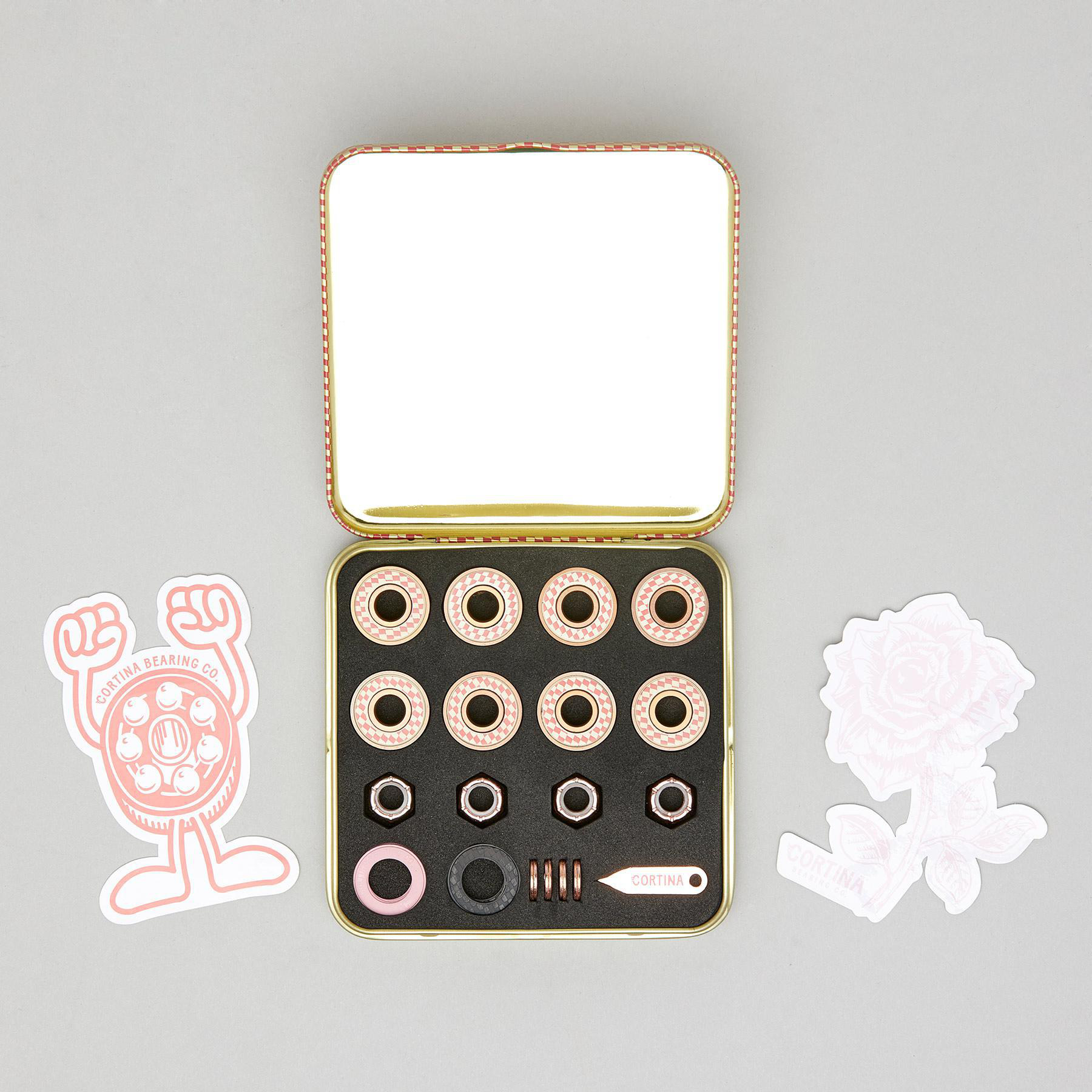 High performance skateboard bearings. Matching axle nuts & washers. Interchangeable shields. Shield popper for easy customization. Stickers included.