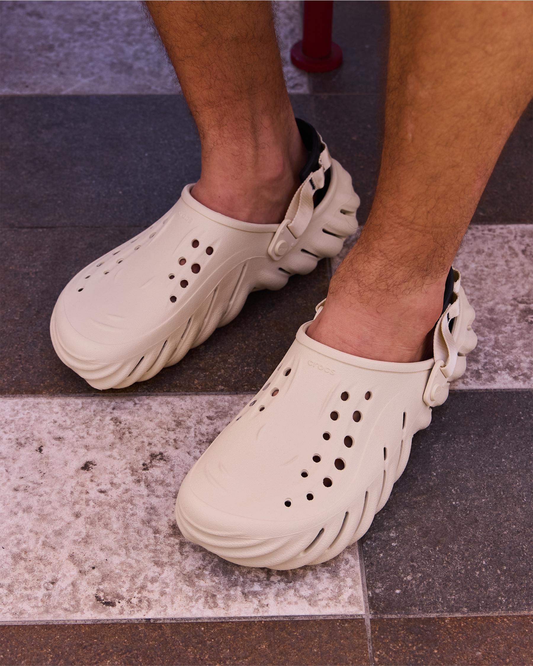 Step out in style with the Crocs Echo Clogs in bone. Featuring a sleek black accent, these clogs are perfect for adding a touch of chic to your everyday looks.