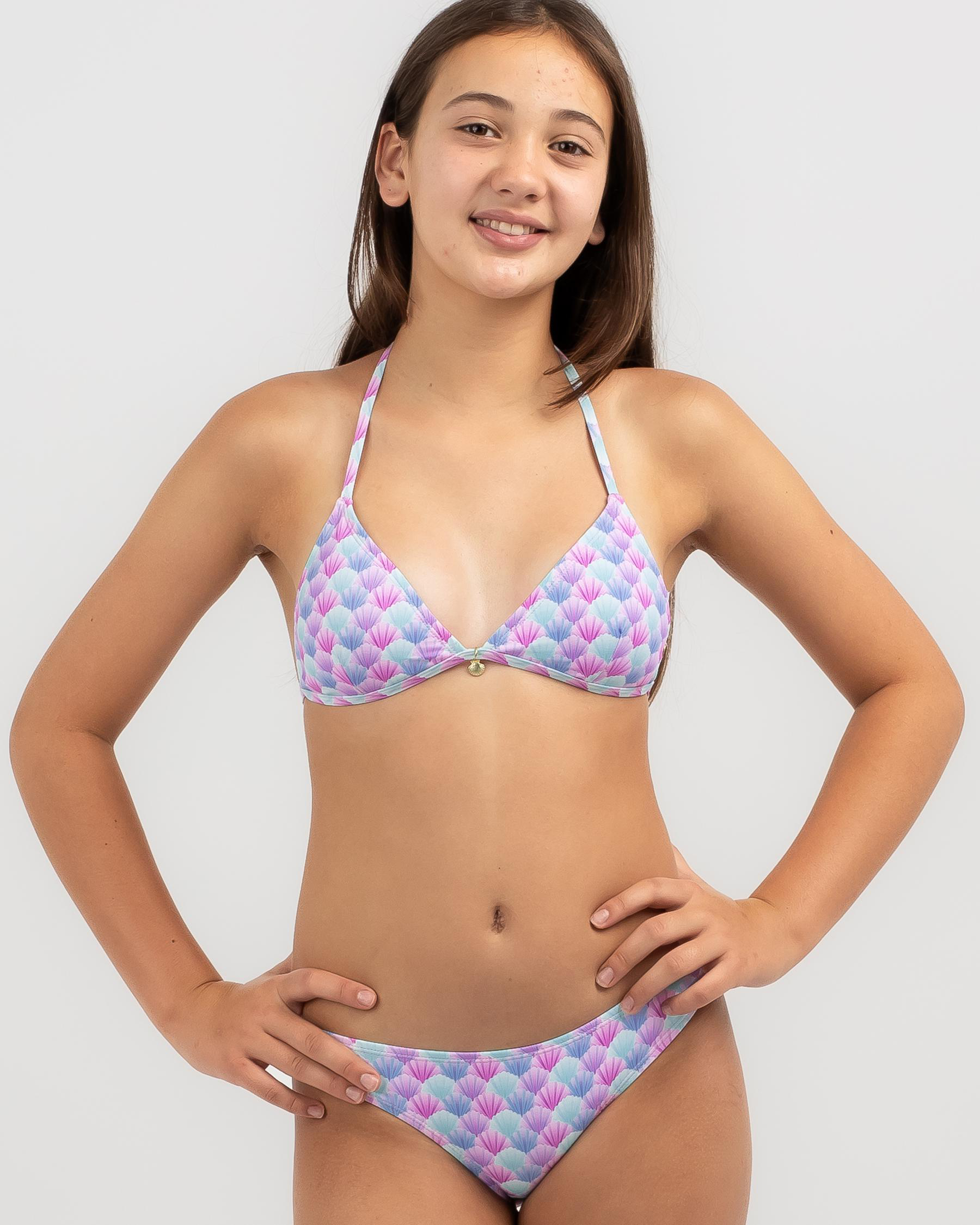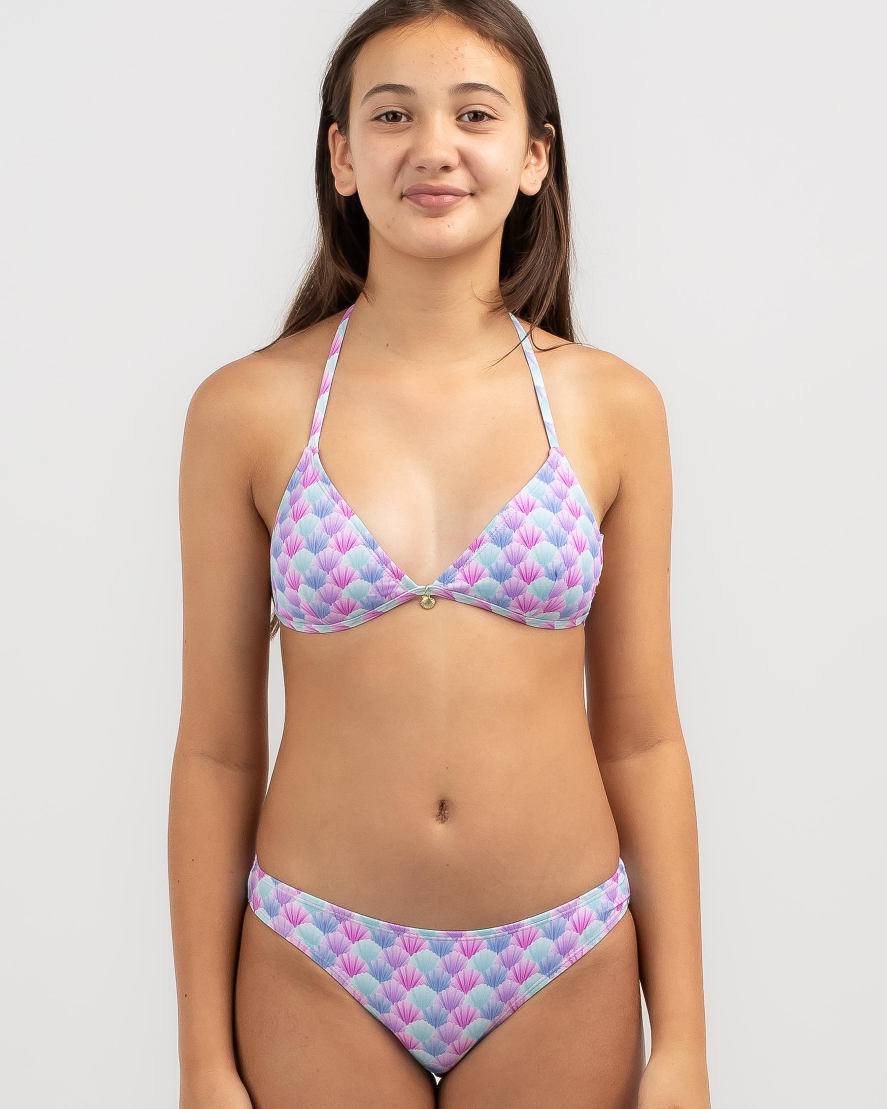 Make a splash in the Kaiami Girls' Mermaid Triangle Bikini Set in a vibrant multi-color design. Perfect for fun days at the beach.