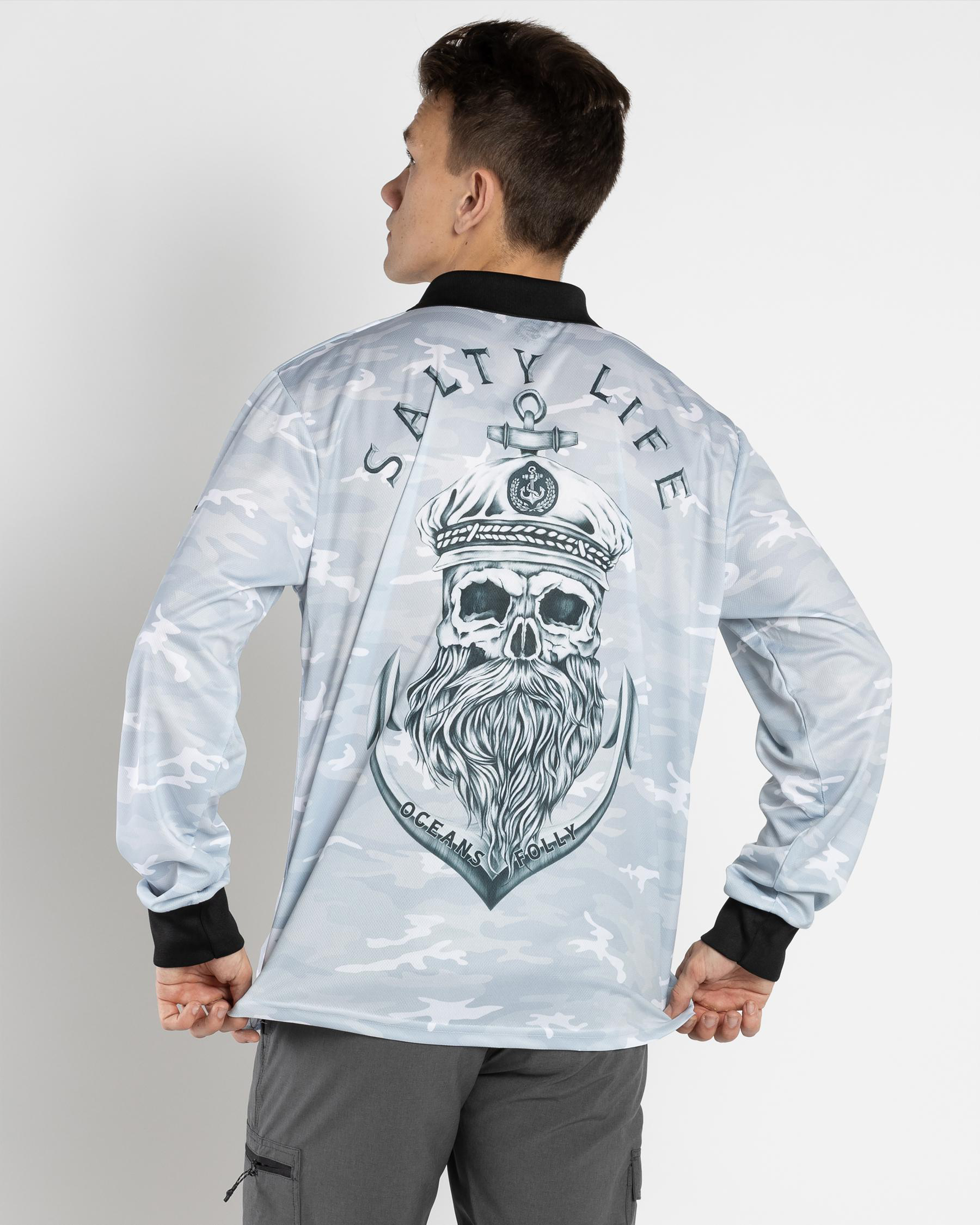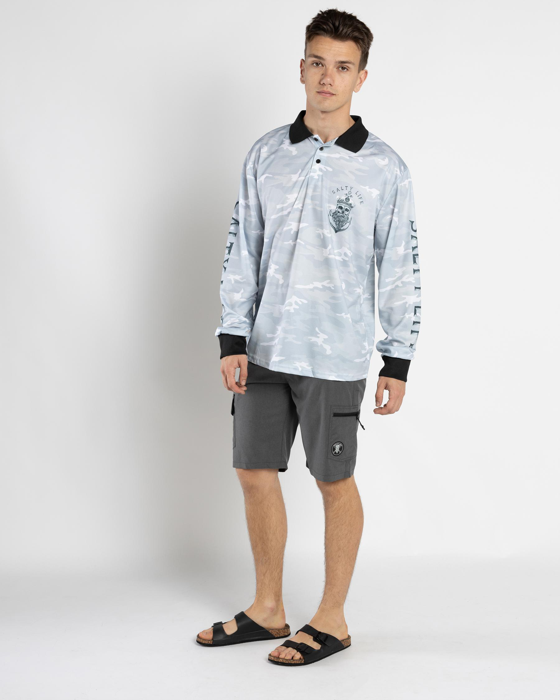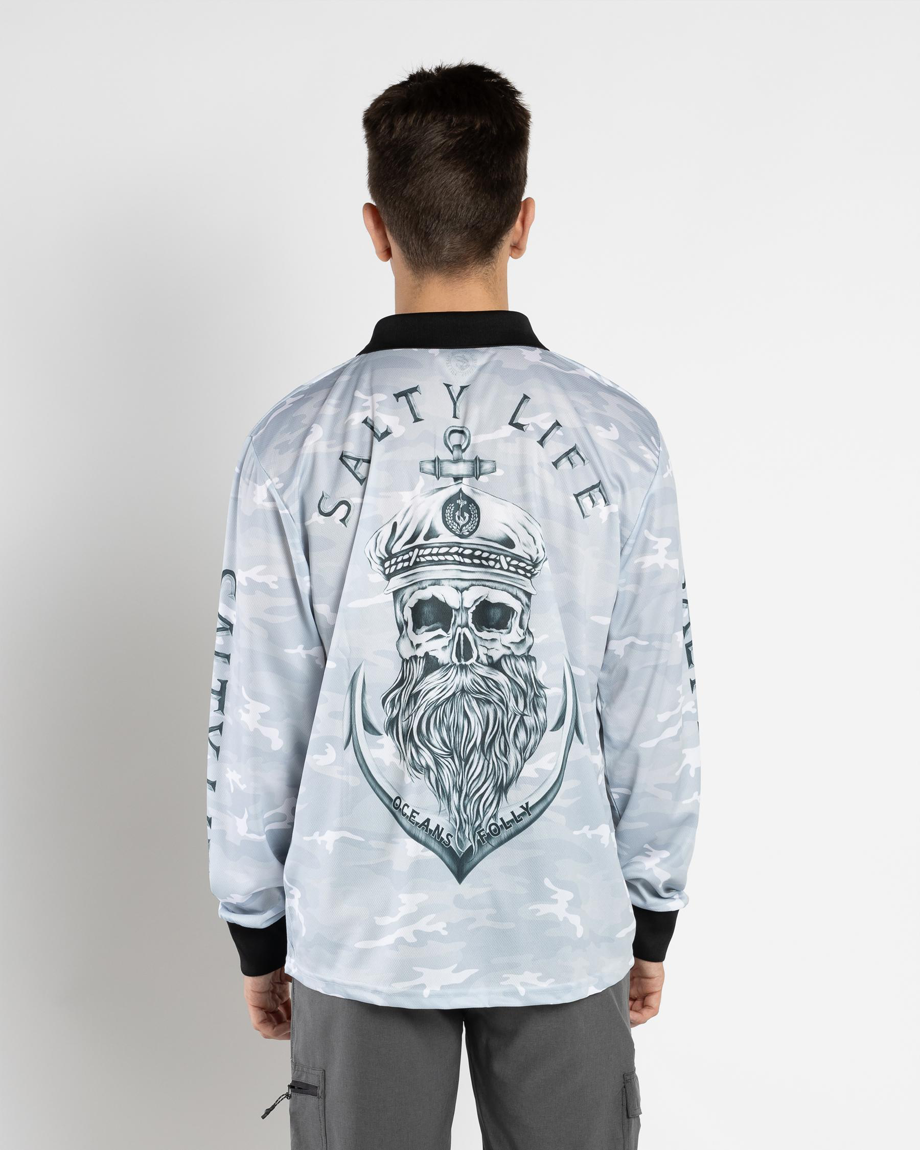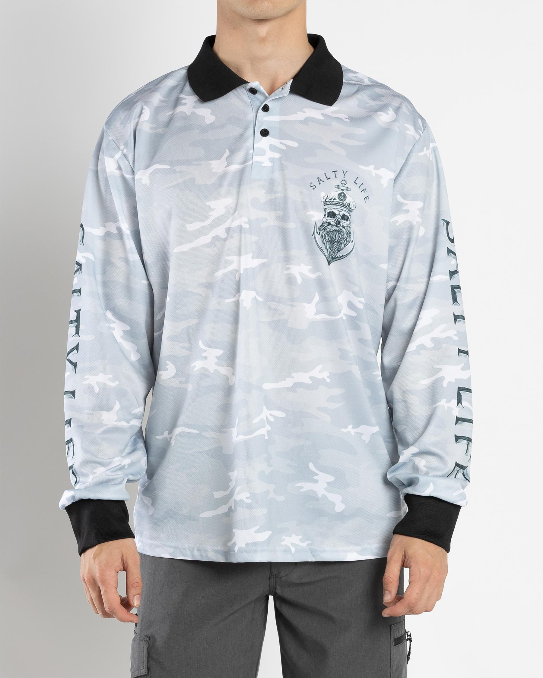 The Salty Life Anchors Fishing Shirt in Black Camo is a must-have for any fishing enthusiast. Stand out on the water with this stylish and practical shirt.